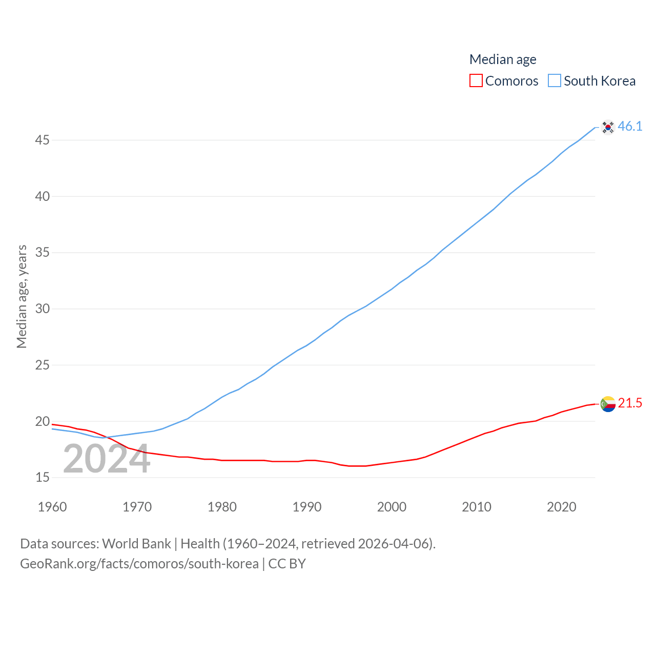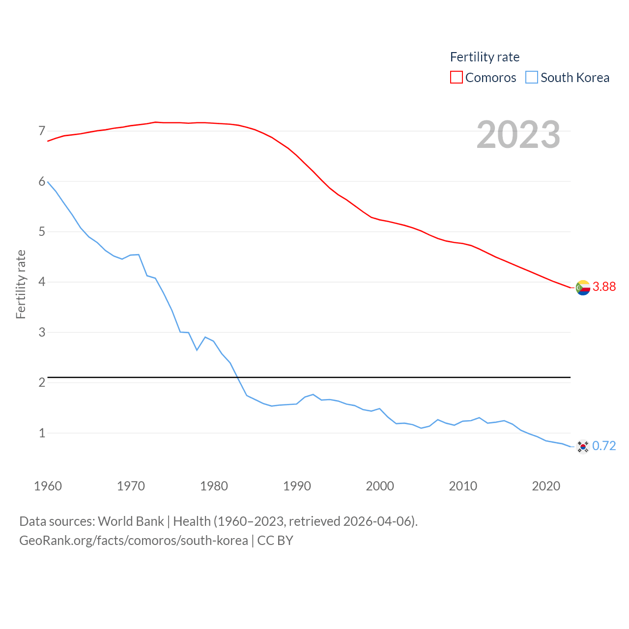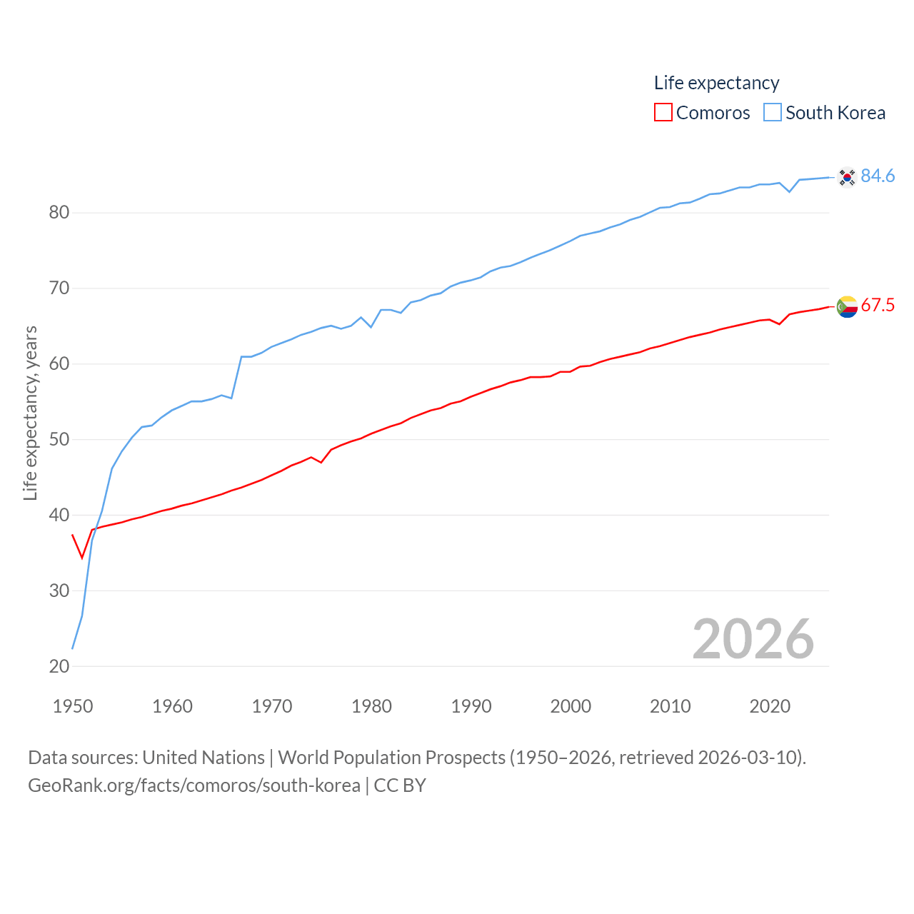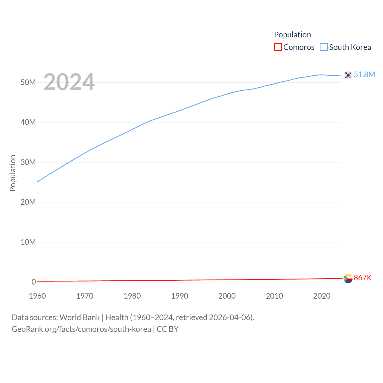 Comoros has a population of 867K (ranked 160/197), compared with 51.8M in South Korea (ranked 29/197). Comoros' land area is 719 sq mi versus 37,684 sq mi for South Korea (ranked 171st vs. 105th).