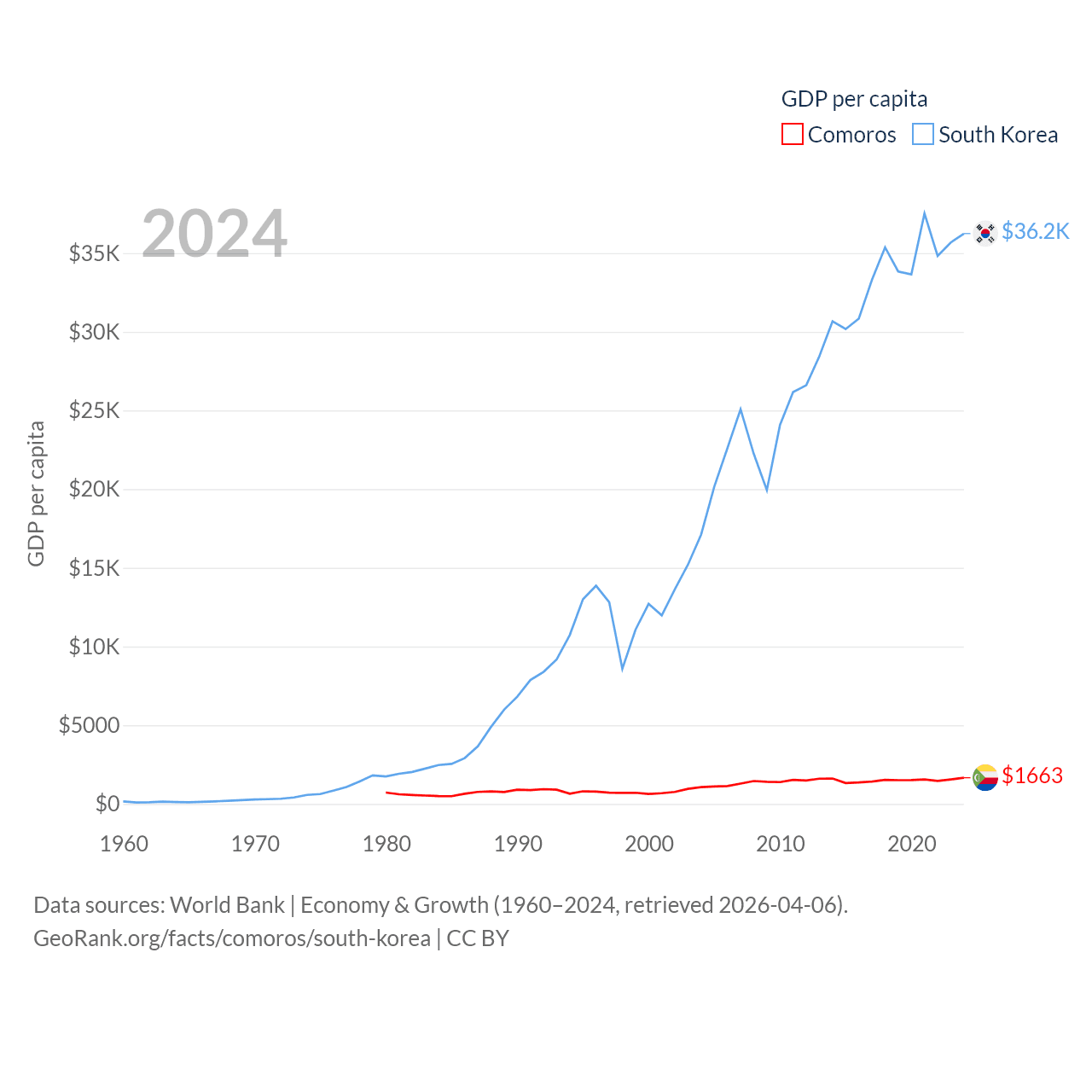 By GDP, Comoros ranks 183/197 ($1.44B) and South Korea ranks 12/197 ($1.88T). By GDP per capita, Comoros ranks 161/197 ($1,663), while South Korea ranks 31/197 ($36,239).