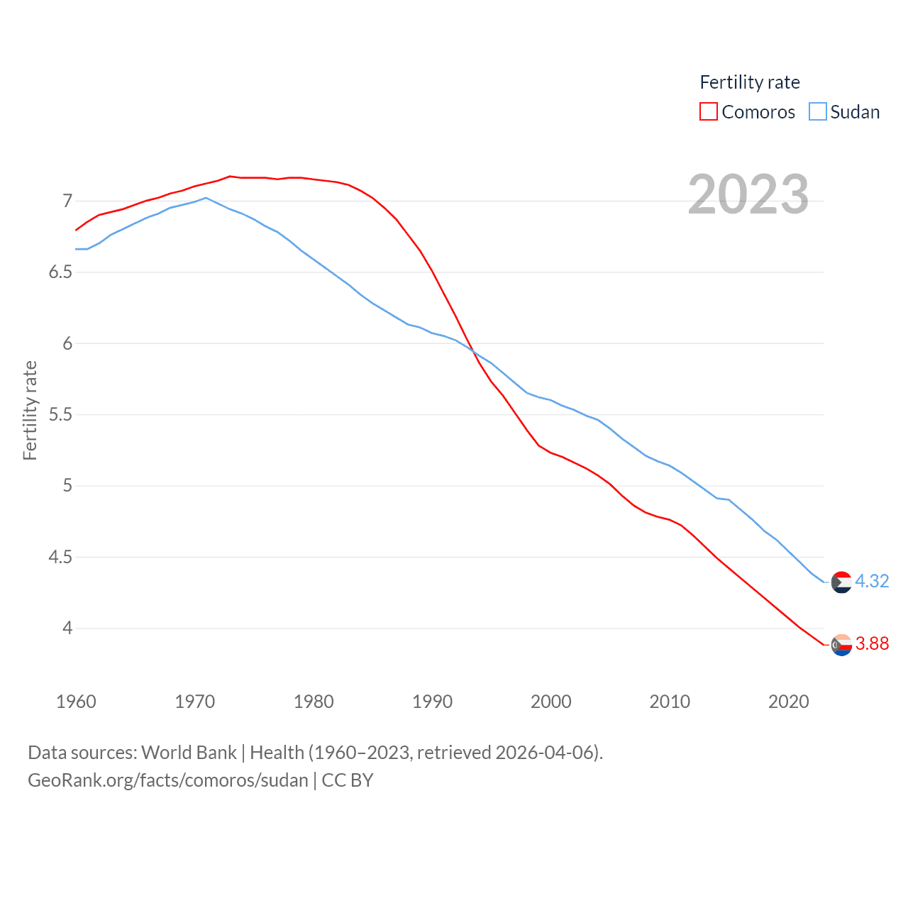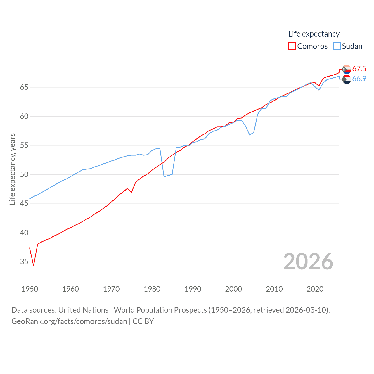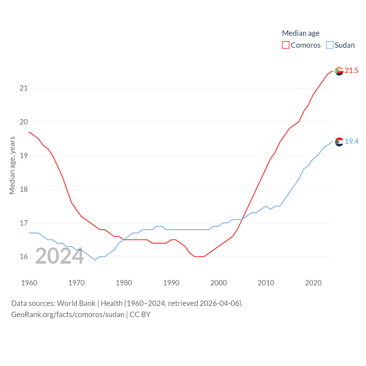 Comoros has a population of 867K (ranked 160/197), compared with 50.4M in Sudan (ranked 30/197). Comoros' land area is 719 sq mi versus 721,239 sq mi for Sudan (ranked 171st vs. 15th).