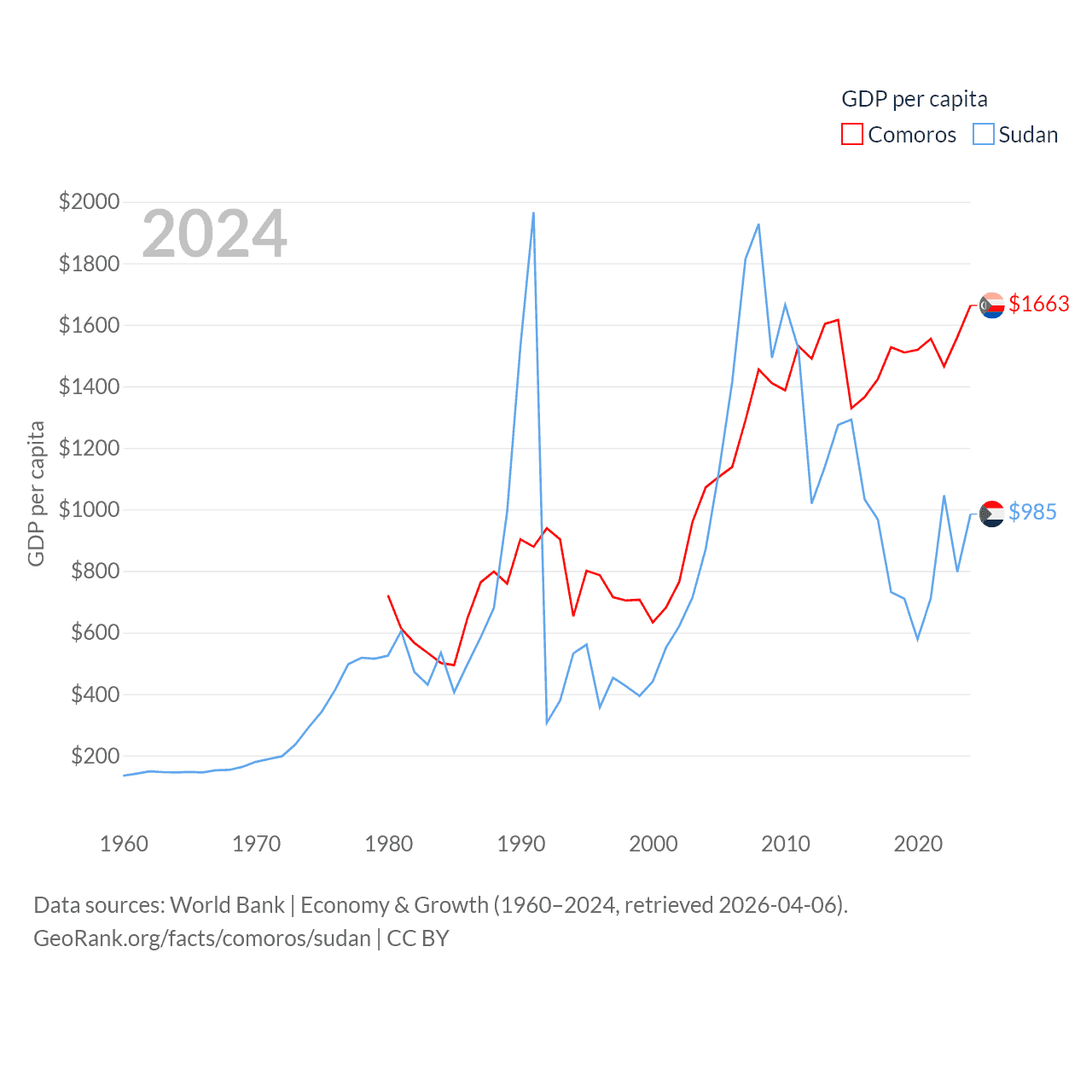 By GDP, Comoros ranks 183/197 ($1.44B) and Sudan ranks 94/197 ($49.7B). By GDP per capita, Comoros ranks 161/197 ($1,663), while Sudan ranks 179/197 ($985).