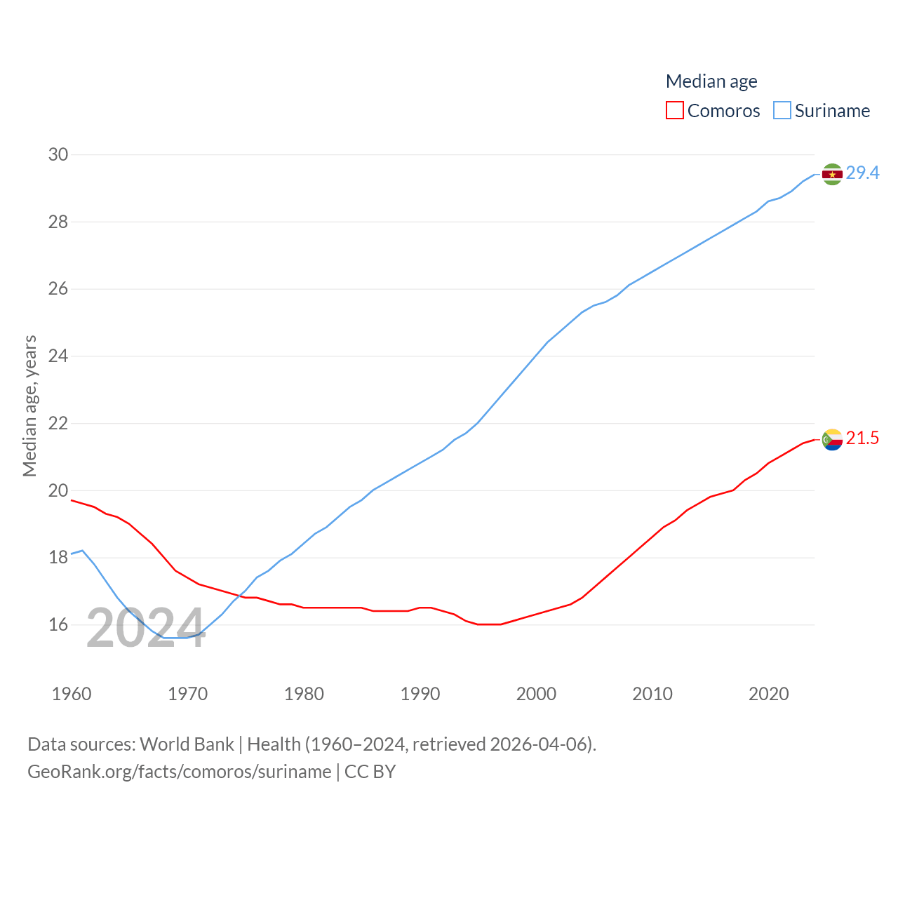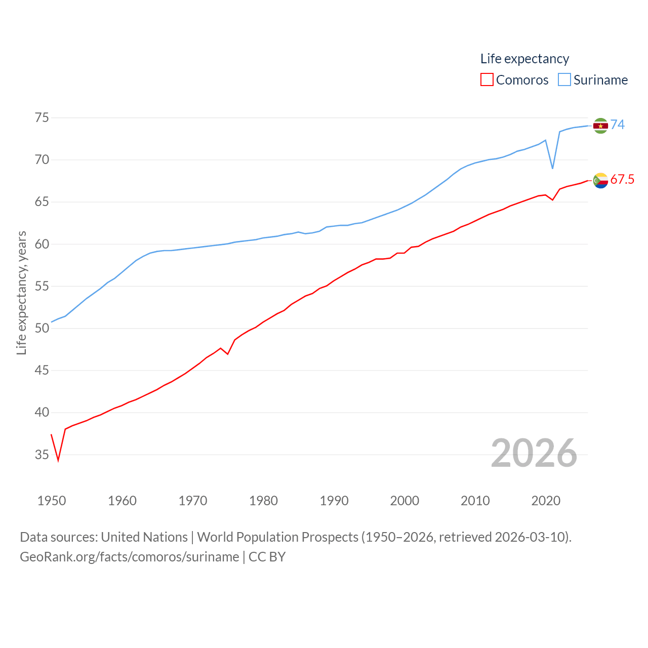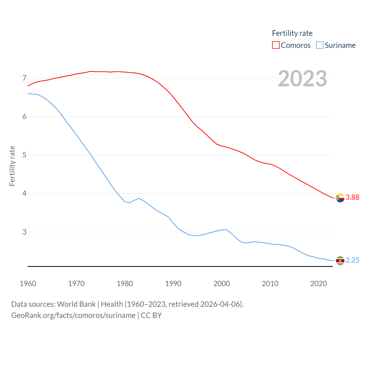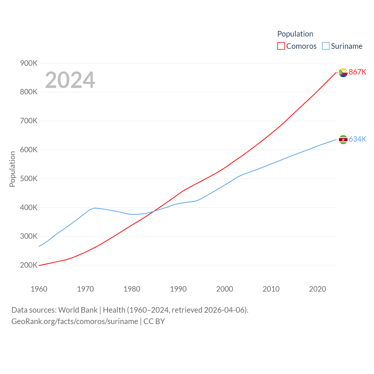 Comoros has a population of 867K (ranked 160/197), compared with 634K in Suriname (ranked 165/197). Comoros' land area is 719 sq mi versus 61,972 sq mi for Suriname (ranked 171st vs. 90th).