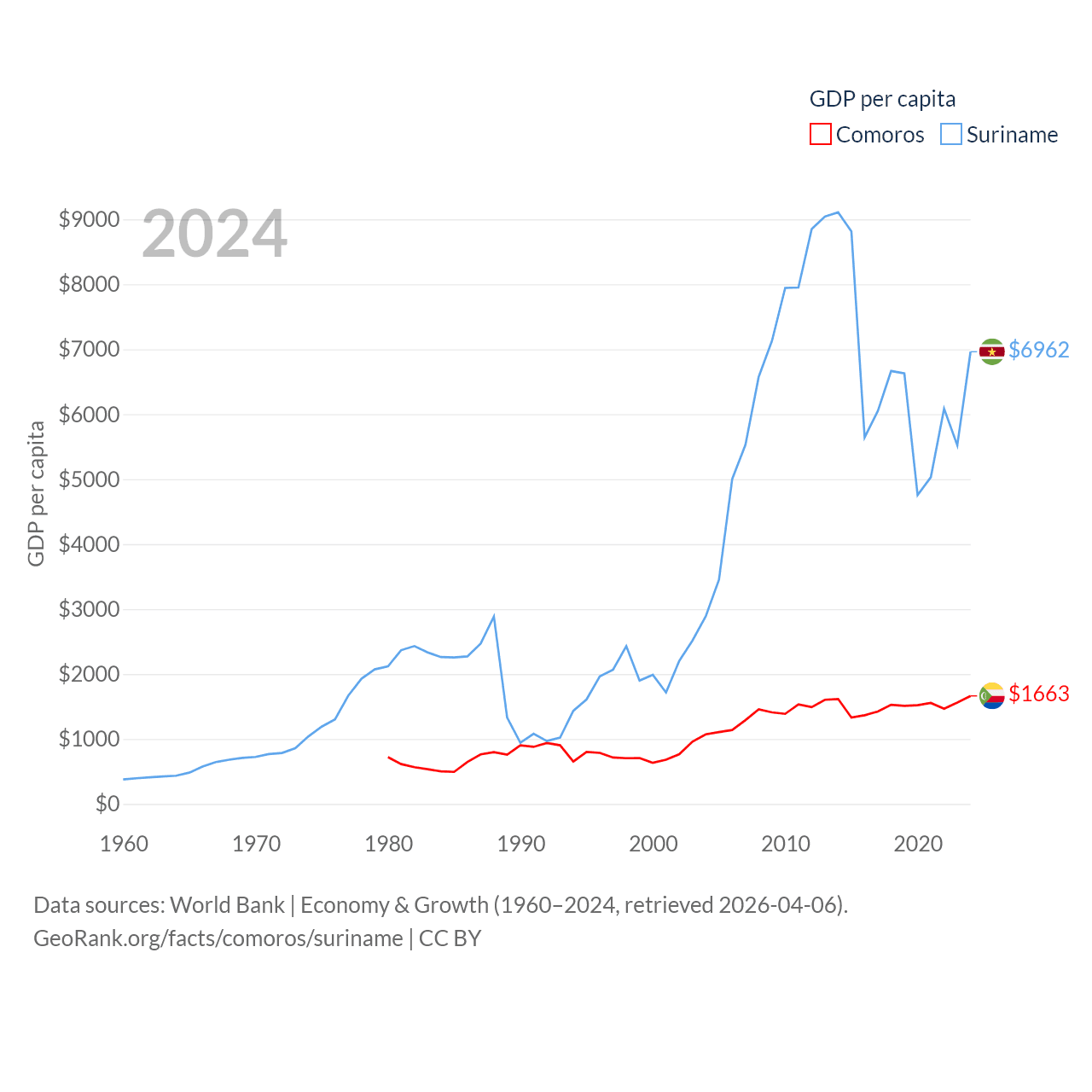 By GDP, Comoros ranks 183/197 ($1.44B) and Suriname ranks 164/197 ($4.42B). By GDP per capita, Comoros ranks 161/197 ($1,663), while Suriname ranks 102/197 ($6,962).