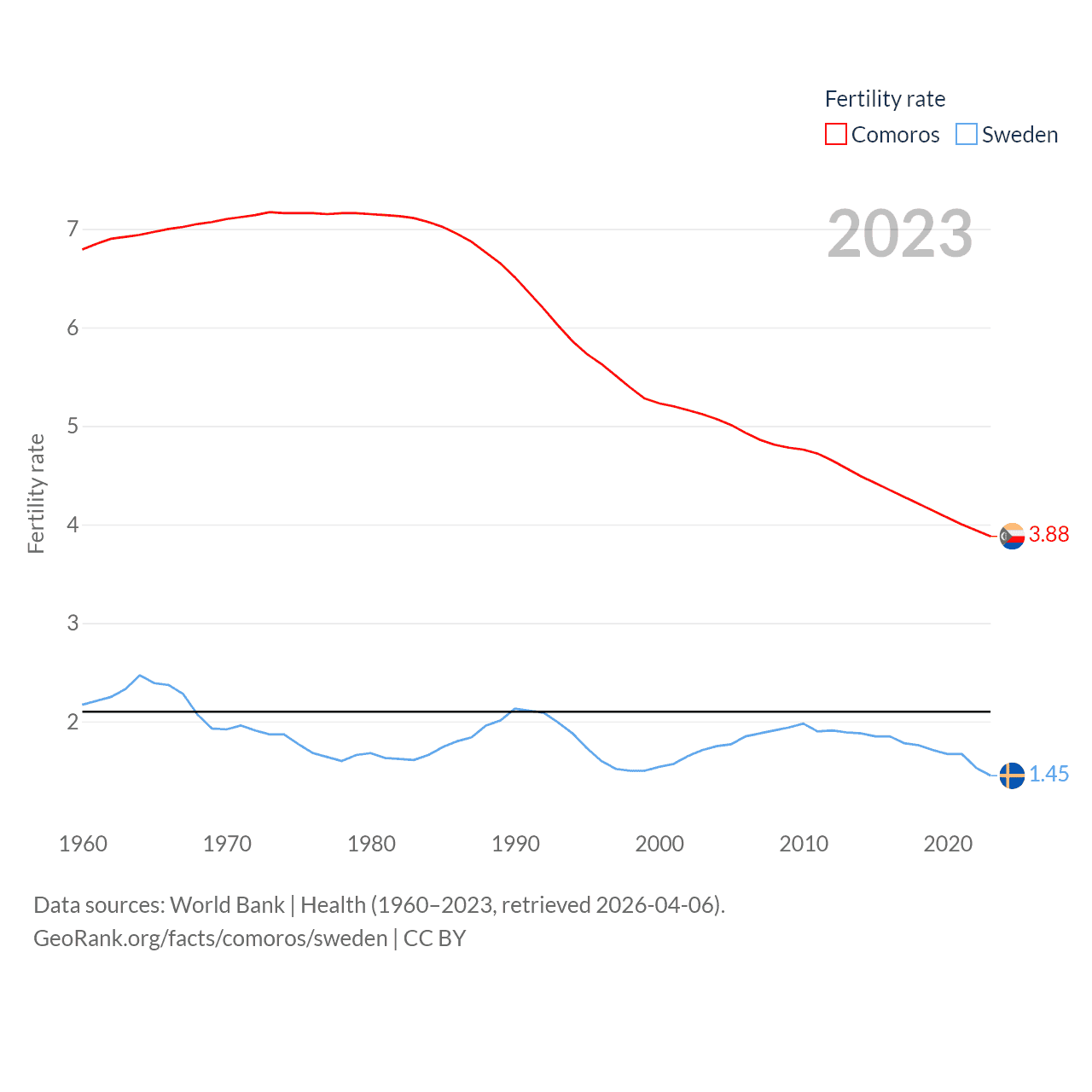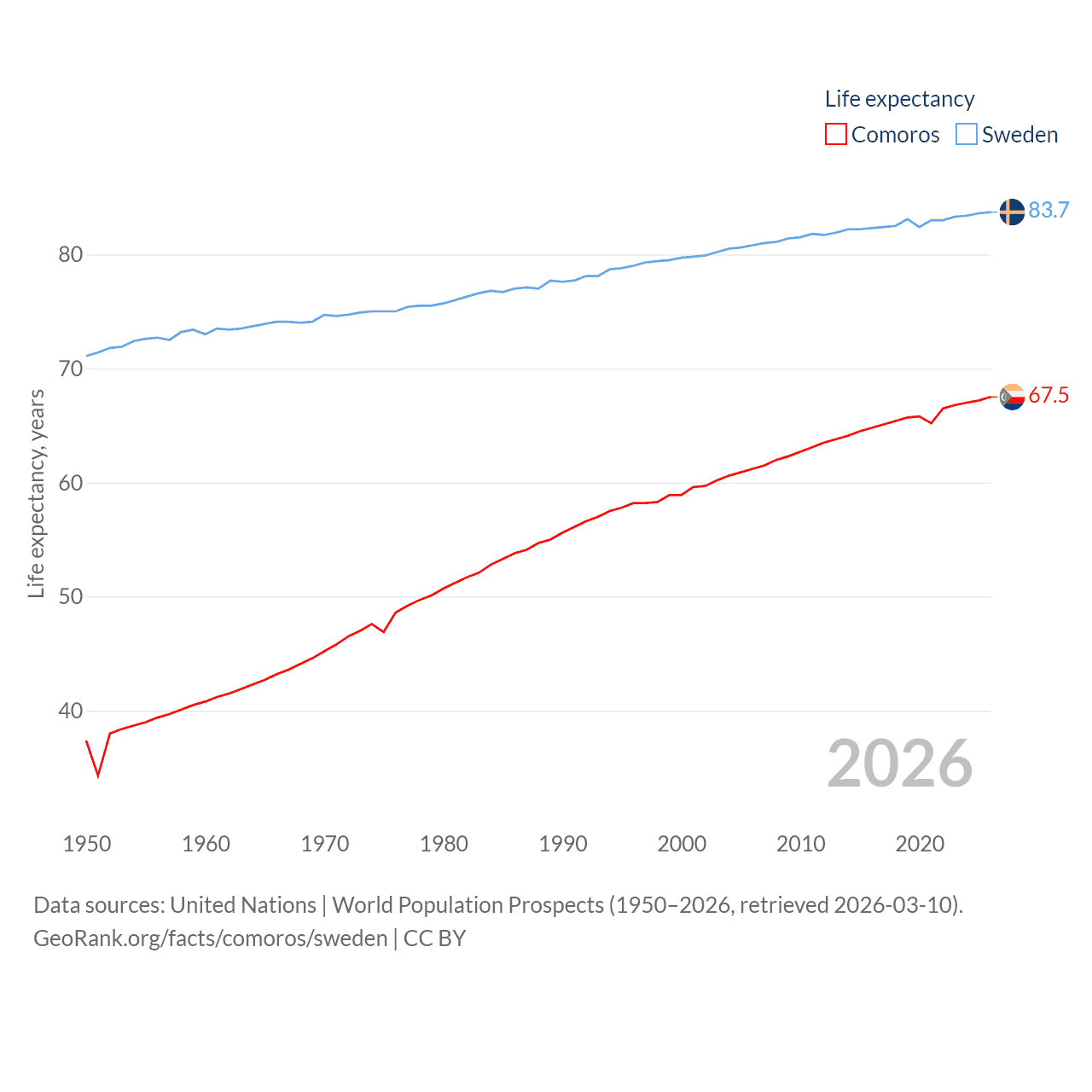 Comoros has a population of 867K (ranked 160/197), compared with 10.6M in Sweden (ranked 93/197). Comoros' land area is 719 sq mi versus 157,248 sq mi for Sweden (ranked 171st vs. 58th).