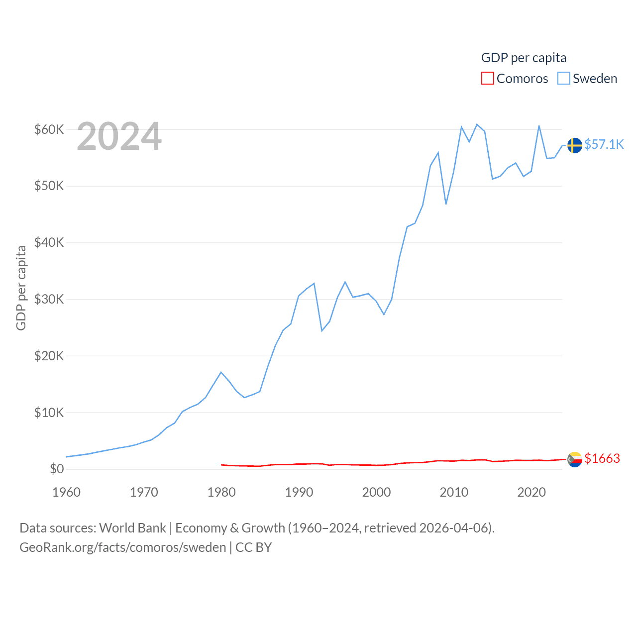 By GDP, Comoros ranks 183/197 ($1.44B) and Sweden ranks 26/197 ($604B). By GDP per capita, Comoros ranks 161/197 ($1,663), while Sweden ranks 17/197 ($57,117).
