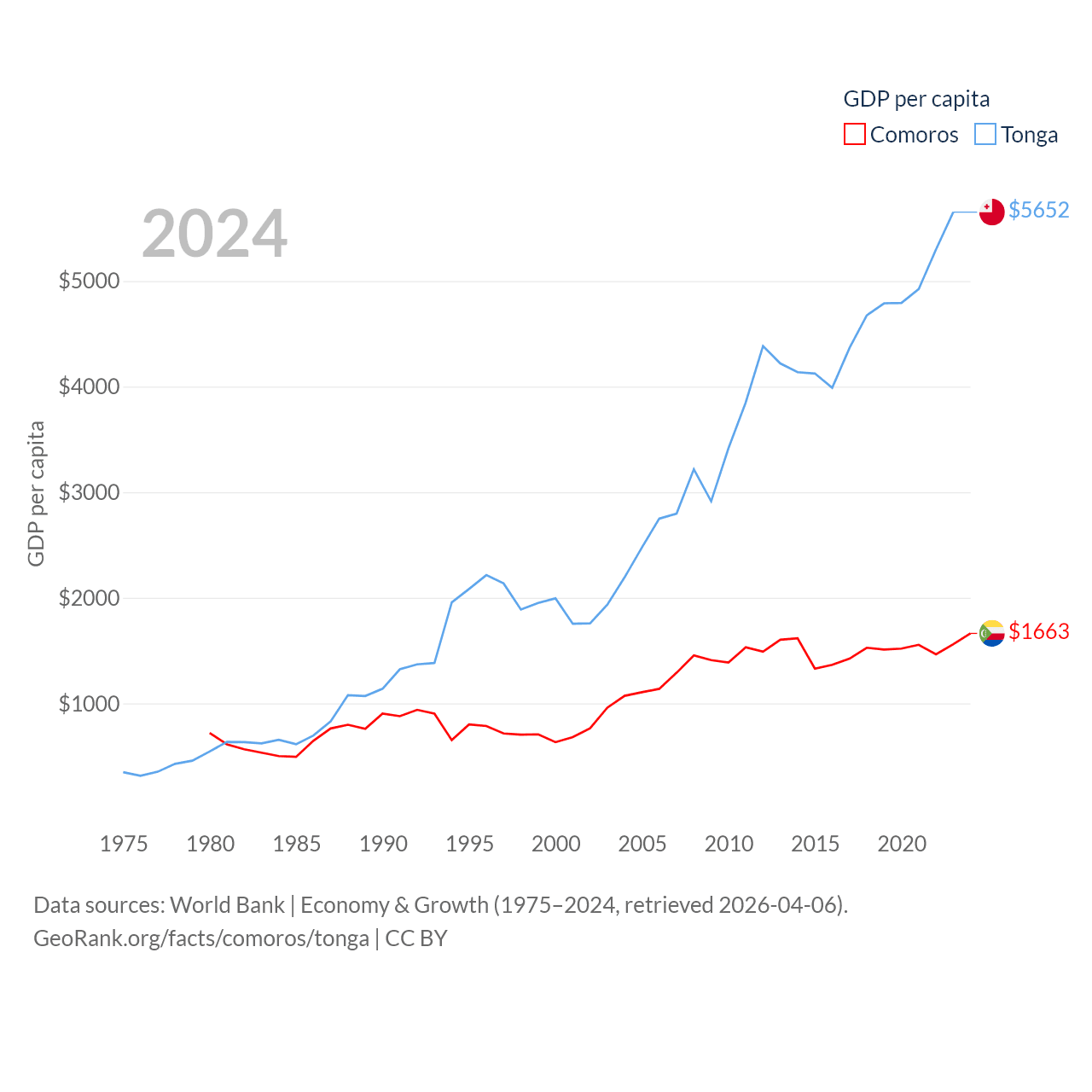 By GDP, Comoros ranks 183/197 ($1.44B) and Tonga ranks 191/197 ($591M). By GDP per capita, Comoros ranks 161/197 ($1,663), while Tonga ranks 115/197 ($5,652).
