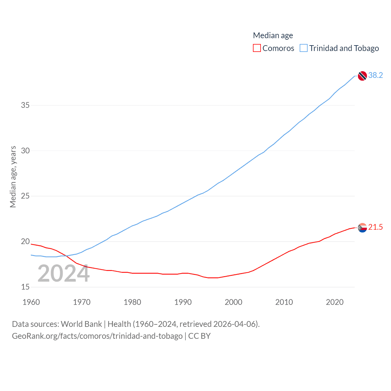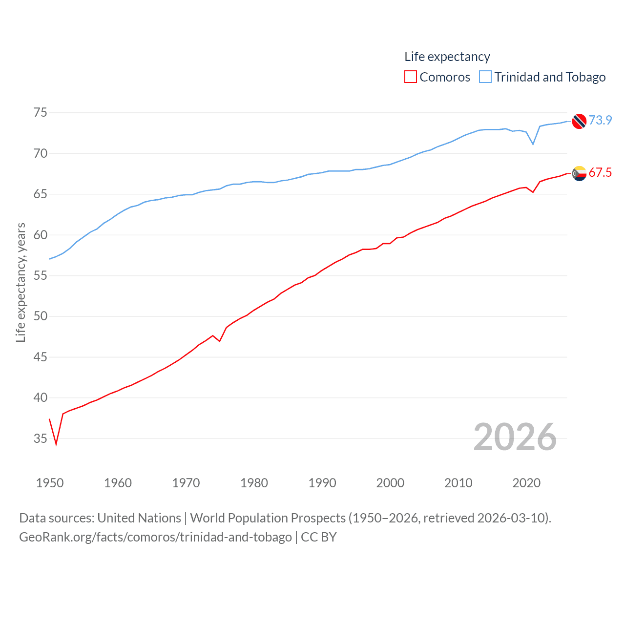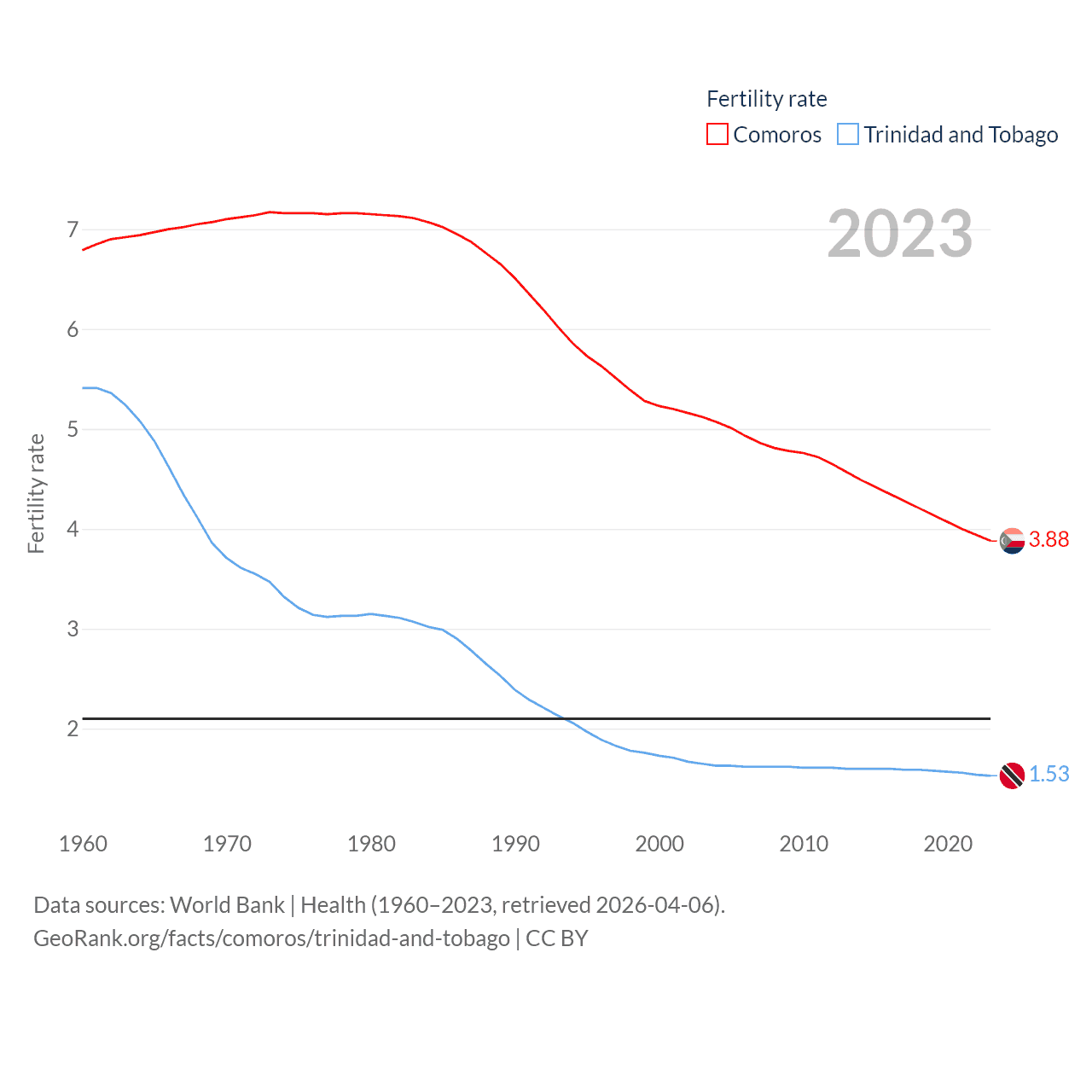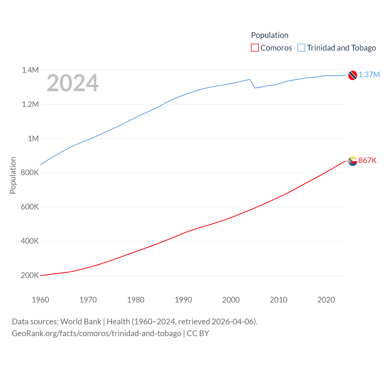 Comoros has a population of 867K (ranked 160/197), compared with 1.37M in Trinidad and Tobago (ranked 154/197). Comoros' land area is 719 sq mi versus 1,981 sq mi for Trinidad and Tobago (ranked 171st vs. 166th).