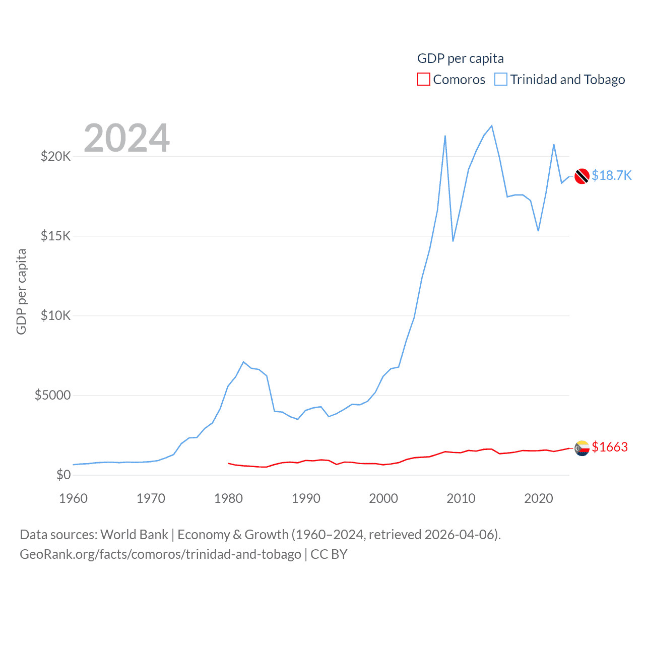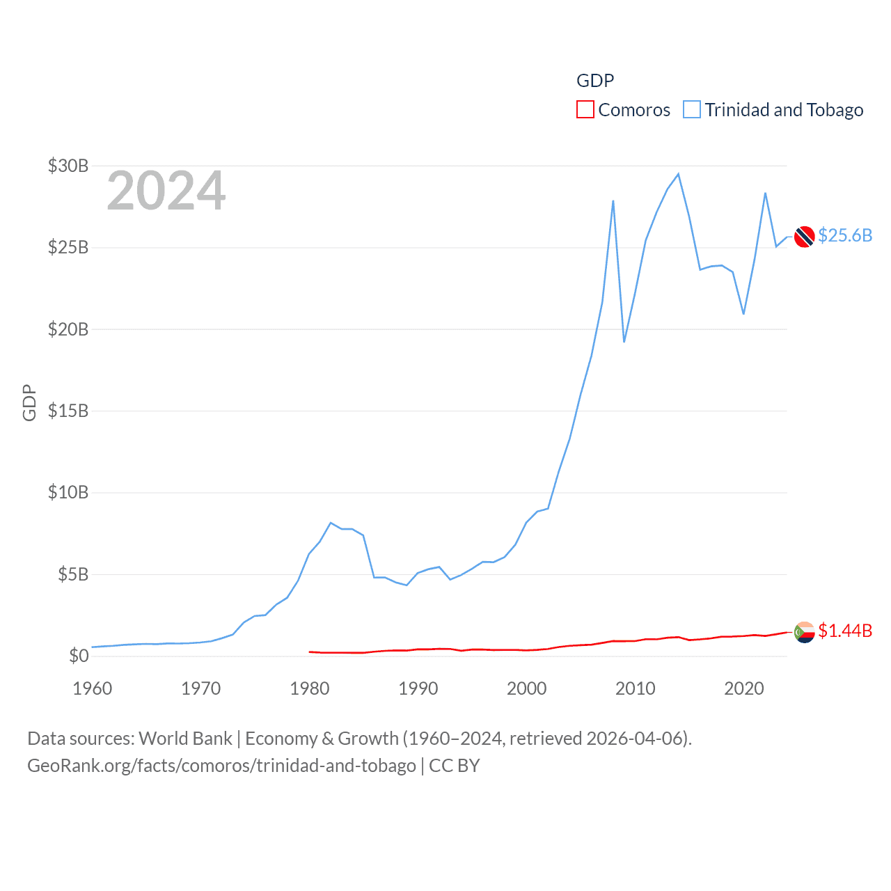 By GDP, Comoros ranks 183/197 ($1.44B) and Trinidad and Tobago ranks 115/197 ($25.6B). By GDP per capita, Comoros ranks 161/197 ($1,663), while Trinidad and Tobago ranks 61/197 ($18,733).