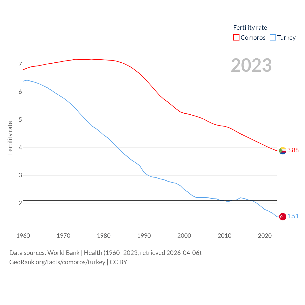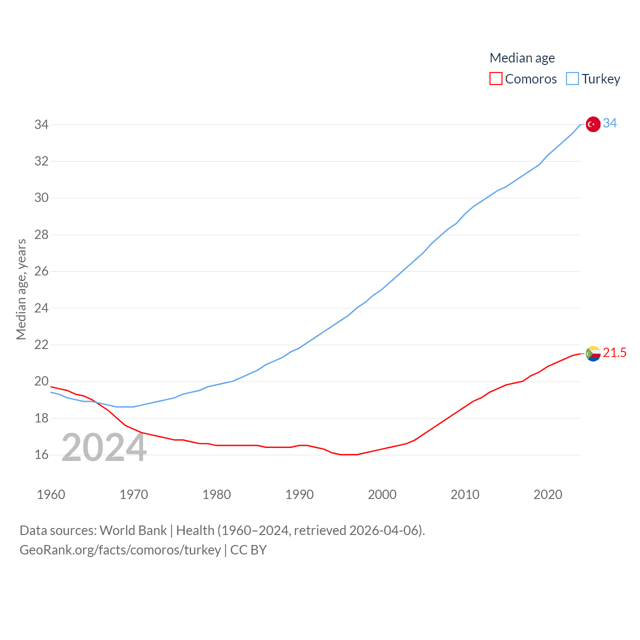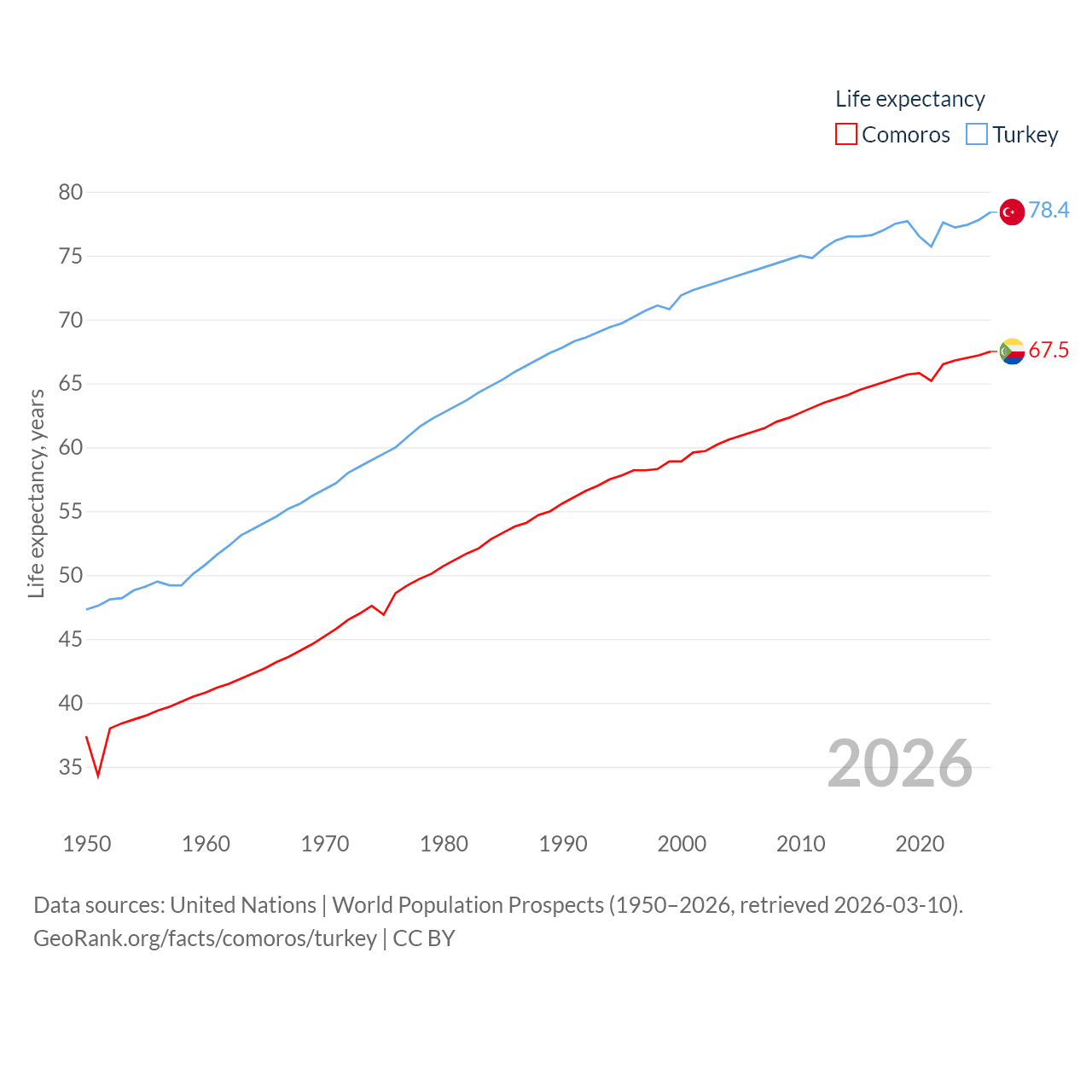Comoros has a population of 867K (ranked 160/197), compared with 85.5M in Turkey (ranked 18/197). Comoros' land area is 719 sq mi versus 297,156 sq mi for Turkey (ranked 171st vs. 36th).