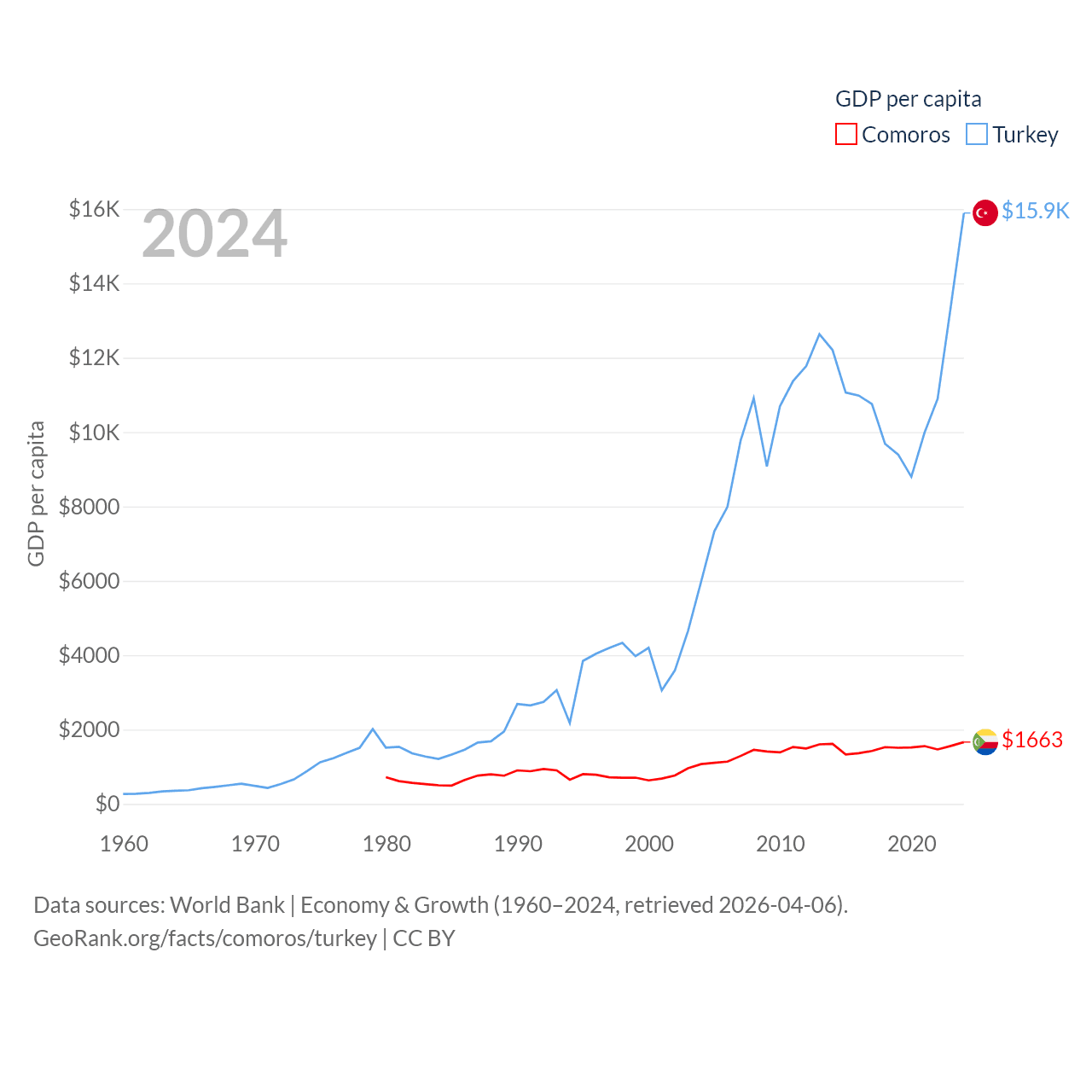 By GDP, Comoros ranks 183/197 ($1.44B) and Turkey ranks 17/197 ($1.36T). By GDP per capita, Comoros ranks 161/197 ($1,663), while Turkey ranks 66/197 ($15,893).