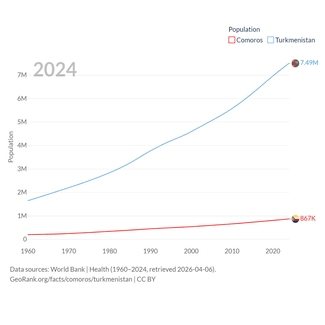 Comoros has a population of 867K (ranked 160/197), compared with 7.49M in Turkmenistan (ranked 104/197). Comoros' land area is 719 sq mi versus 181,441 sq mi for Turkmenistan (ranked 171st vs. 53rd).