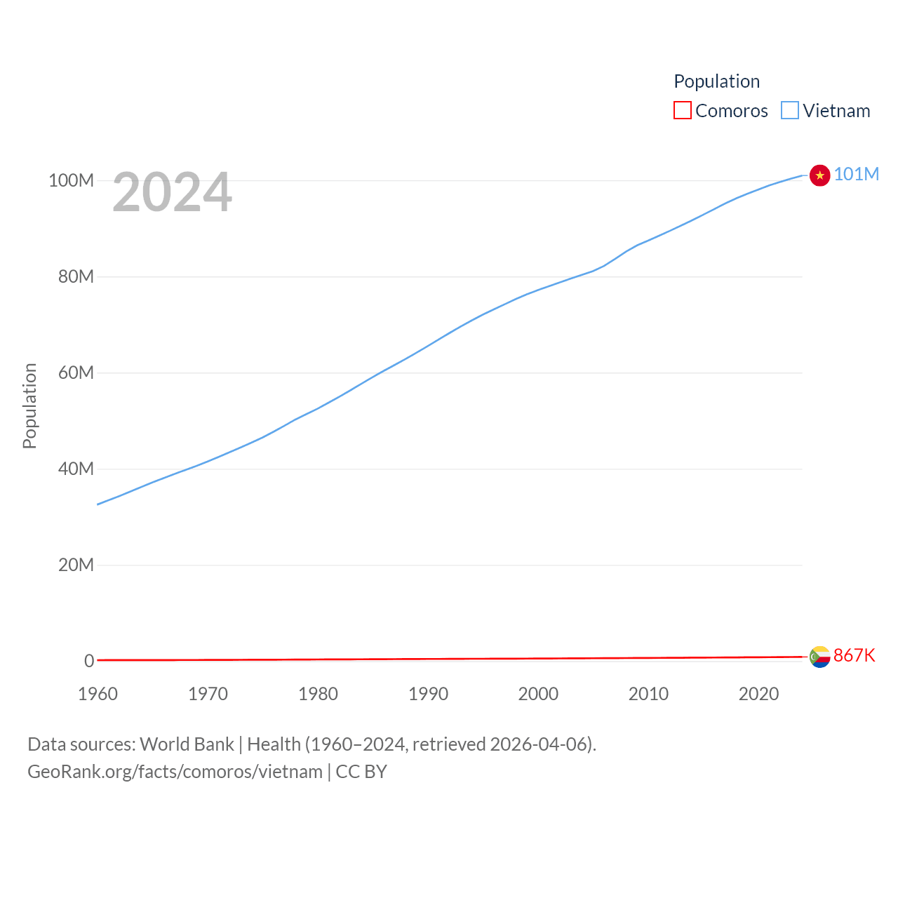 Comoros has a population of 867K (ranked 160/197), compared with 101M in Vietnam (ranked 16/197). Comoros' land area is 719 sq mi versus 121,016 sq mi for Vietnam (ranked 171st vs. 67th).
