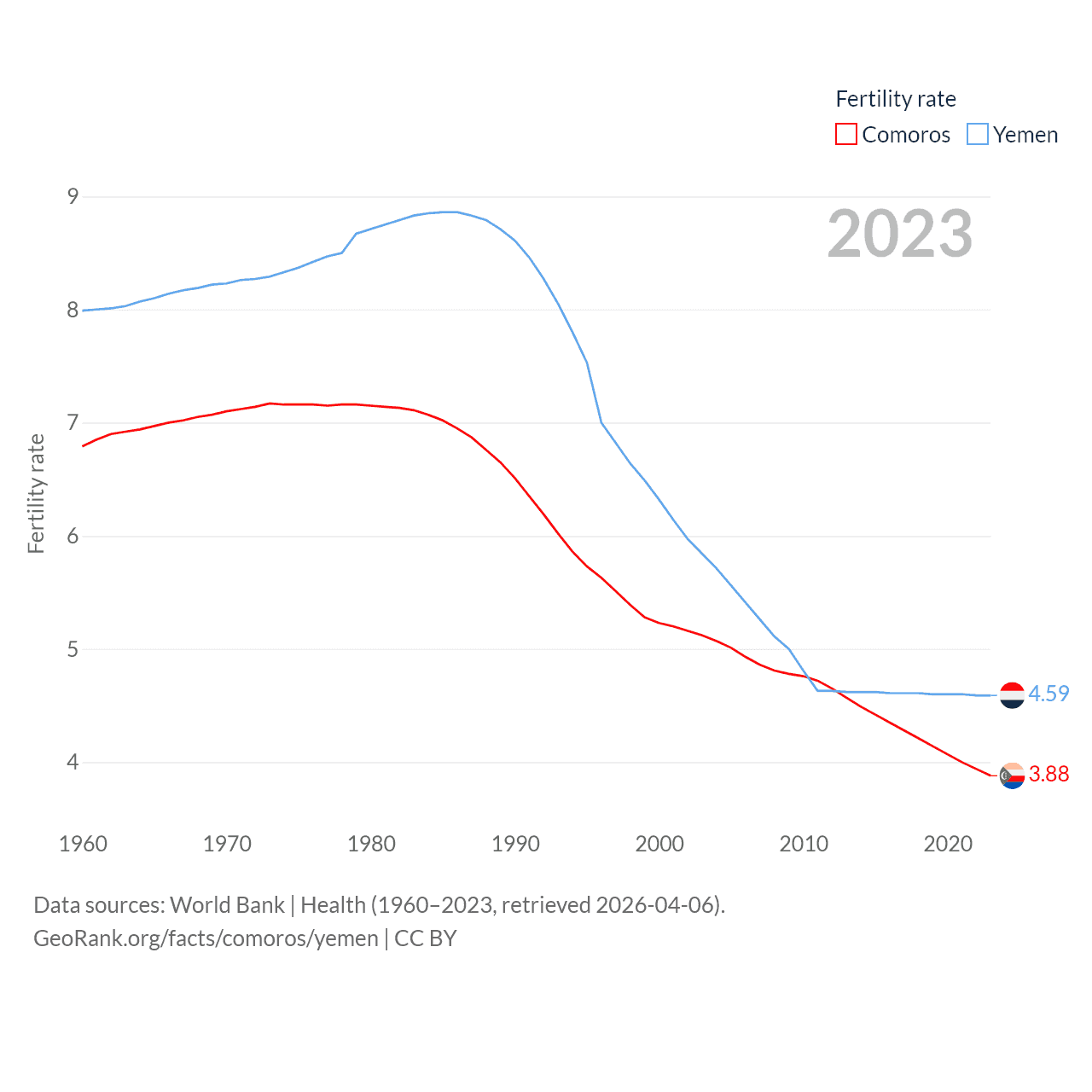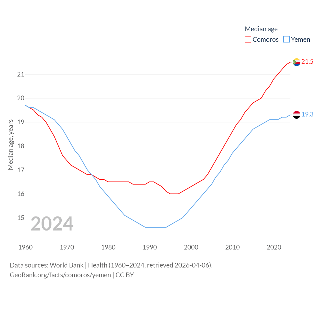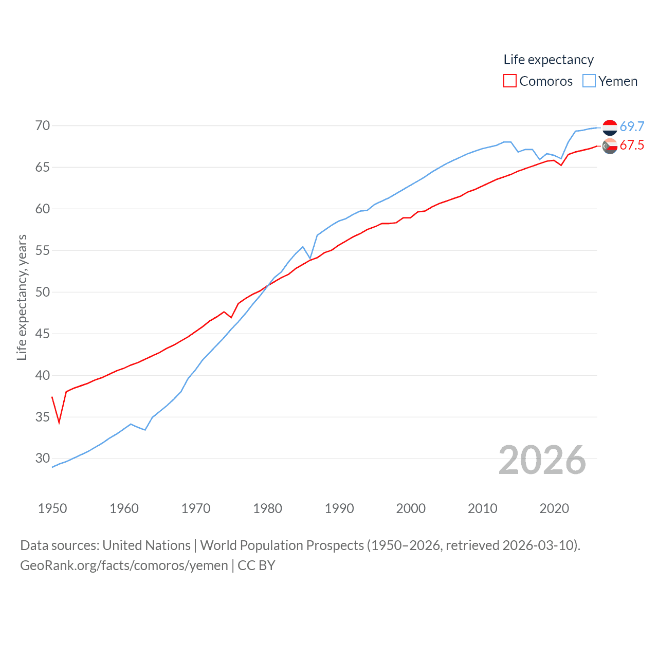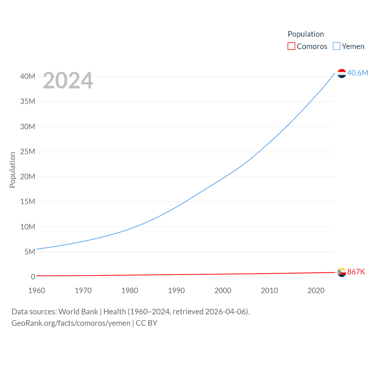 Comoros has a population of 867K (ranked 160/197), compared with 40.6M in Yemen (ranked 38/197). Comoros' land area is 719 sq mi versus 203,850 sq mi for Yemen (ranked 171st vs. 49th).