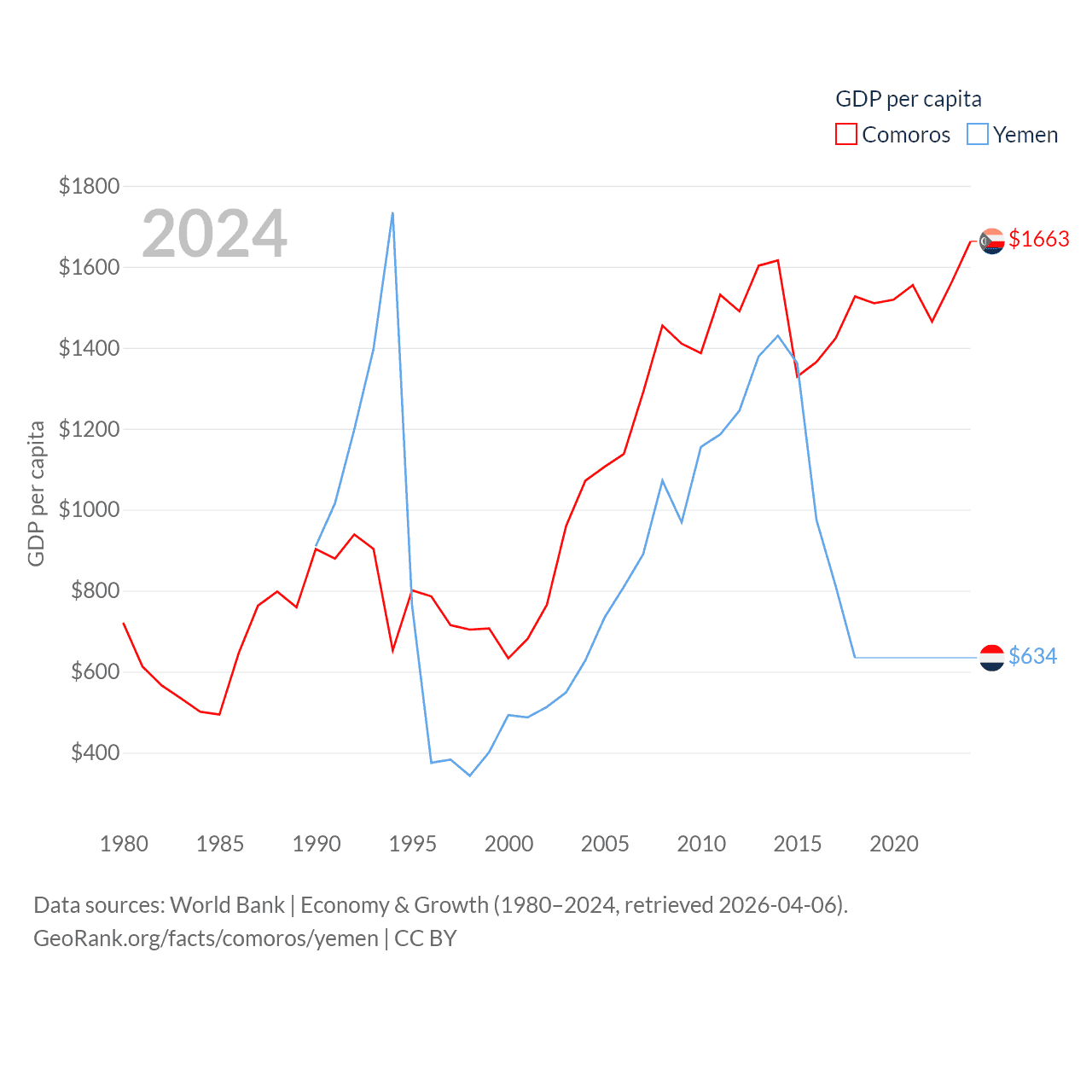 By GDP, Comoros ranks 183/197 ($1.44B) and Yemen ranks 125/197 ($21.6B). By GDP per capita, Comoros ranks 161/197 ($1,663), while Yemen ranks 191/197 ($634).