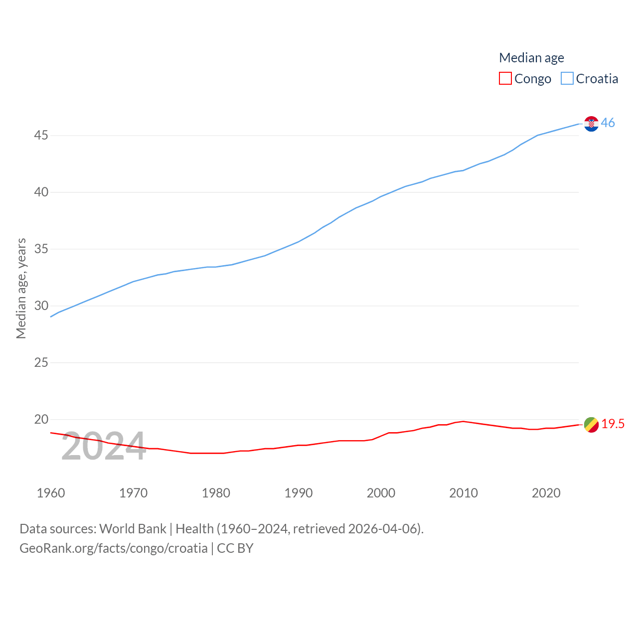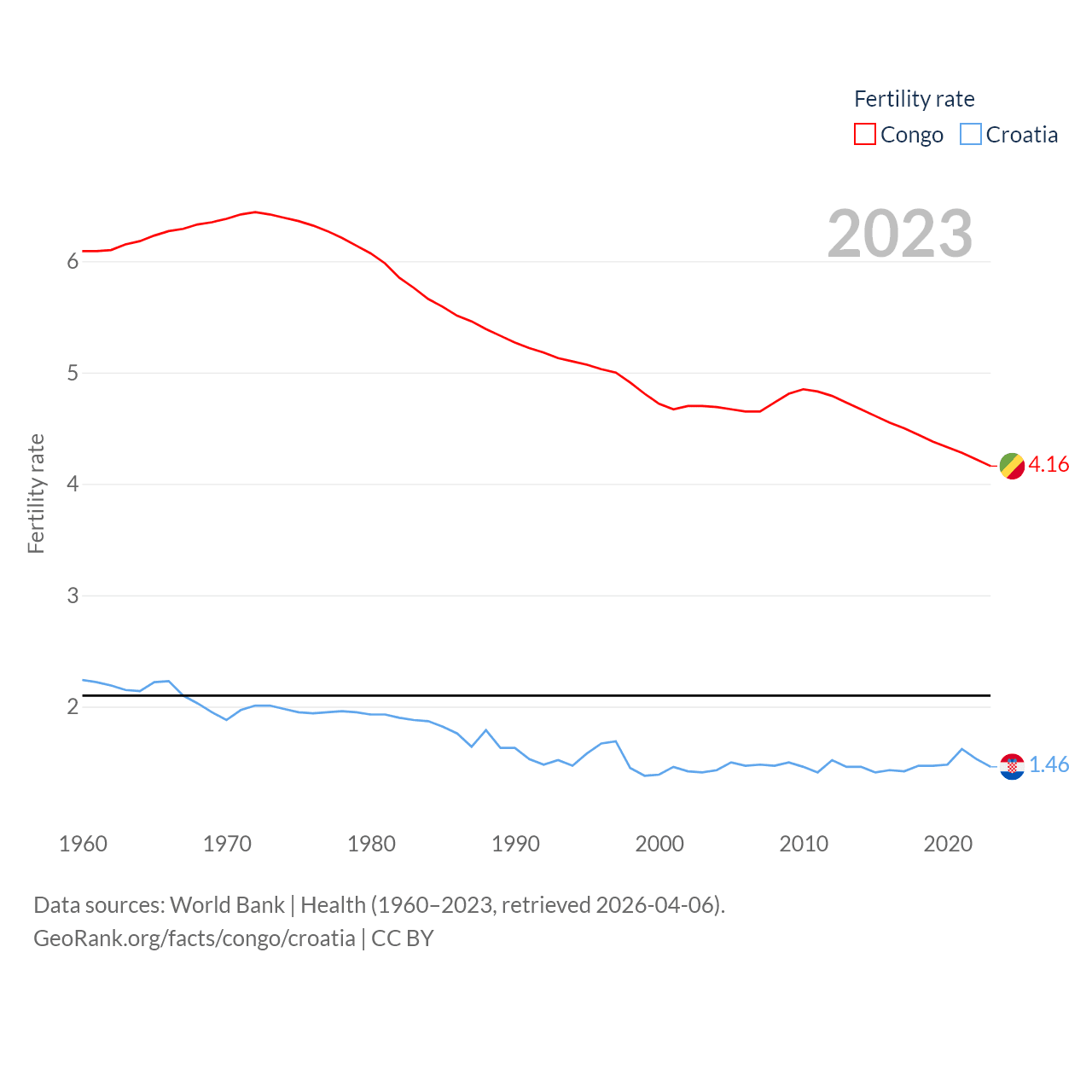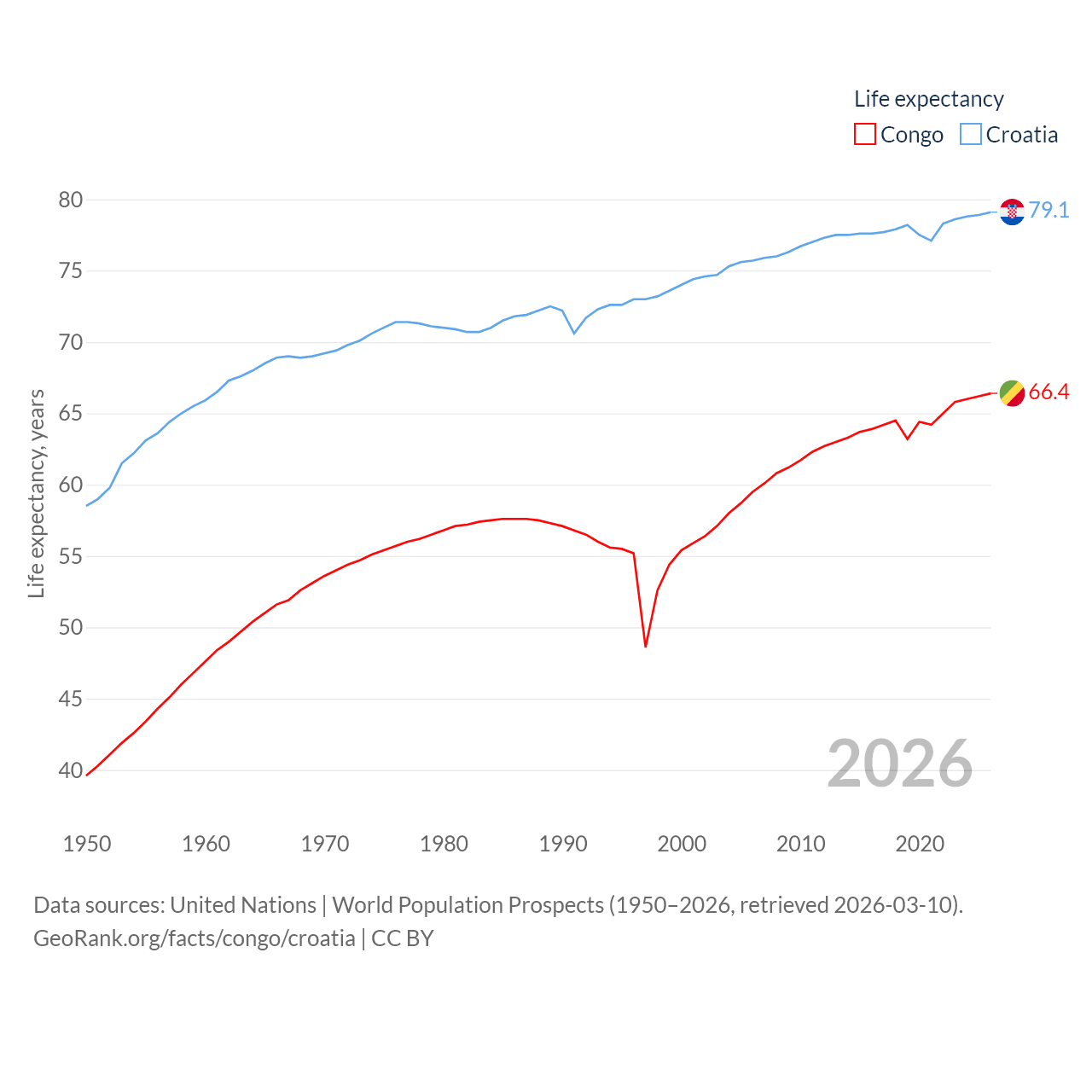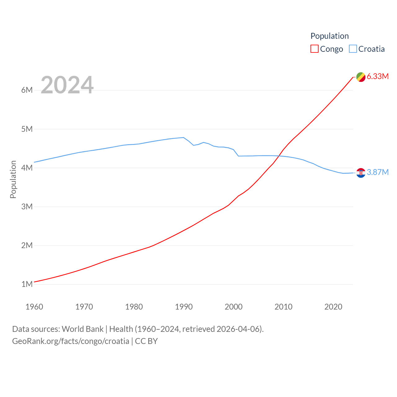 The Congo has a population of 6.33M (ranked 112/197), compared with 3.87M in Croatia (ranked 129/197). The Congo's land area is 131,854 sq mi versus 21,606 sq mi for Croatia (ranked 64th vs. 123rd).
