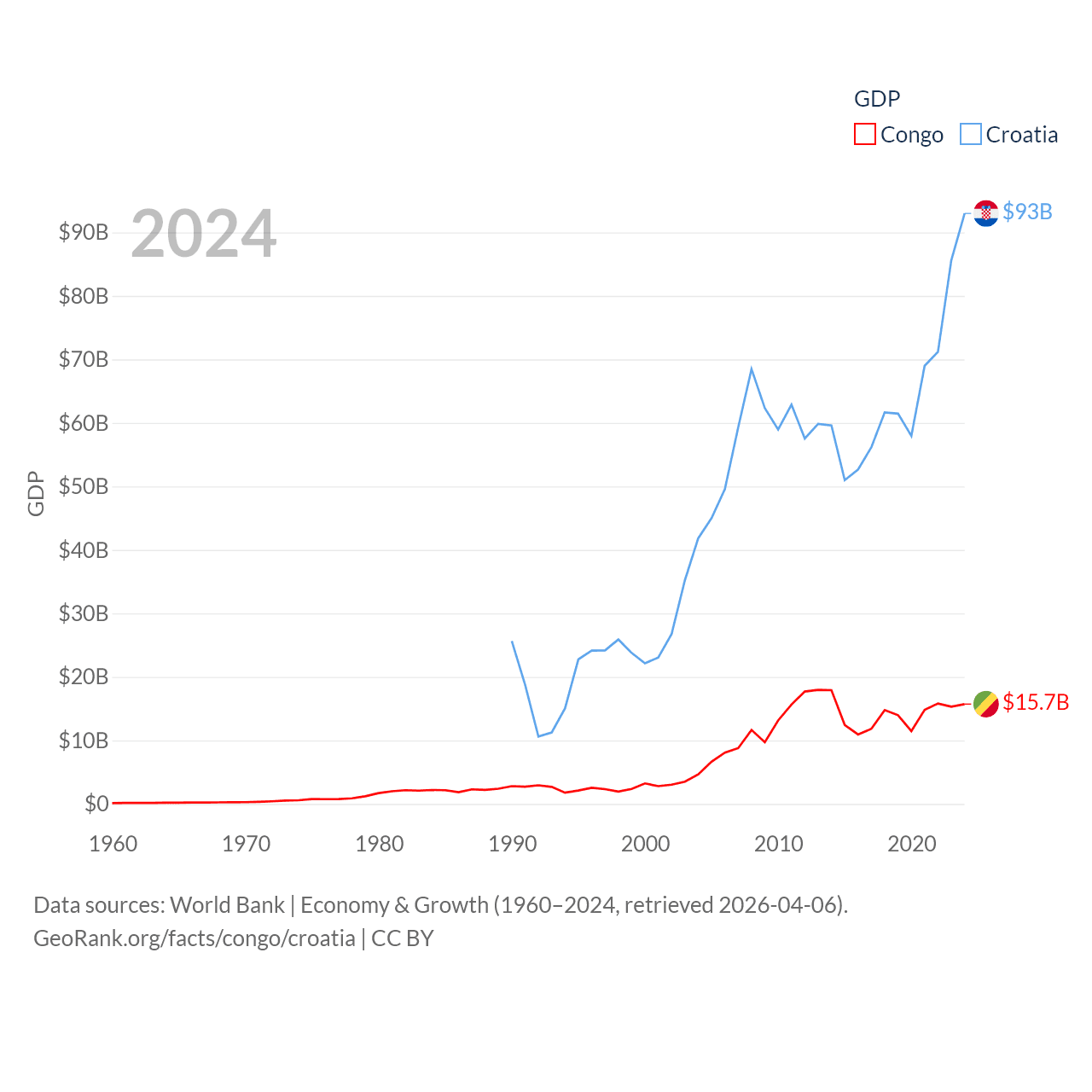 By GDP, The Congo ranks 141/197 ($15.7B) and Croatia ranks 75/197 ($93B). By GDP per capita, The Congo ranks 149/197 ($2,482), while Croatia ranks 50/197 ($24,050).