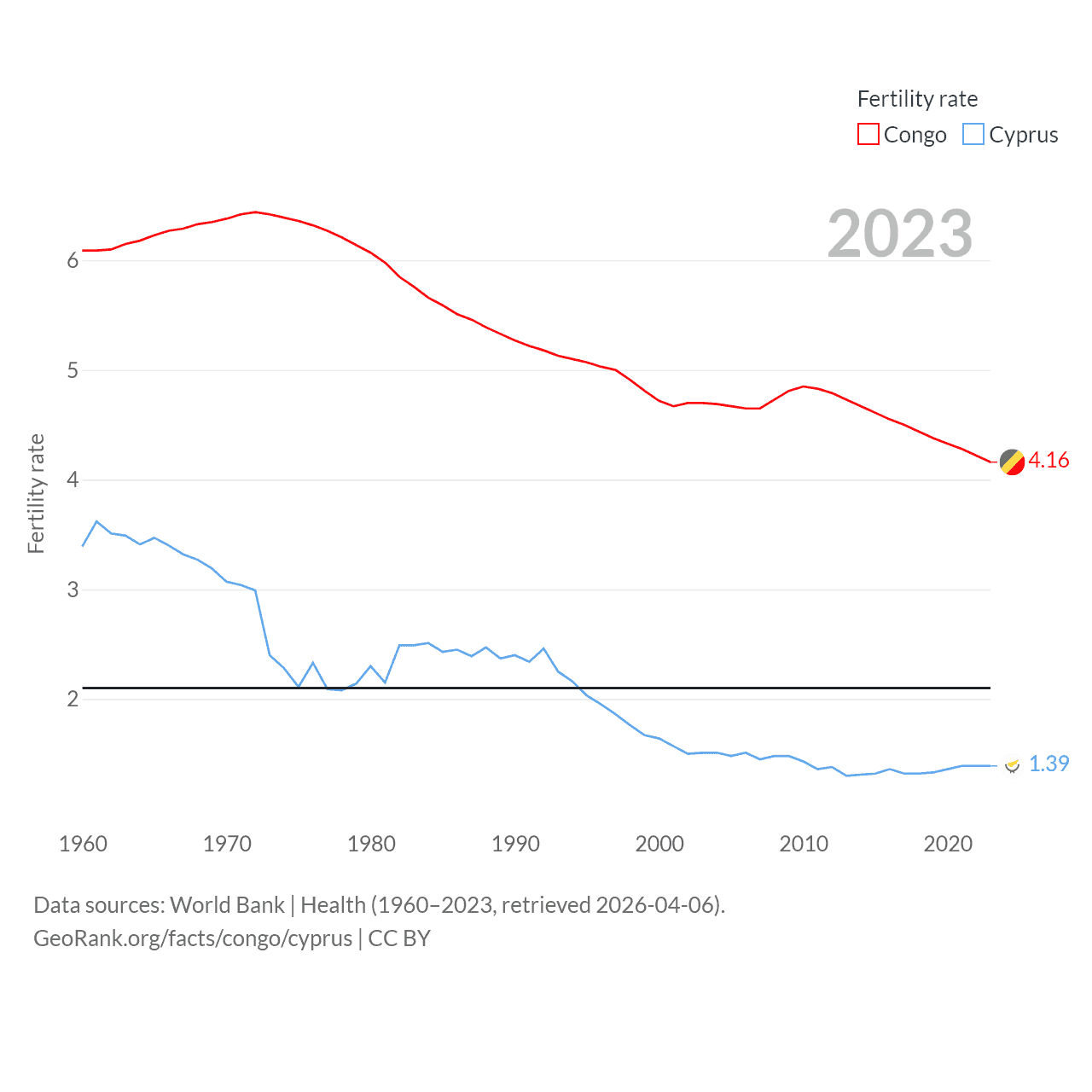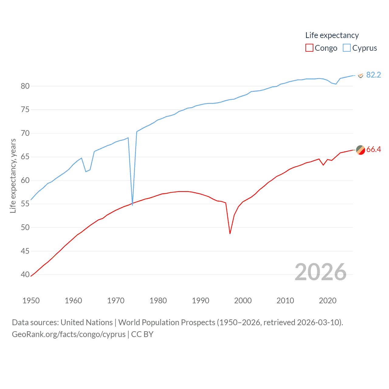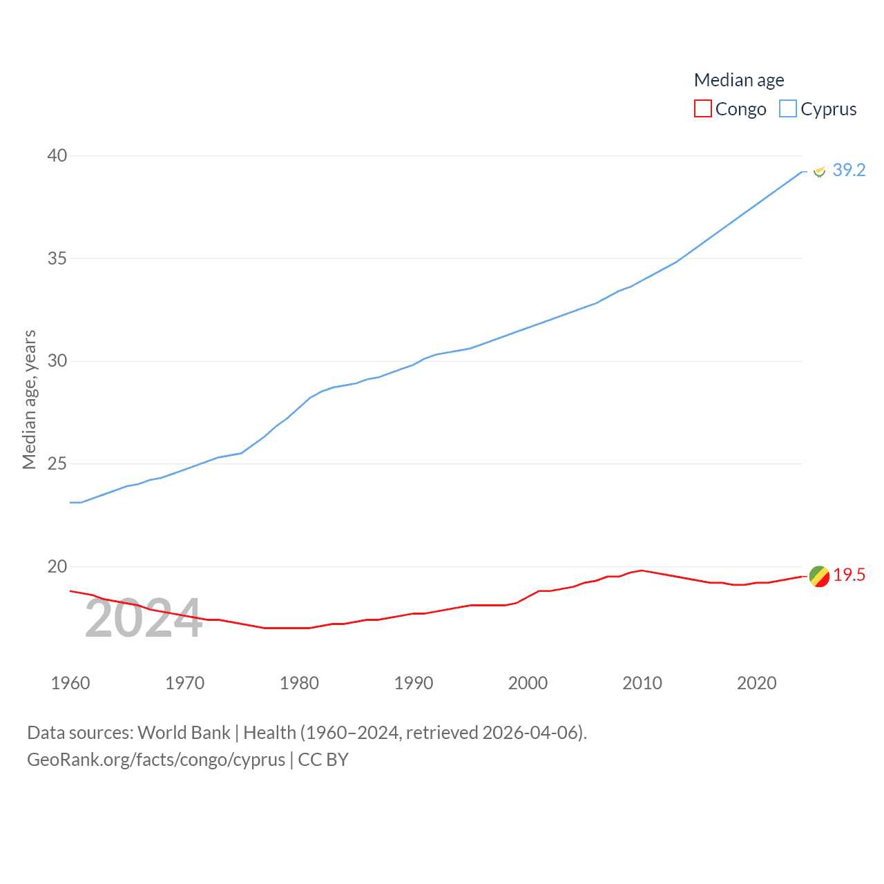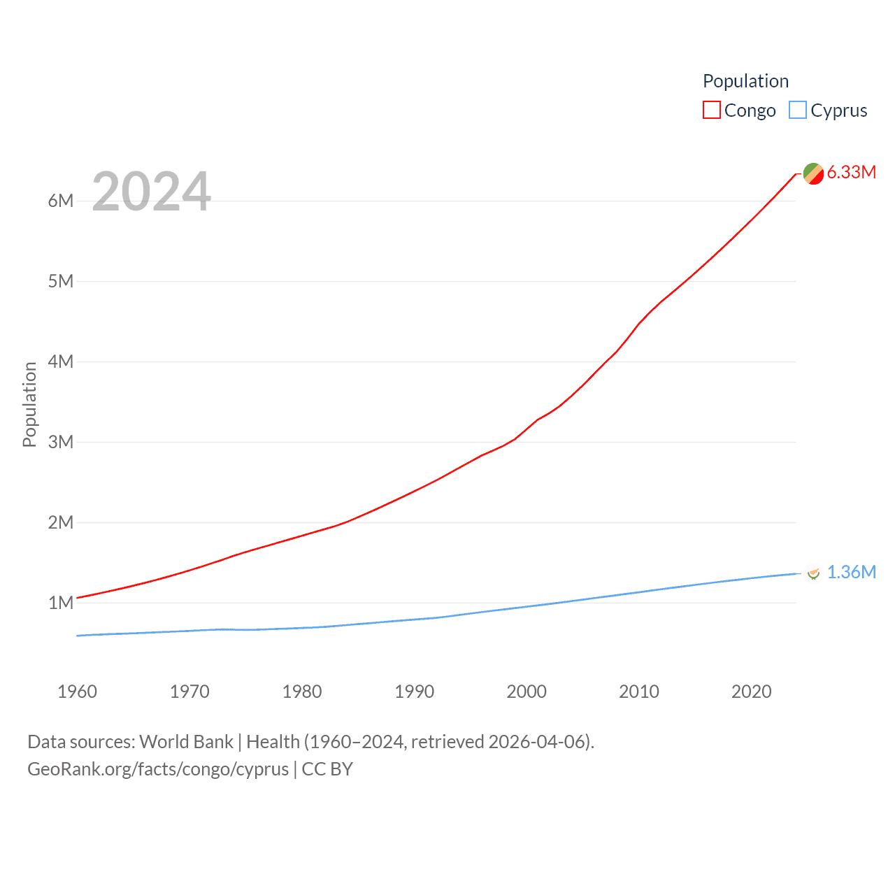 The Congo has a population of 6.33M (ranked 112/197), compared with 1.36M in Cyprus (ranked 155/197). The Congo's land area is 131,854 sq mi versus 3,568 sq mi for Cyprus (ranked 64th vs. 163rd).