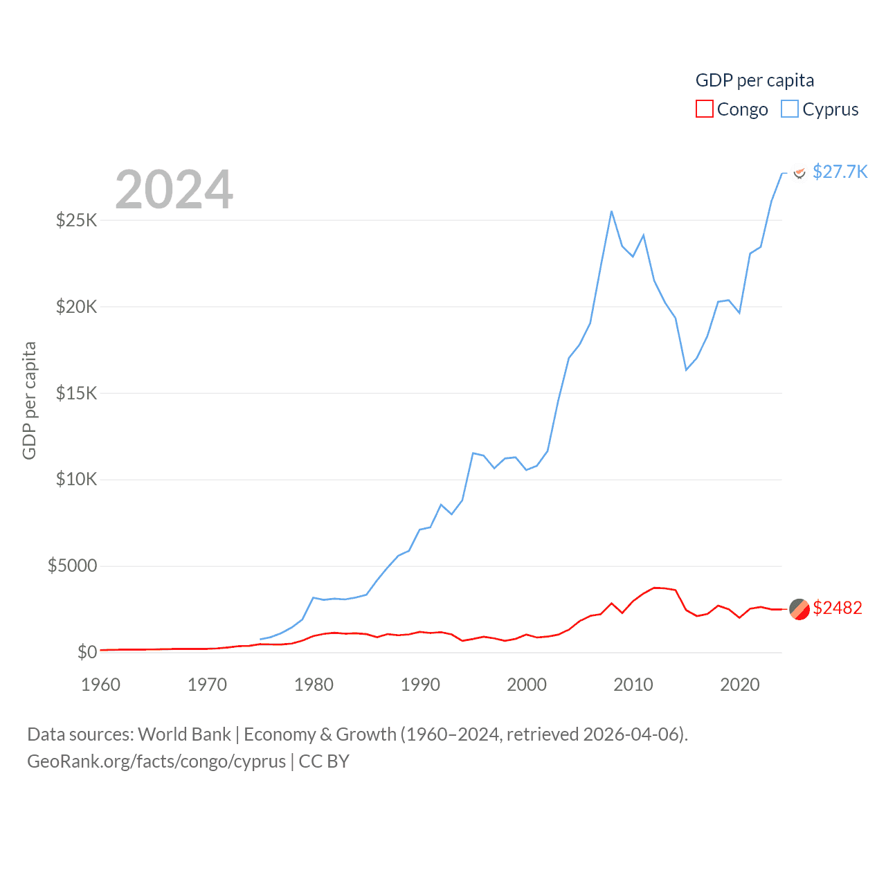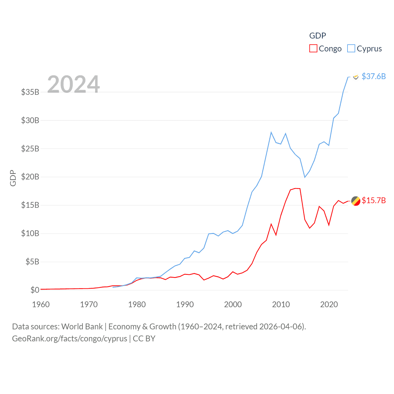 By GDP, The Congo ranks 141/197 ($15.7B) and Cyprus ranks 103/197 ($37.6B). By GDP per capita, The Congo ranks 149/197 ($2,482), while Cyprus ranks 45/197 ($27,707).