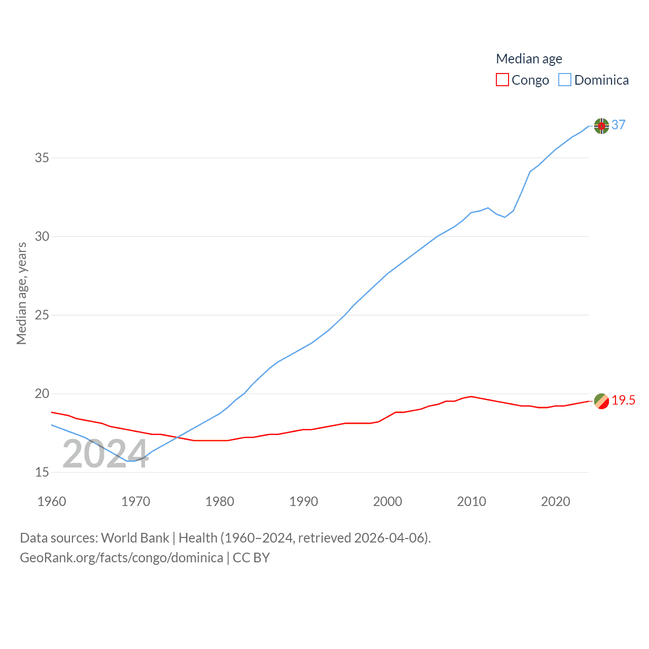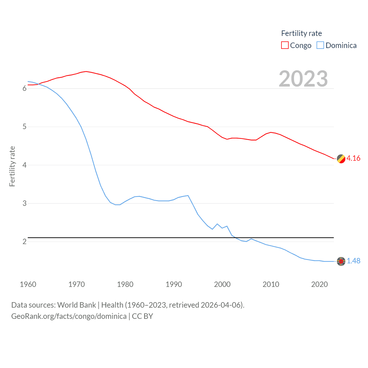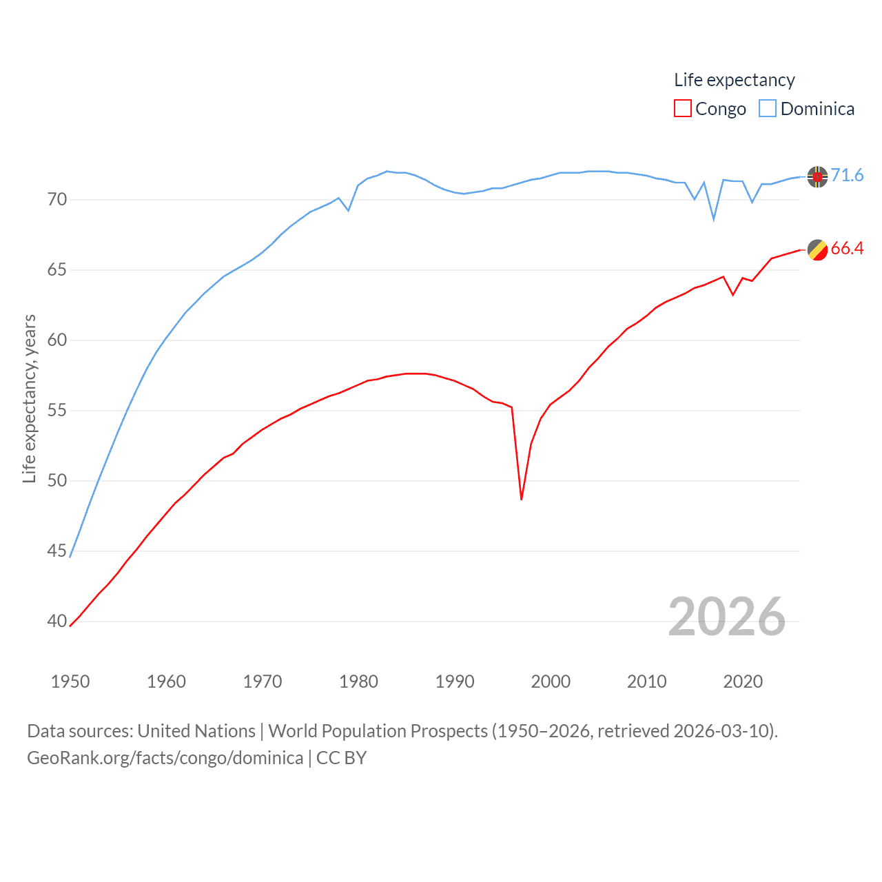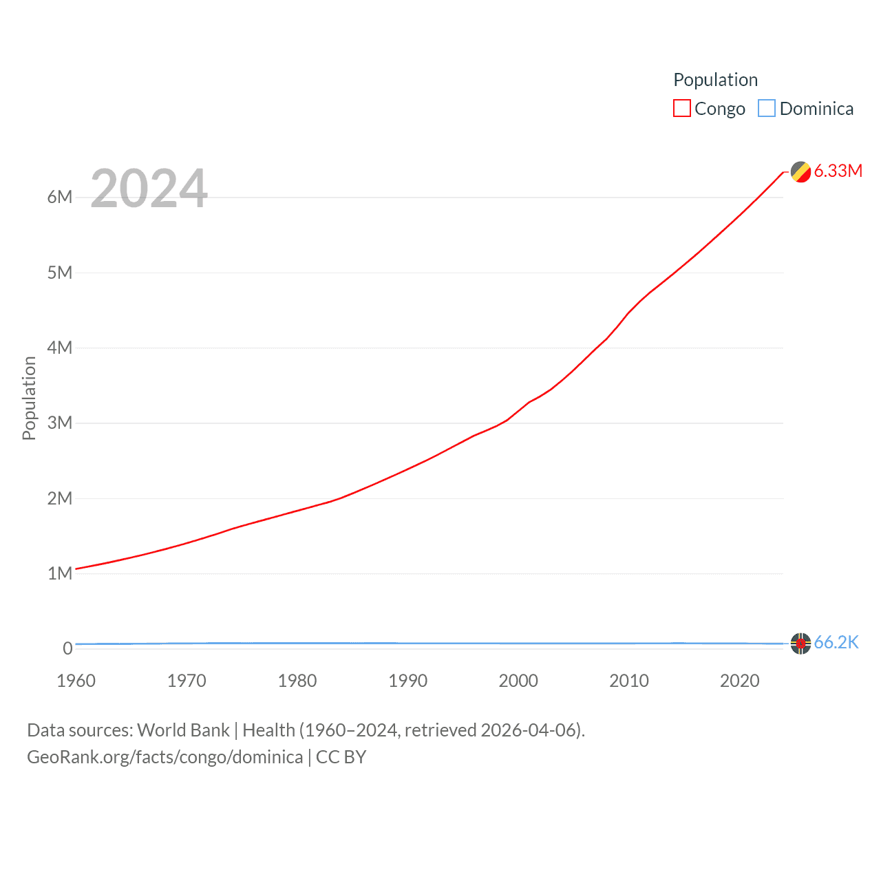 The Congo has a population of 6.33M (ranked 112/197), compared with 66.2K in Dominica (ranked 188/197). The Congo's land area is 131,854 sq mi versus 289.6 sq mi for Dominica (ranked 64th vs. 175th).
