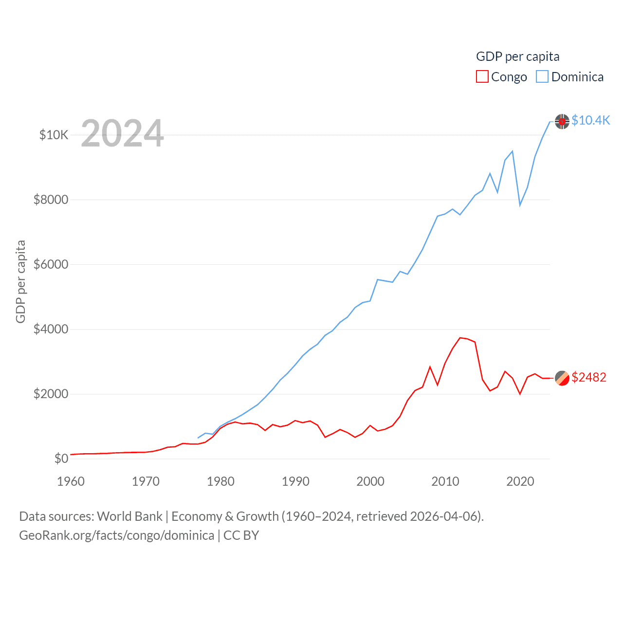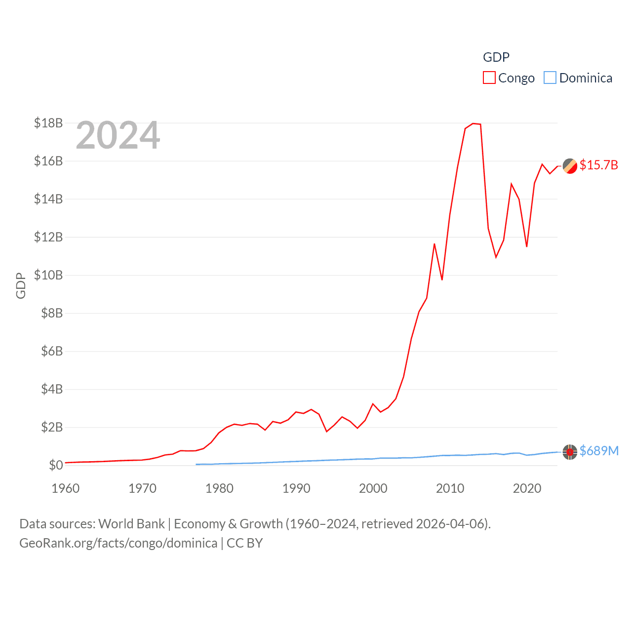 By GDP, The Congo ranks 141/197 ($15.7B) and Dominica ranks 190/197 ($689M). By GDP per capita, The Congo ranks 149/197 ($2,482), while Dominica ranks 84/197 ($10,405).