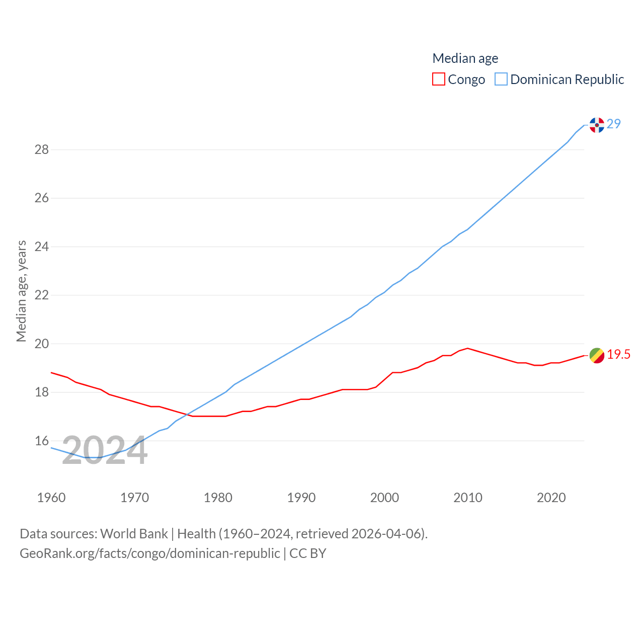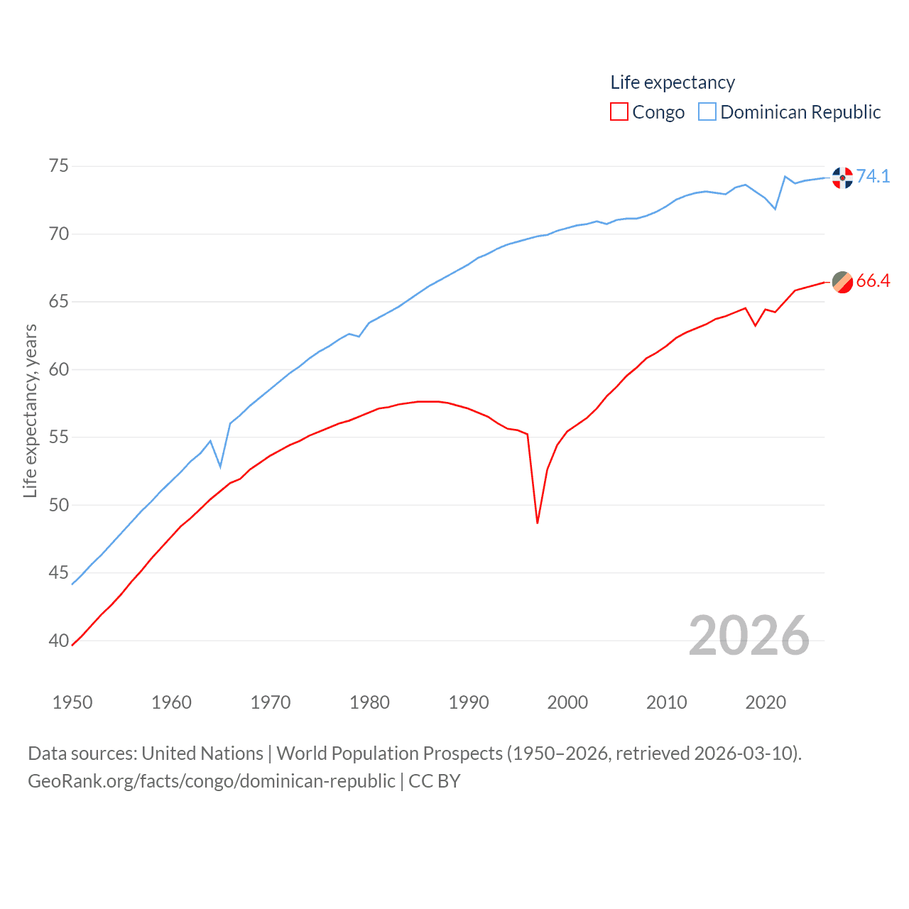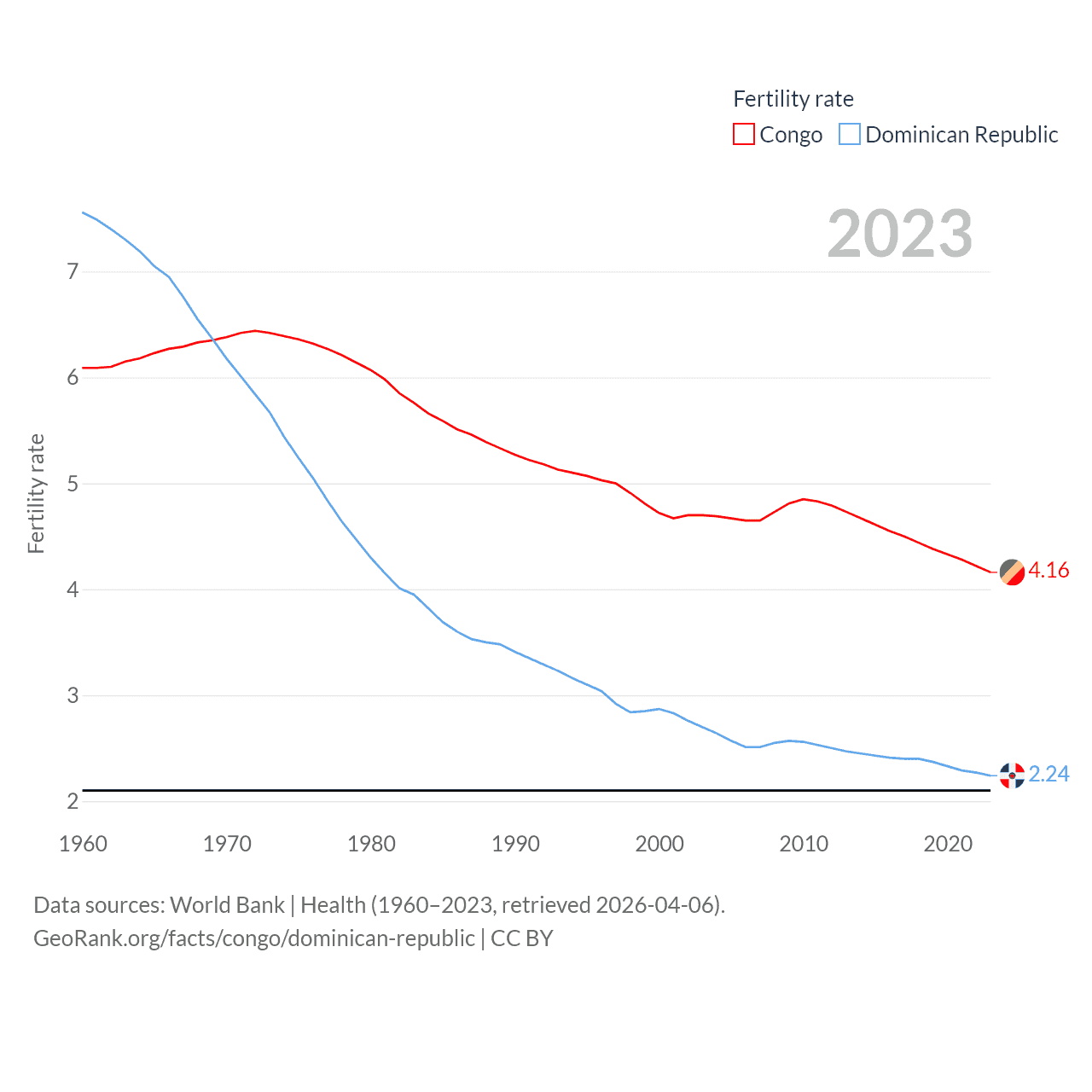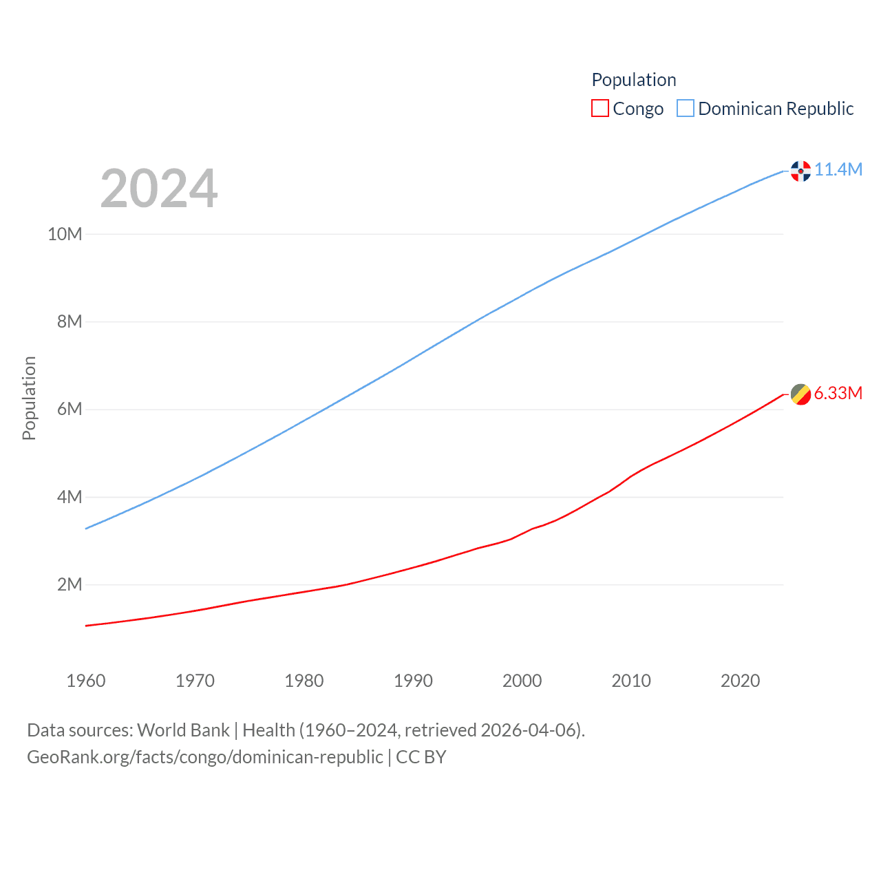 The Congo has a population of 6.33M (ranked 112/197), compared with 11.4M in The Dominican Republic (ranked 85/197). The Congo's land area is 131,854 sq mi versus 18,609 sq mi for The Dominican Republic (ranked 64th vs. 127th).