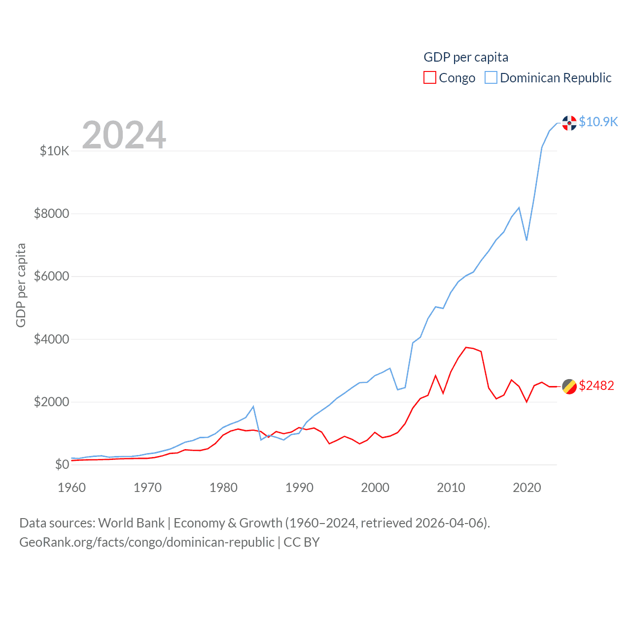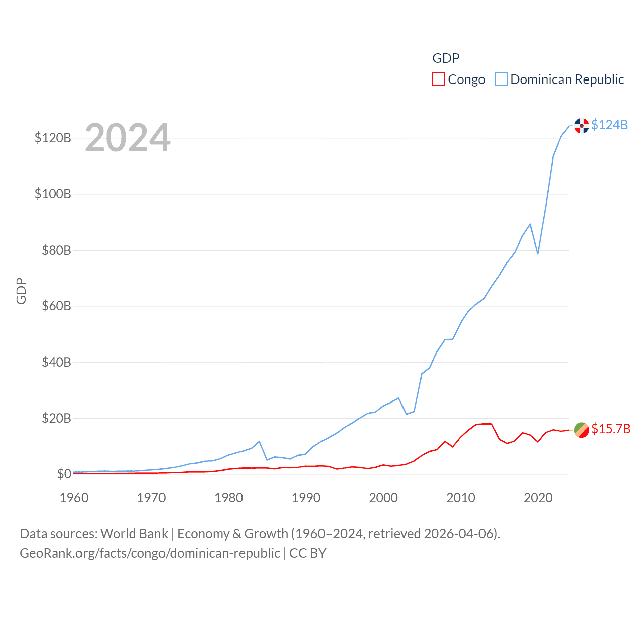 By GDP, The Congo ranks 141/197 ($15.7B) and The Dominican Republic ranks 63/197 ($124B). By GDP per capita, The Congo ranks 149/197 ($2,482), while The Dominican Republic ranks 83/197 ($10,876).
