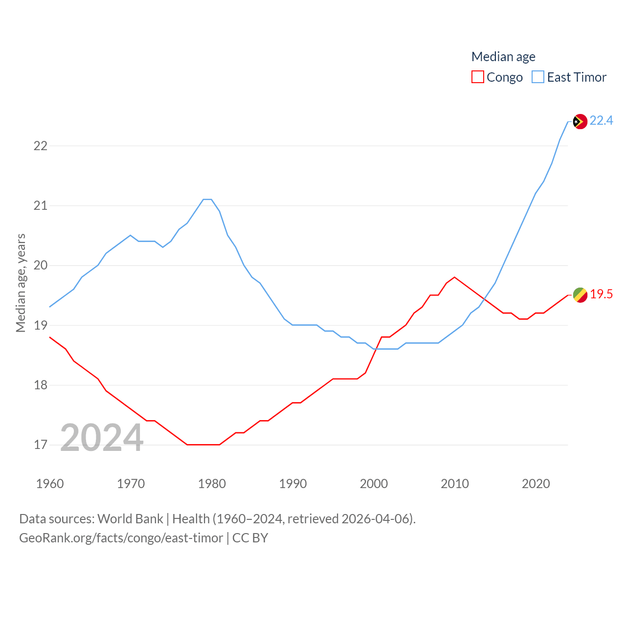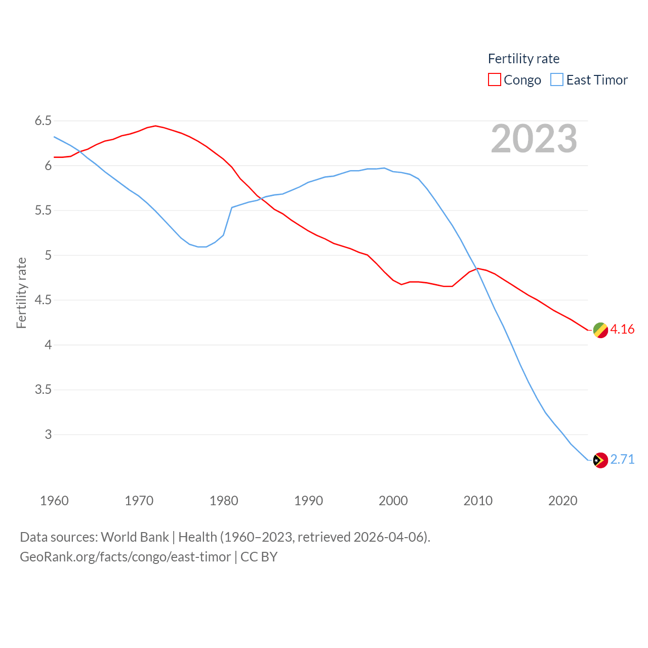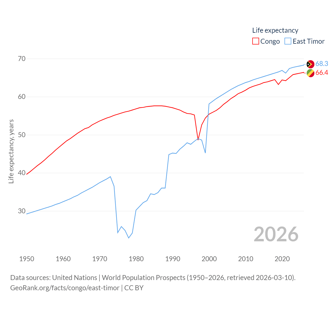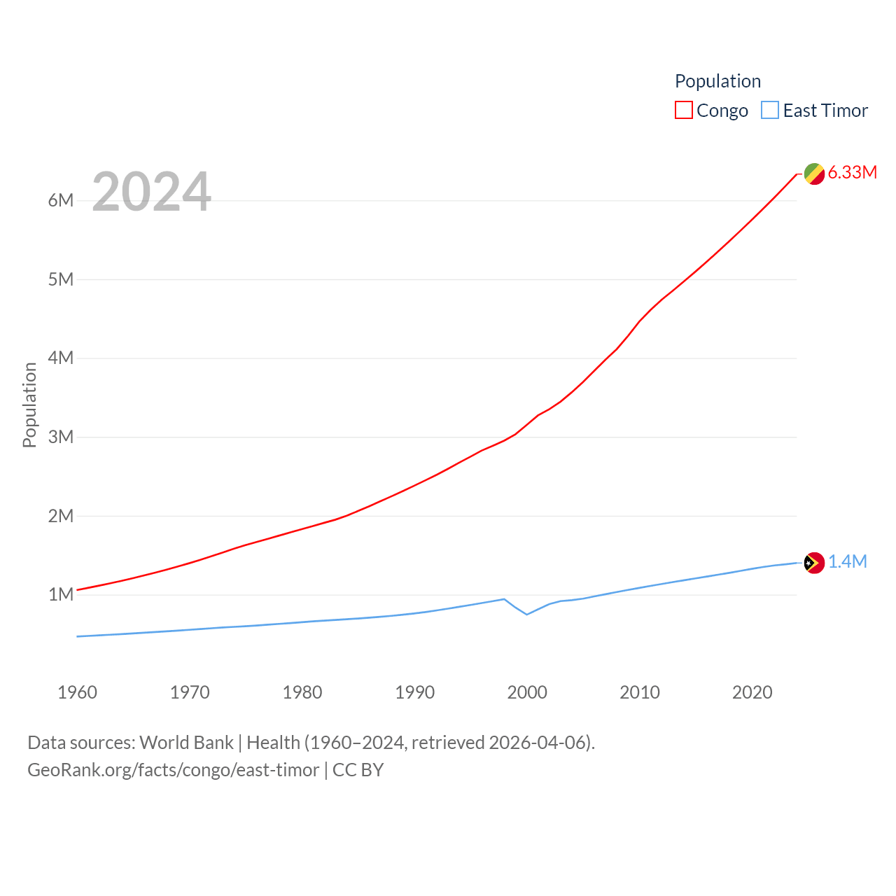 The Congo has a population of 6.33M (ranked 112/197), compared with 1.4M in East Timor (ranked 152/197). The Congo's land area is 131,854 sq mi versus 5,741 sq mi for East Timor (ranked 64th vs. 155th).