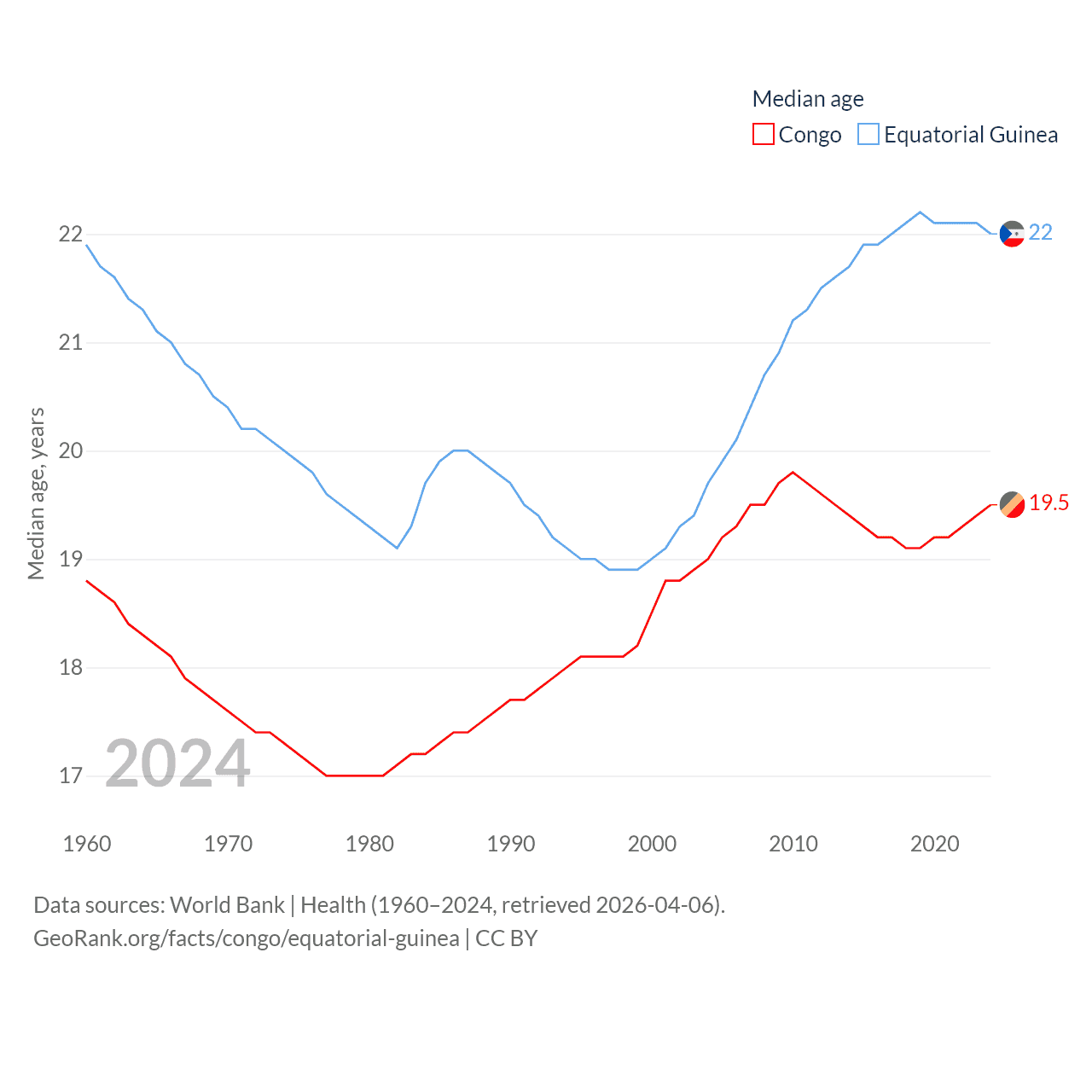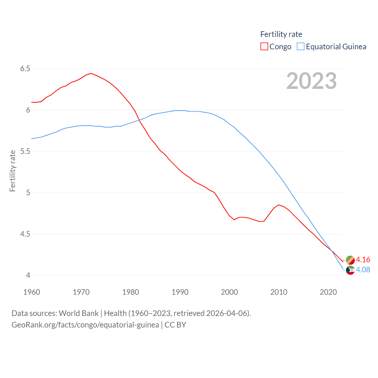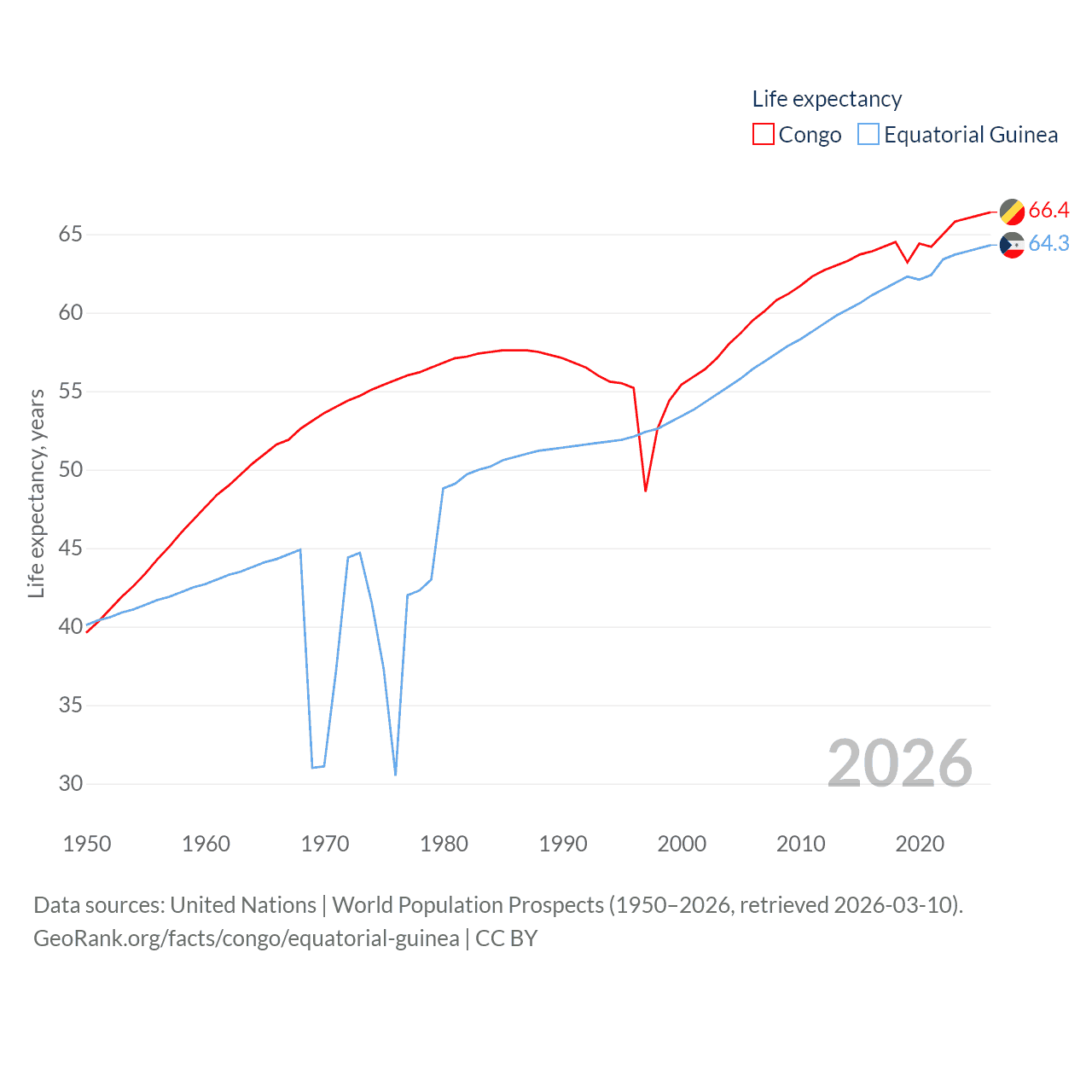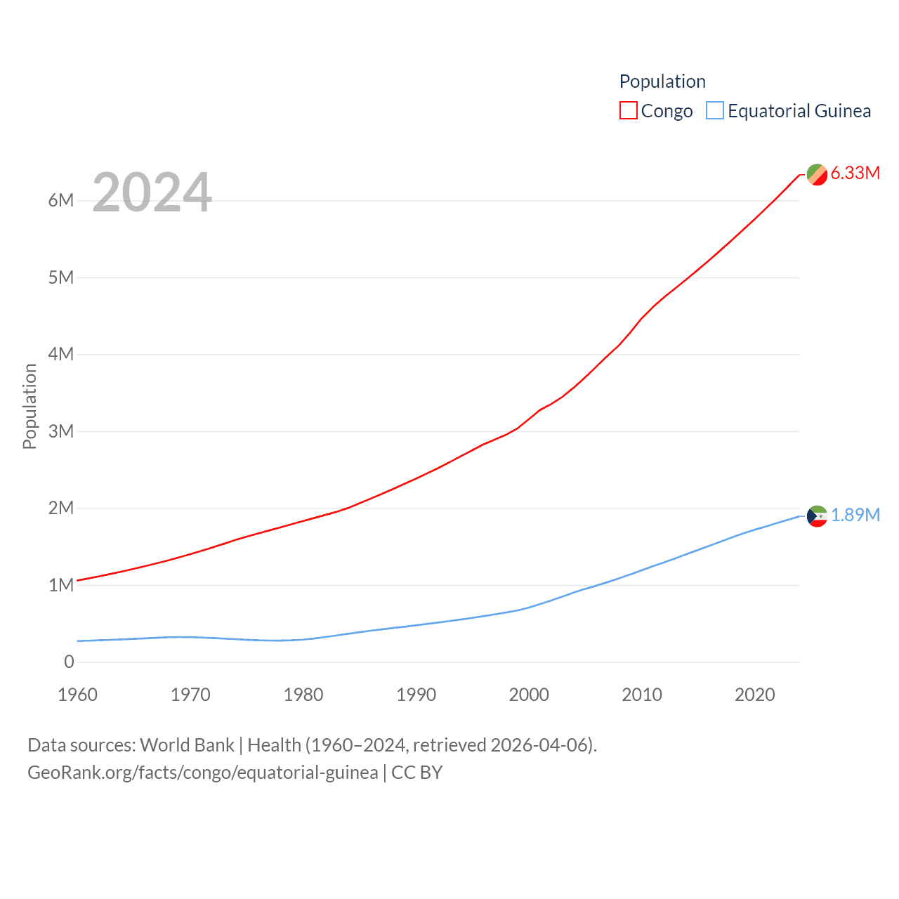 The Congo has a population of 6.33M (ranked 112/197), compared with 1.89M in Equatorial Guinea (ranked 148/197). The Congo's land area is 131,854 sq mi versus 10,830 sq mi for Equatorial Guinea (ranked 64th vs. 140th).