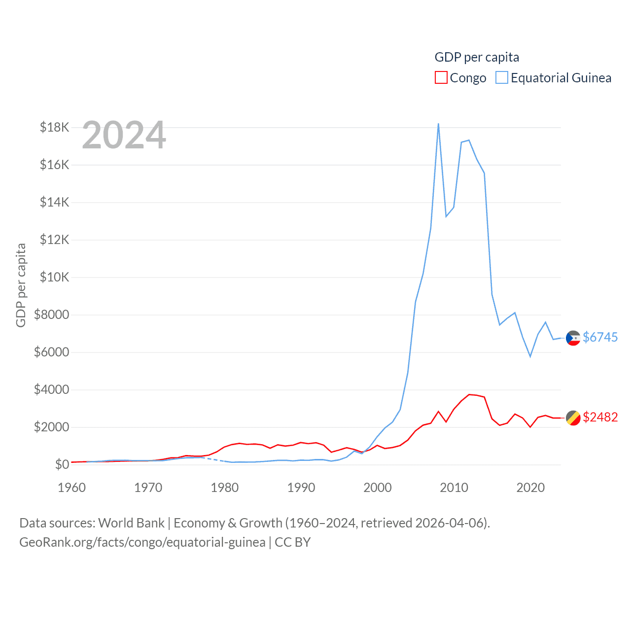 By GDP, The Congo ranks 141/197 ($15.7B) and Equatorial Guinea ranks 148/197 ($12.8B). By GDP per capita, The Congo ranks 149/197 ($2,482), while Equatorial Guinea ranks 106/197 ($6,745).
