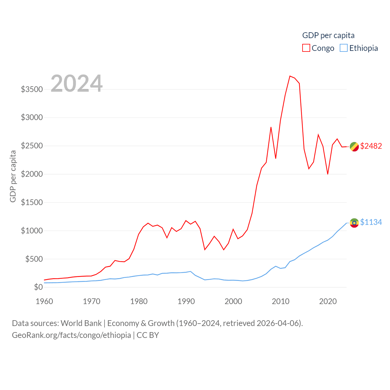 By GDP, The Congo ranks 141/197 ($15.7B) and Ethiopia ranks 60/197 ($150B). By GDP per capita, The Congo ranks 149/197 ($2,482), while Ethiopia ranks 171/197 ($1,134).