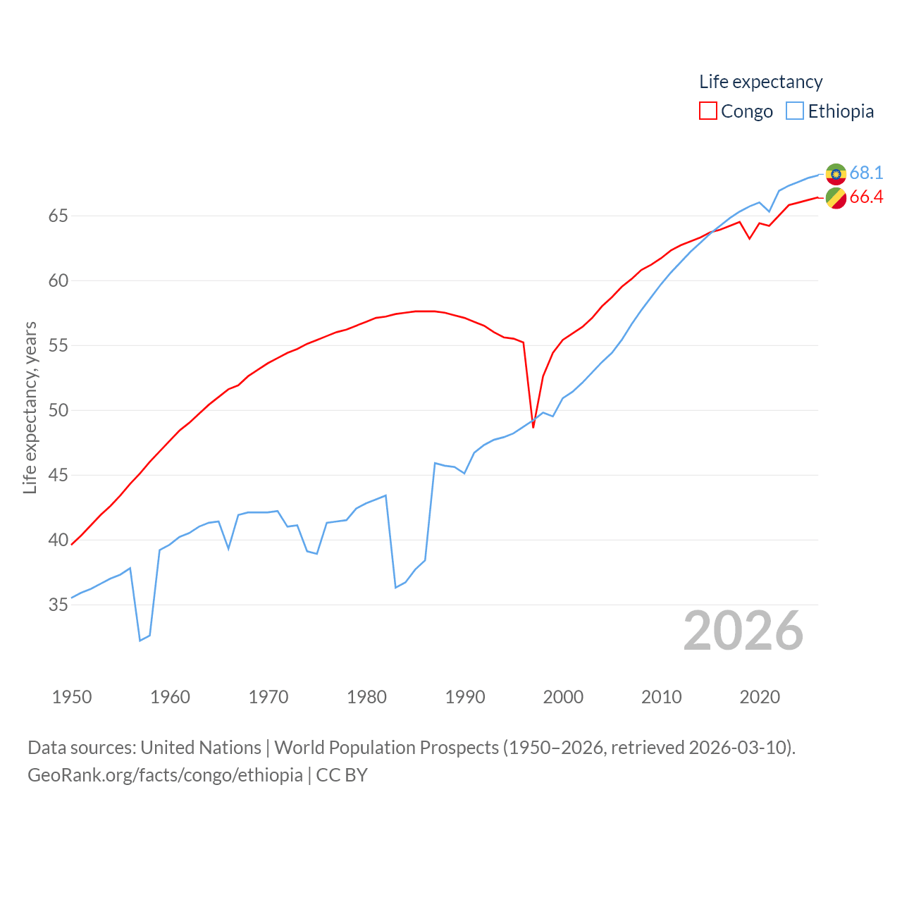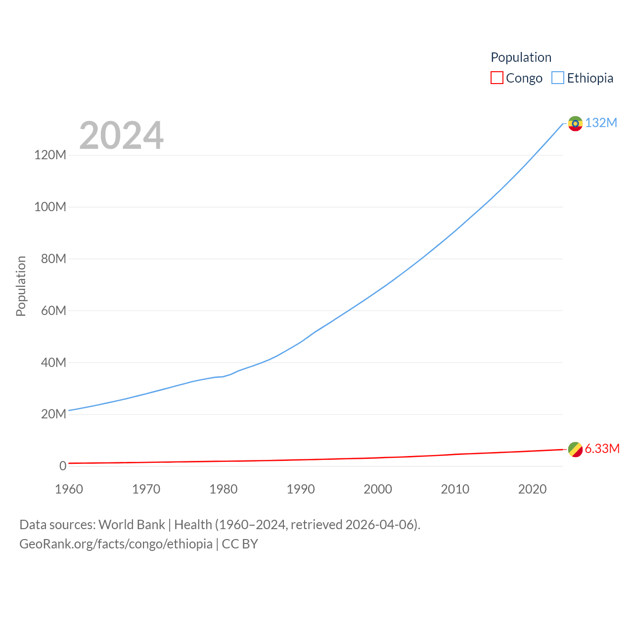The Congo has a population of 6.33M (ranked 112/197), compared with 132M in Ethiopia (ranked 10/197). The Congo's land area is 131,854 sq mi versus 435,716 sq mi for Ethiopia (ranked 64th vs. 25th).