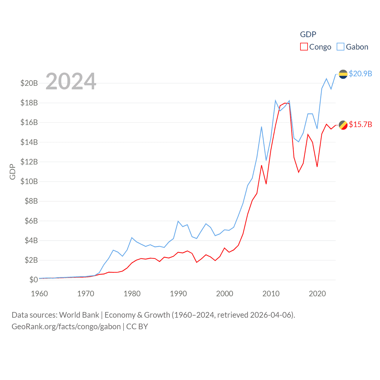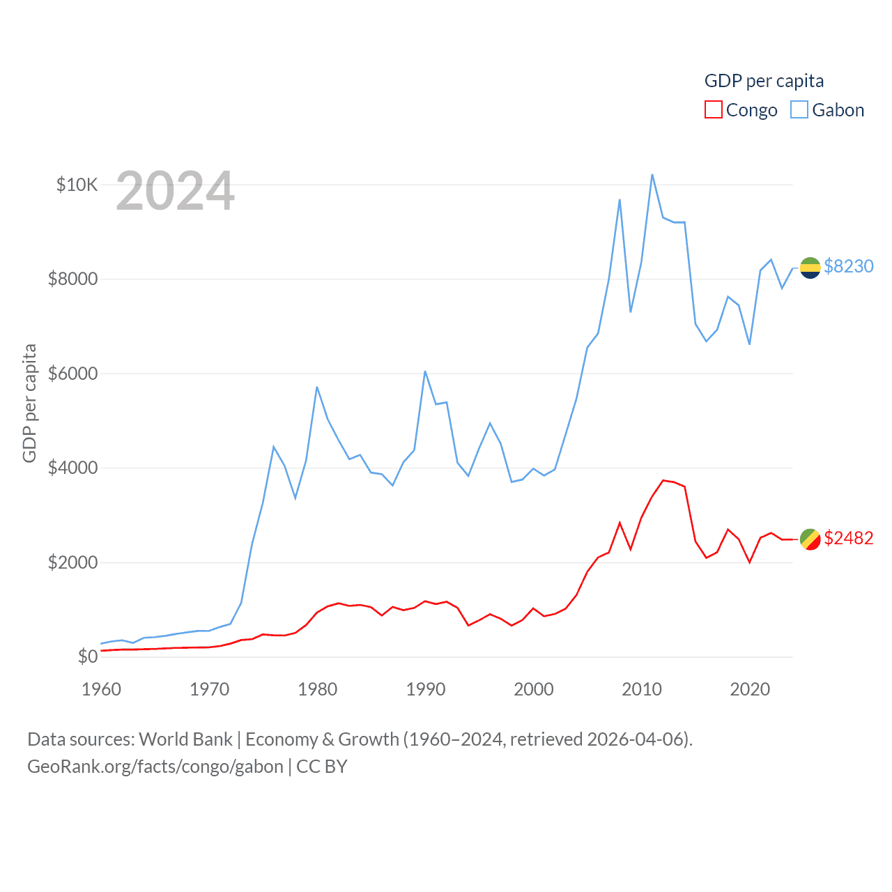 By GDP, The Congo ranks 141/197 ($15.7B) and Gabon ranks 127/197 ($20.9B). By GDP per capita, The Congo ranks 149/197 ($2,482), while Gabon ranks 93/197 ($8,230).