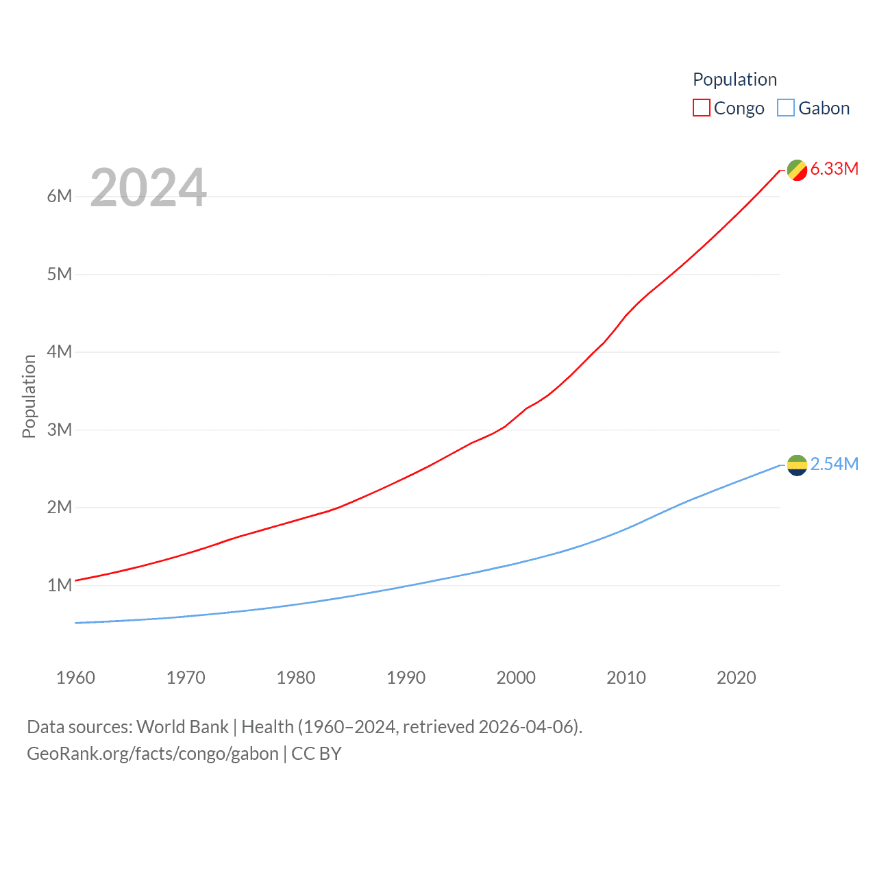The Congo has a population of 6.33M (ranked 112/197), compared with 2.54M in Gabon (ranked 141/197). The Congo's land area is 131,854 sq mi versus 99,487 sq mi for Gabon (ranked 64th vs. 75th).