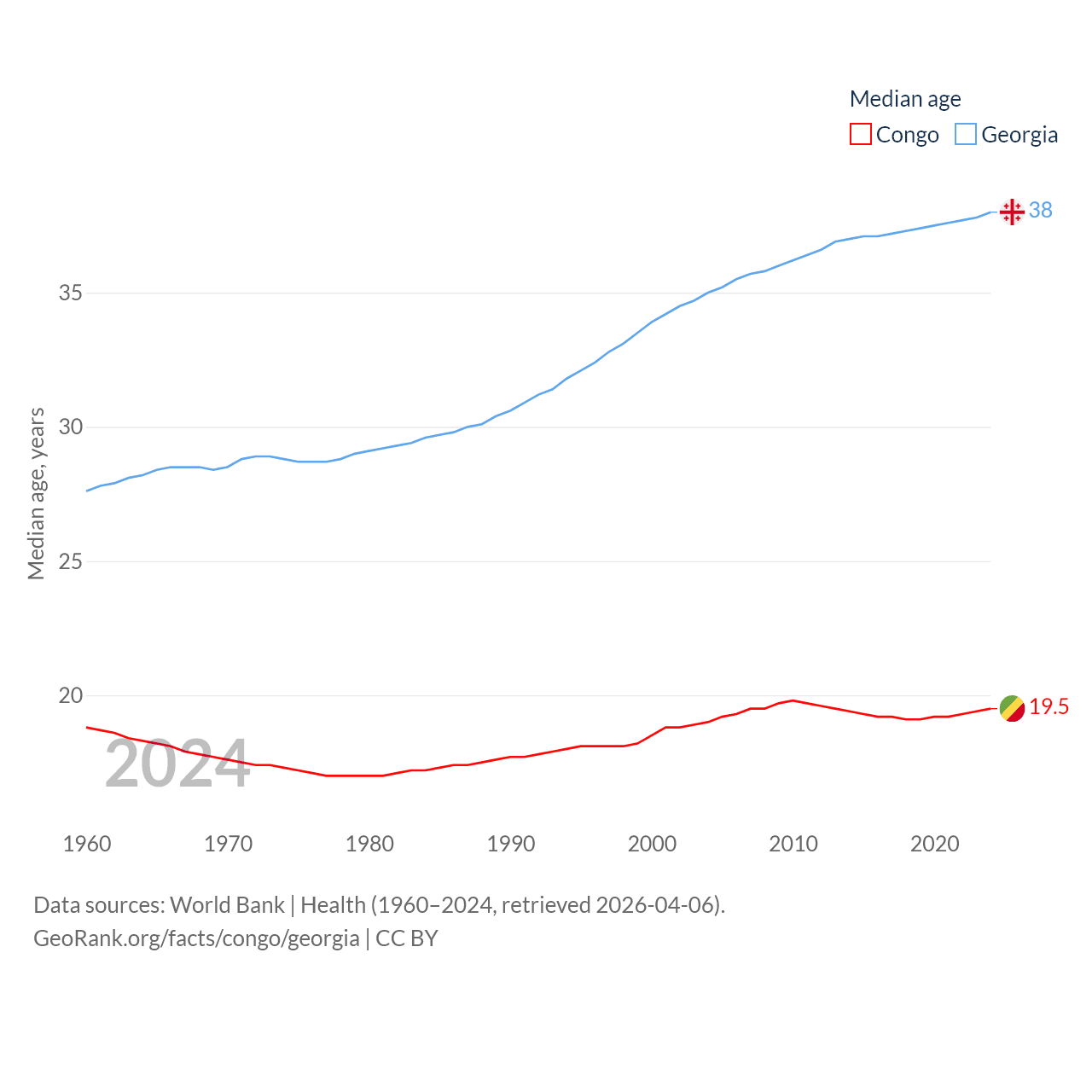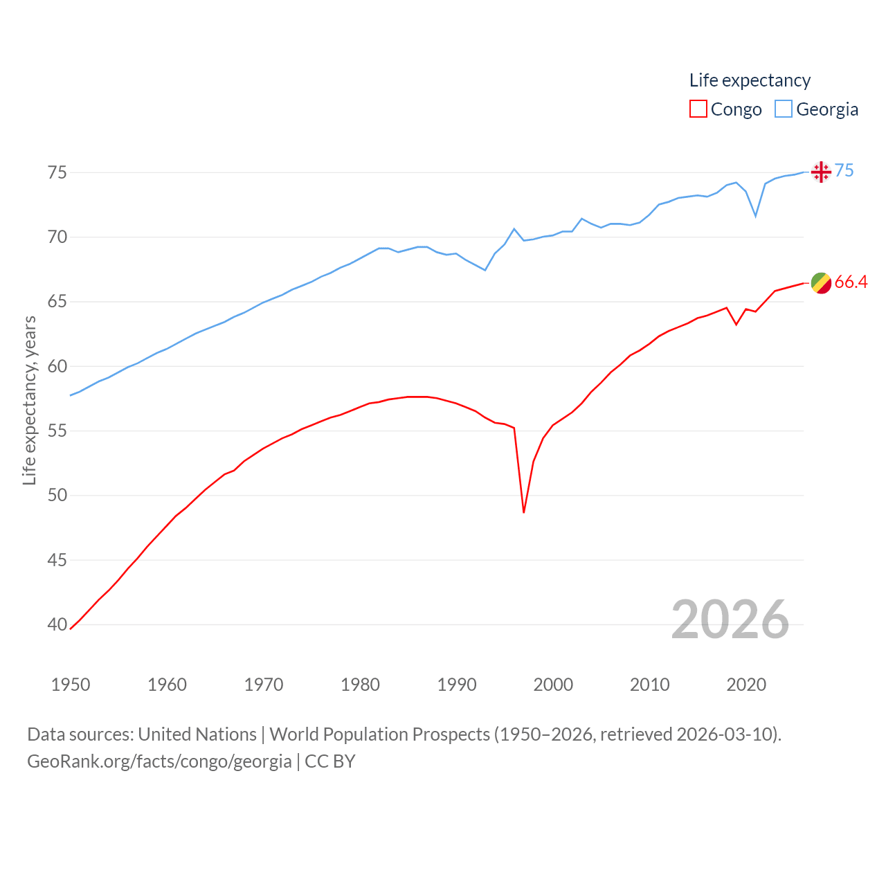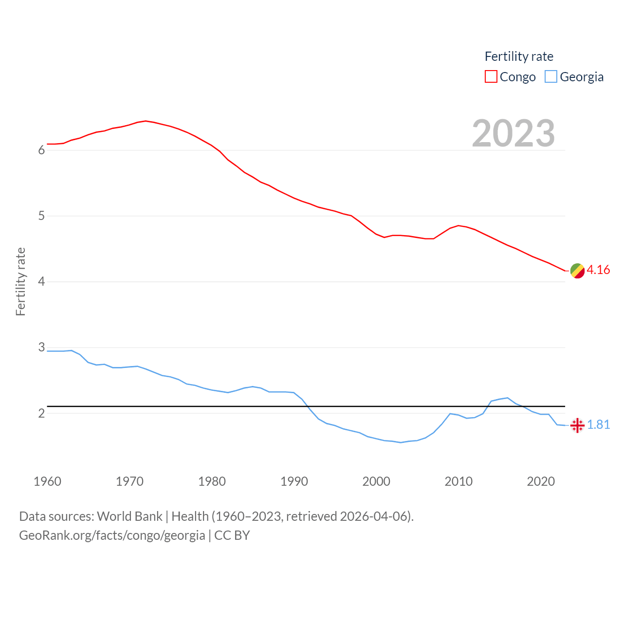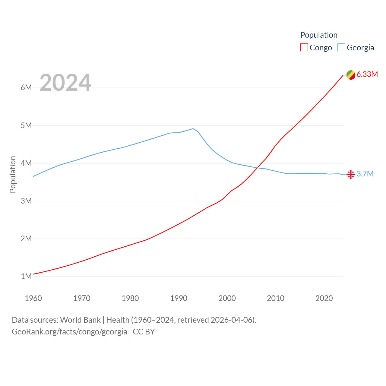 The Congo has a population of 6.33M (ranked 112/197), compared with 3.7M in Georgia (ranked 130/197). The Congo's land area is 131,854 sq mi versus 26,830 sq mi for Georgia (ranked 64th vs. 118th).