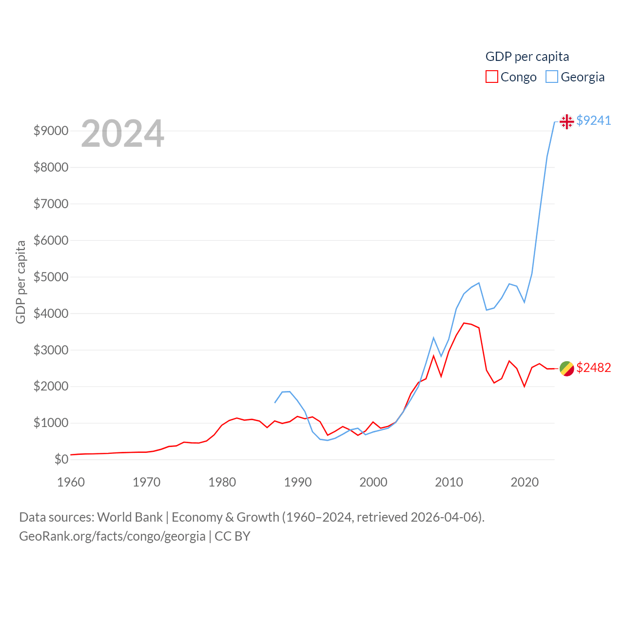 By GDP, The Congo ranks 141/197 ($15.7B) and Georgia ranks 107/197 ($34.2B). By GDP per capita, The Congo ranks 149/197 ($2,482), while Georgia ranks 89/197 ($9,241).