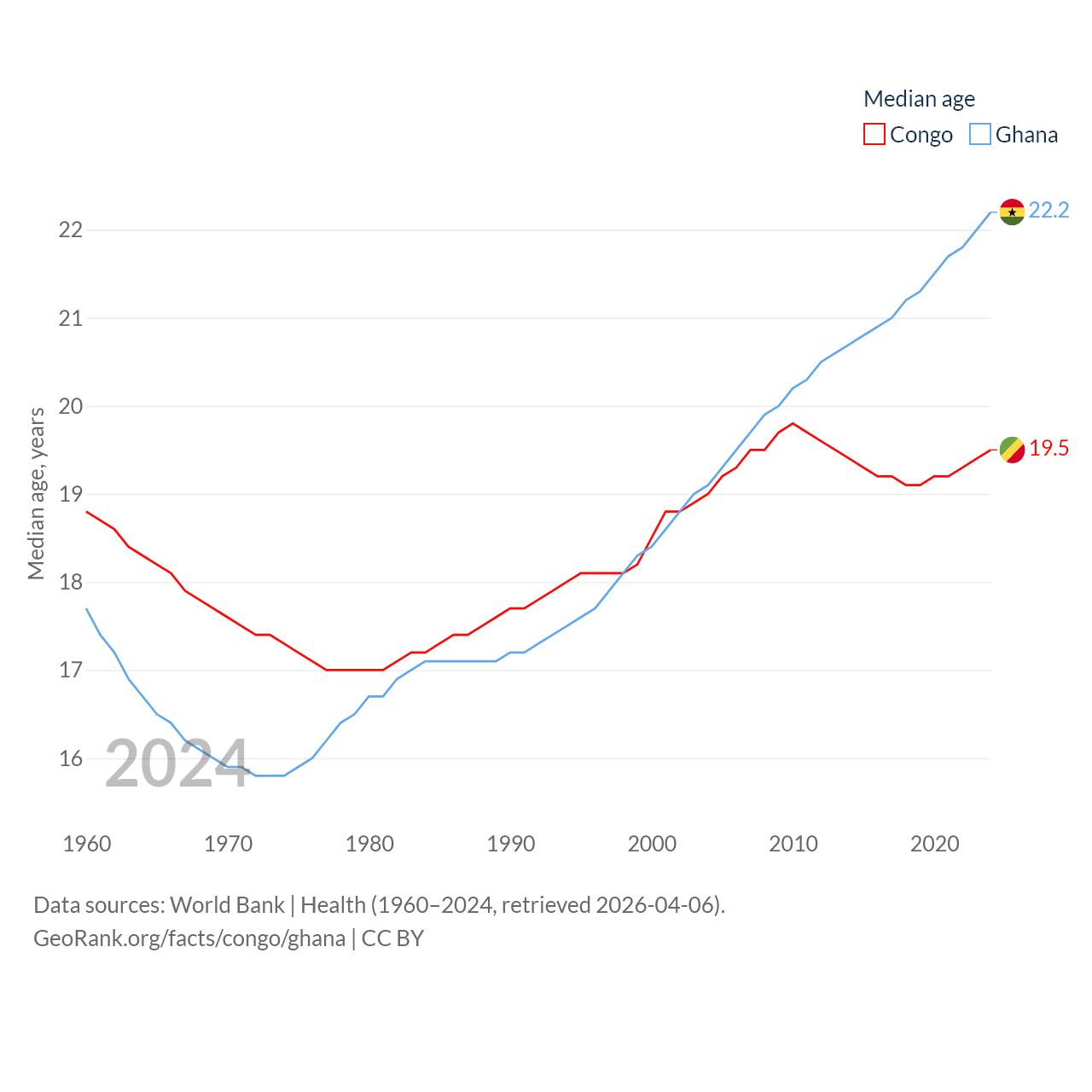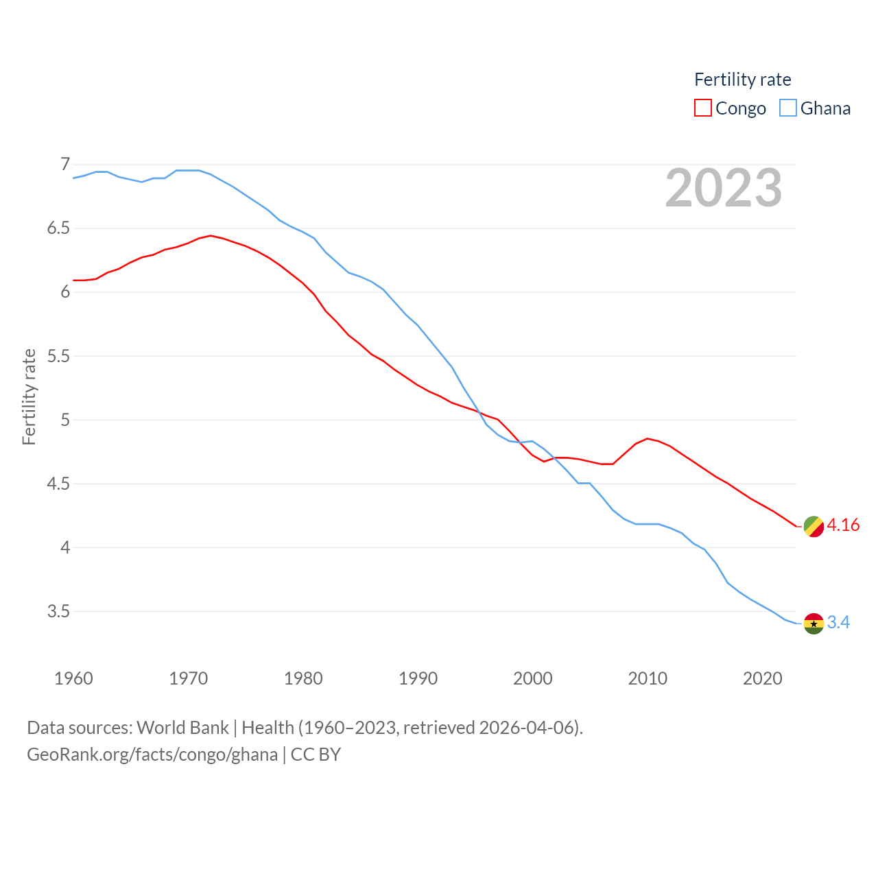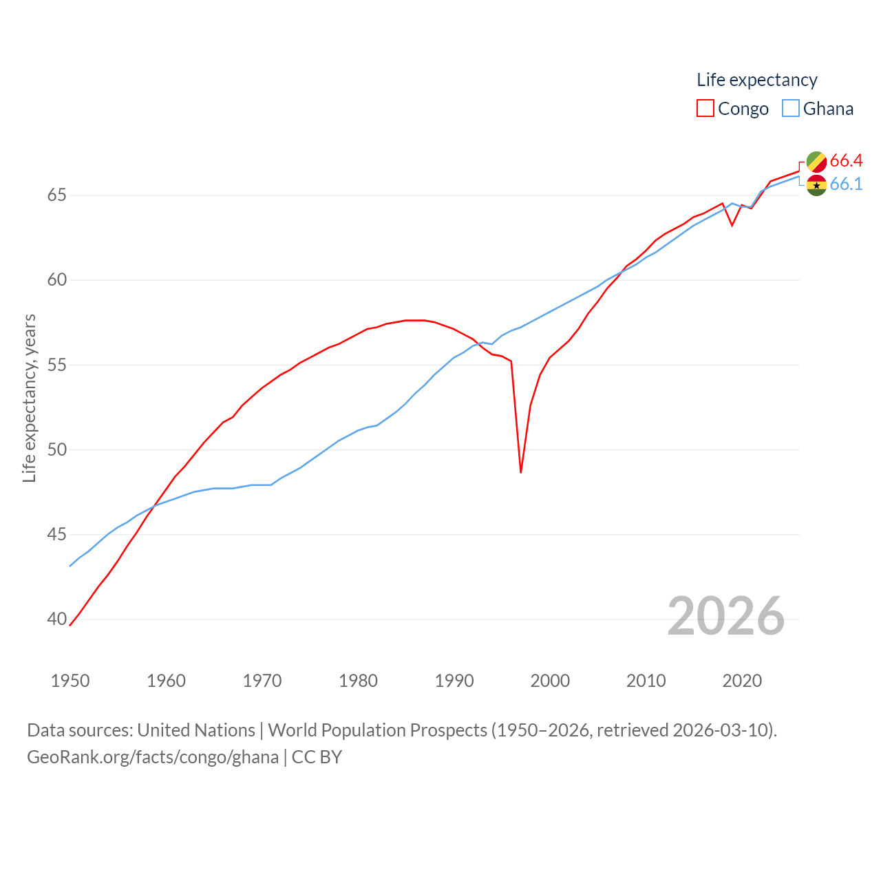 The Congo has a population of 6.33M (ranked 112/197), compared with 34.4M in Ghana (ranked 47/197). The Congo's land area is 131,854 sq mi versus 87,851 sq mi for Ghana (ranked 64th vs. 81st).