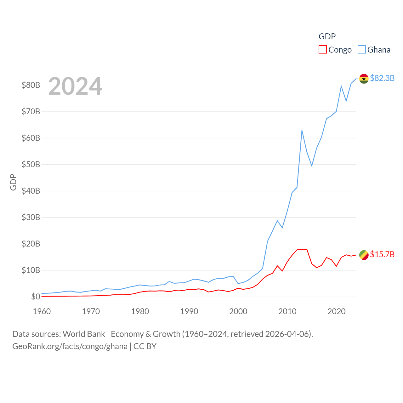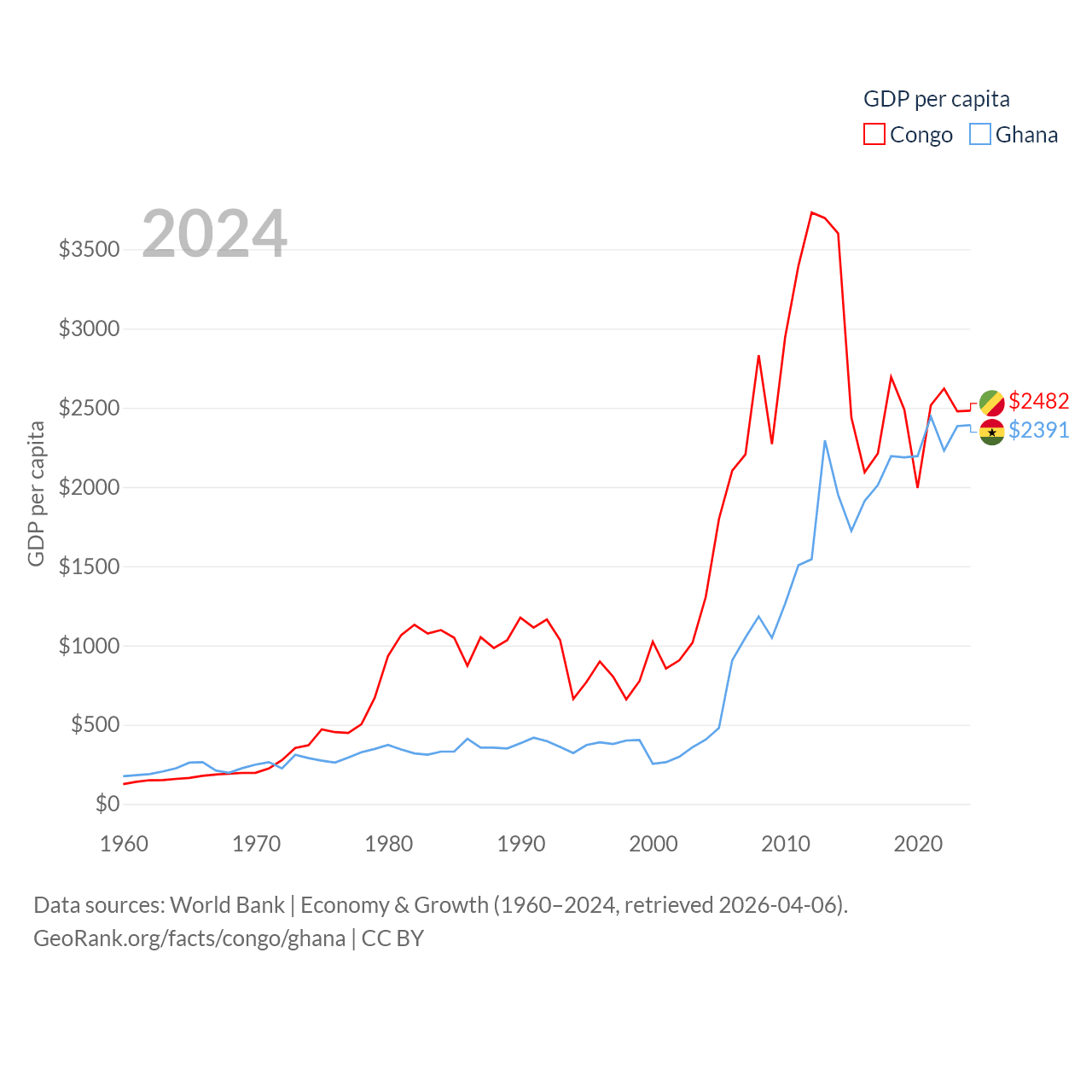 By GDP, The Congo ranks 141/197 ($15.7B) and Ghana ranks 80/197 ($82.3B). By GDP per capita, The Congo ranks 149/197 ($2,482), while Ghana ranks 151/197 ($2,391).