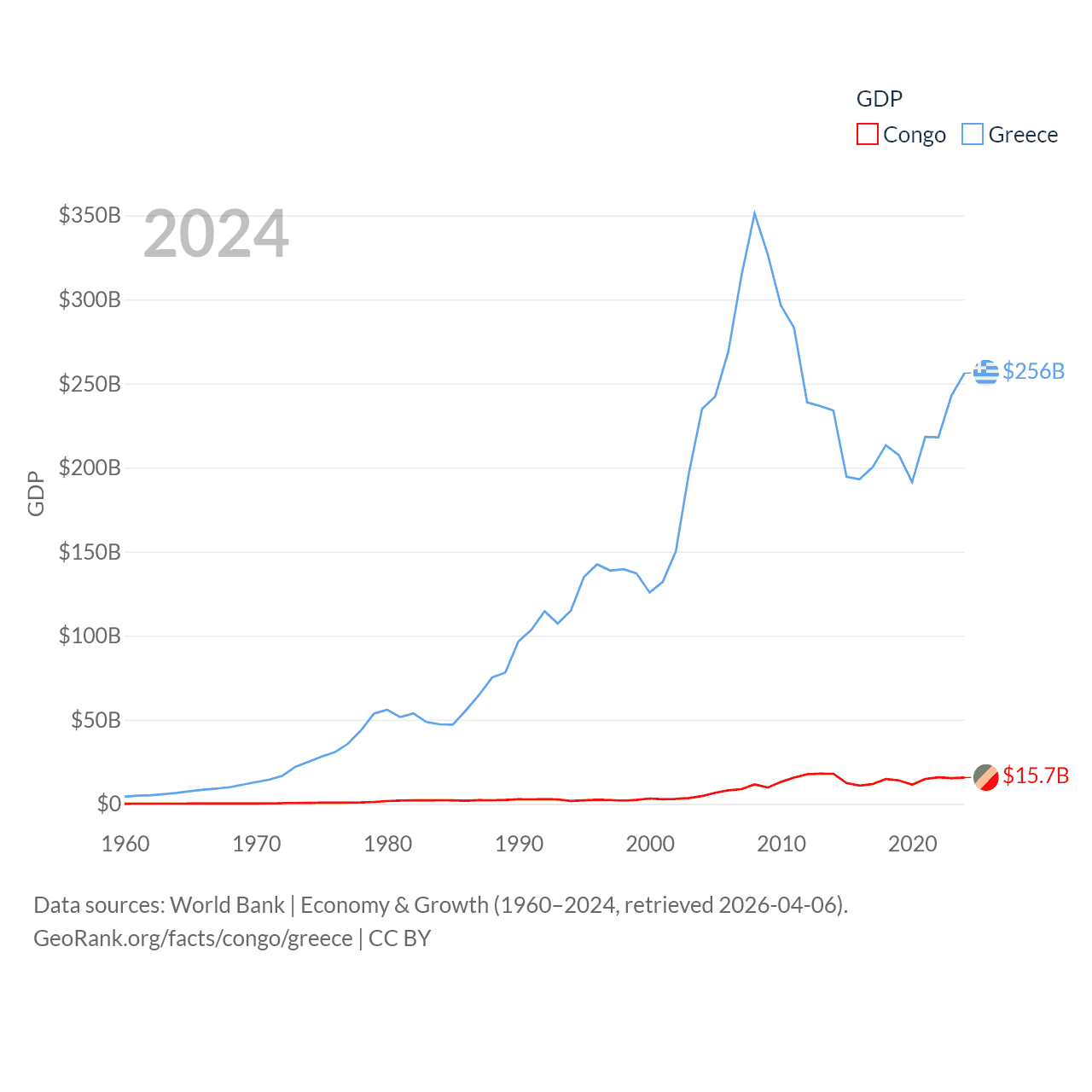 By GDP, The Congo ranks 141/197 ($15.7B) and Greece ranks 53/197 ($256B). By GDP per capita, The Congo ranks 149/197 ($2,482), while Greece ranks 49/197 ($24,626).