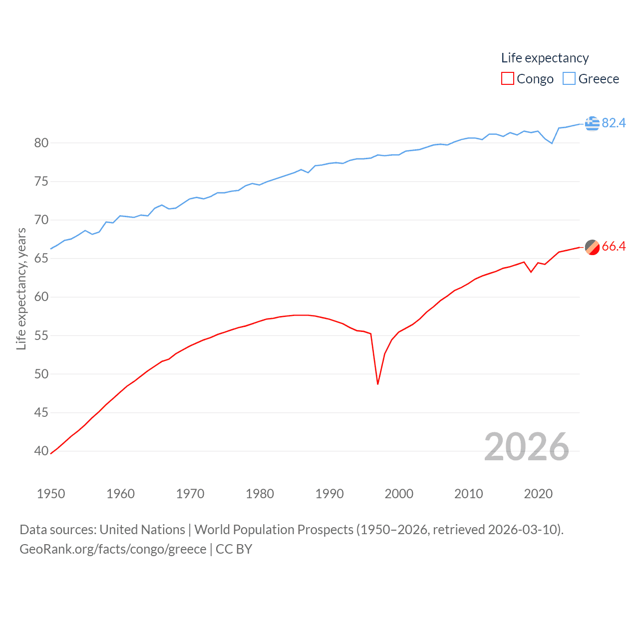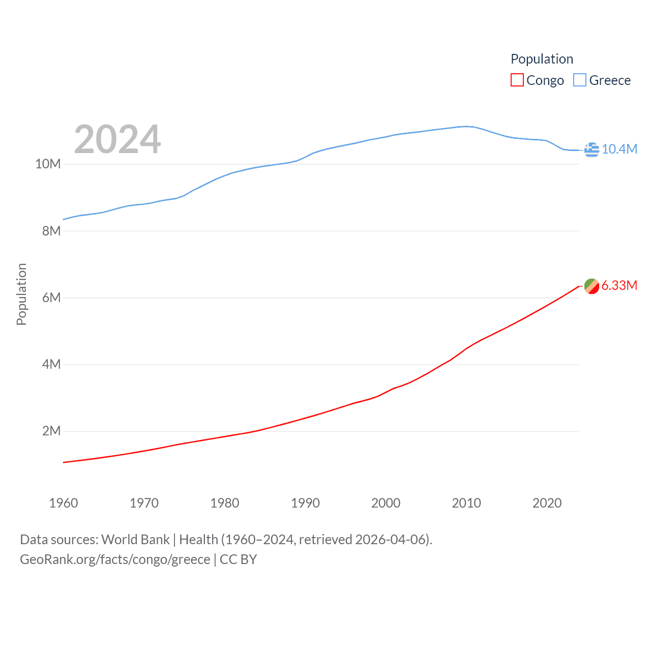 The Congo has a population of 6.33M (ranked 112/197), compared with 10.4M in Greece (ranked 94/197). The Congo's land area is 131,854 sq mi versus 49,769 sq mi for Greece (ranked 64th vs. 95th).