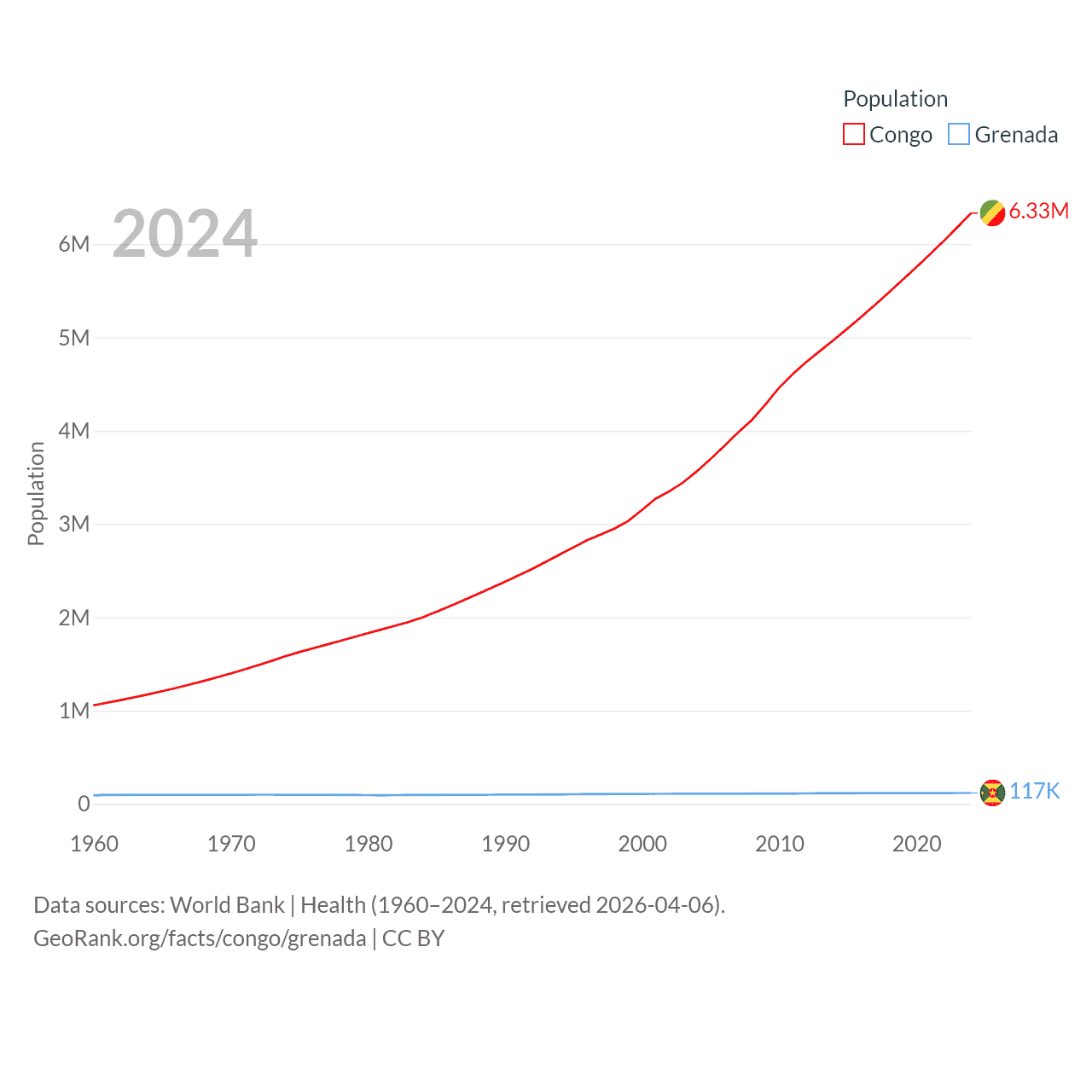 The Congo has a population of 6.33M (ranked 112/197), compared with 117K in Grenada (ranked 182/197). The Congo's land area is 131,854 sq mi versus 131.3 sq mi for Grenada (ranked 64th vs. 186th).