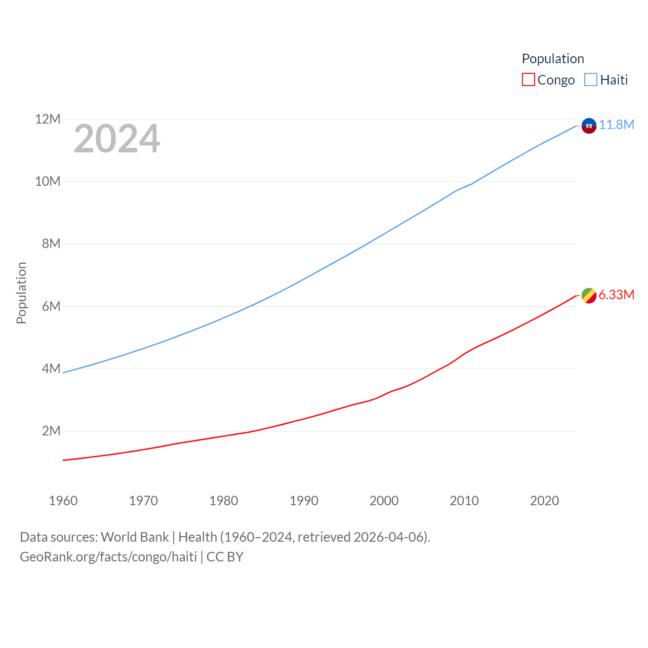 The Congo has a population of 6.33M (ranked 112/197), compared with 11.8M in Haiti (ranked 83/197). The Congo's land area is 131,854 sq mi versus 10,641 sq mi for Haiti (ranked 64th vs. 142nd).