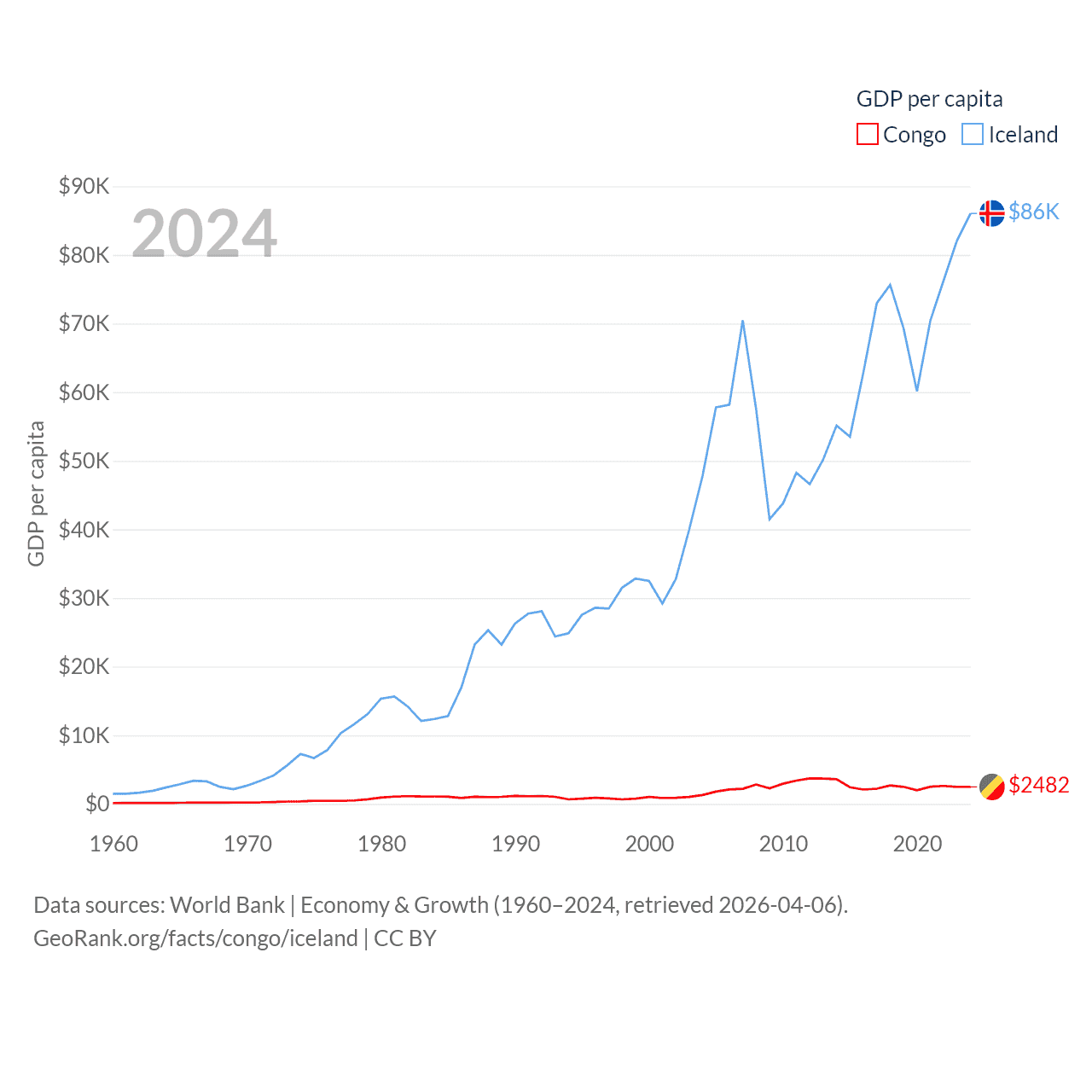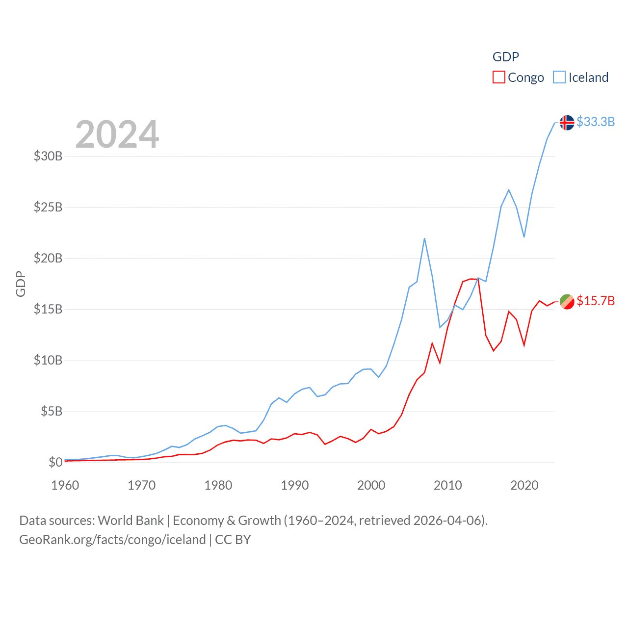 By GDP, The Congo ranks 141/197 ($15.7B) and Iceland ranks 108/197 ($33.3B). By GDP per capita, The Congo ranks 149/197 ($2,482), while Iceland ranks 9/197 ($86,041).