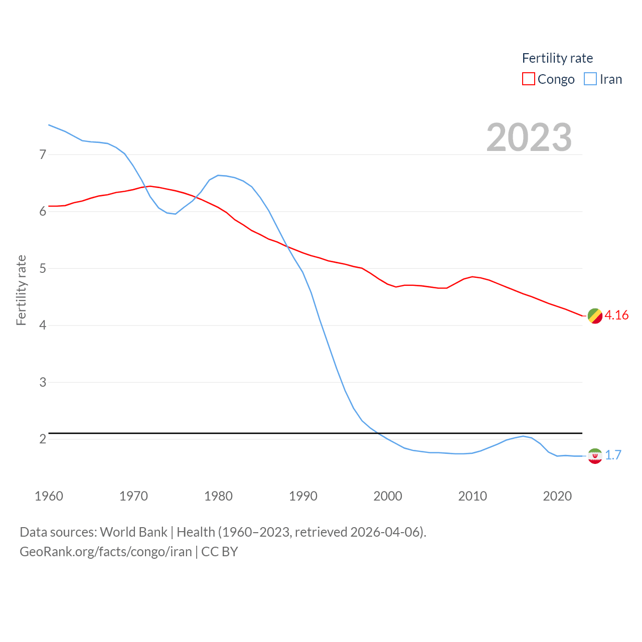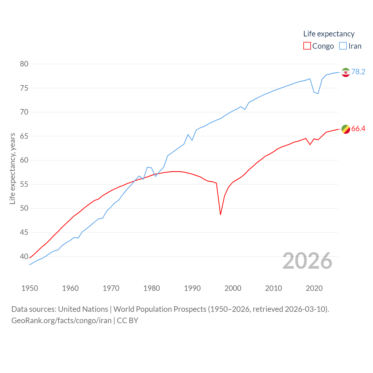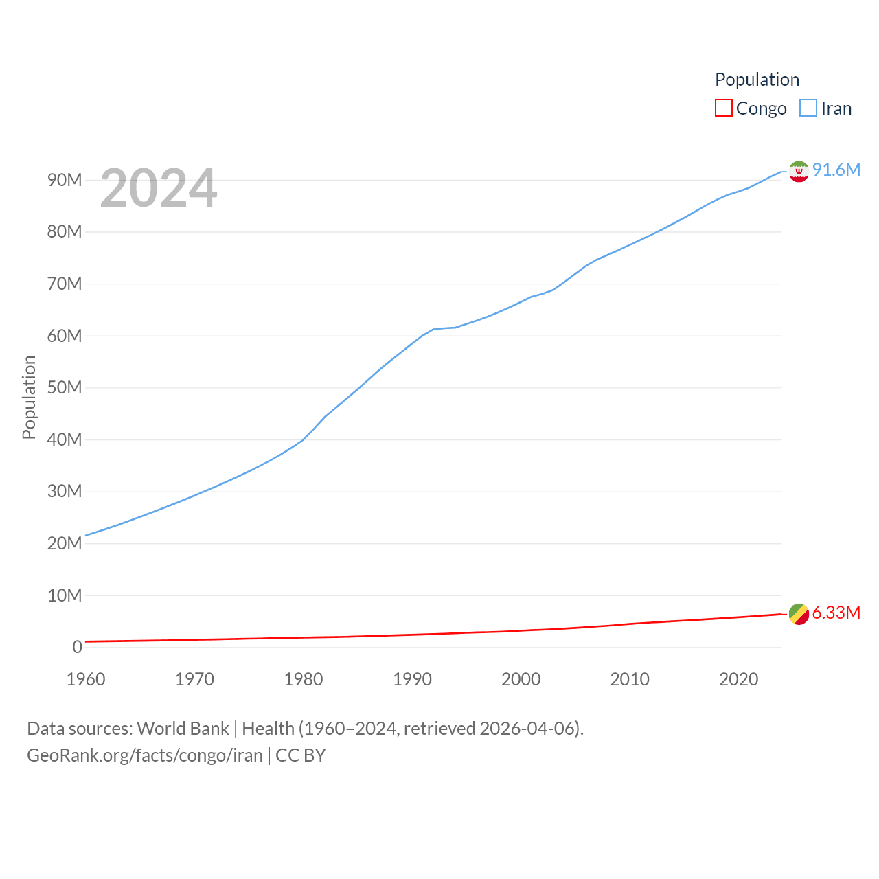 The Congo has a population of 6.33M (ranked 112/197), compared with 91.6M in Iran (ranked 17/197). The Congo's land area is 131,854 sq mi versus 626,451 sq mi for Iran (ranked 64th vs. 17th).