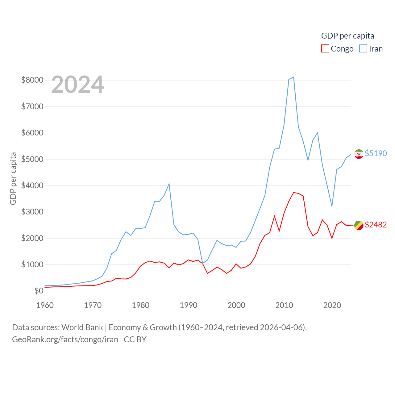 By GDP, The Congo ranks 141/197 ($15.7B) and Iran ranks 34/197 ($475B). By GDP per capita, The Congo ranks 149/197 ($2,482), while Iran ranks 119/197 ($5,190).