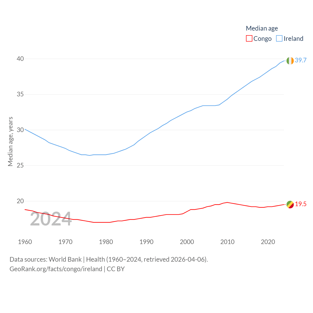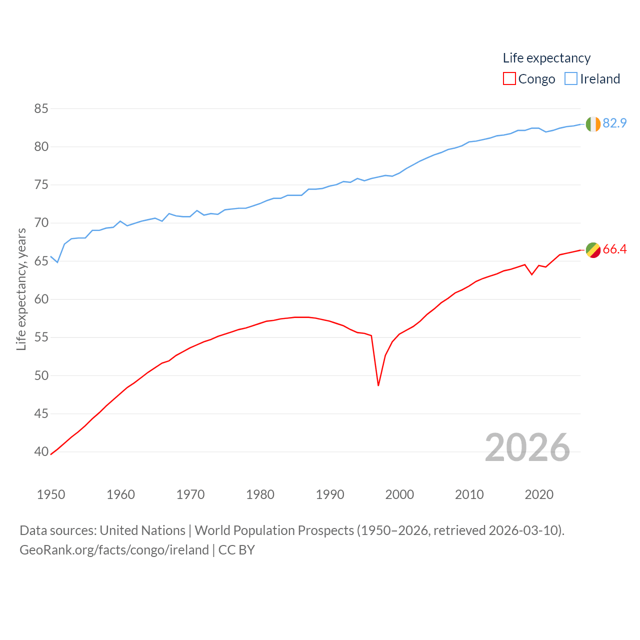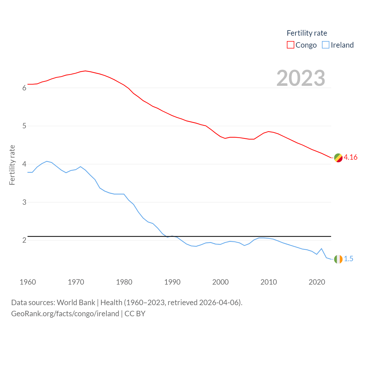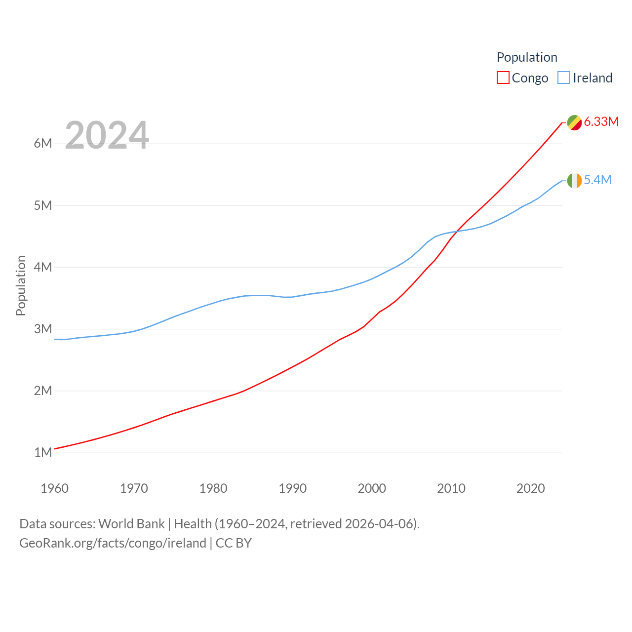 The Congo has a population of 6.33M (ranked 112/197), compared with 5.4M in Ireland (ranked 120/197). The Congo's land area is 131,854 sq mi versus 26,599 sq mi for Ireland (ranked 64th vs. 119th).