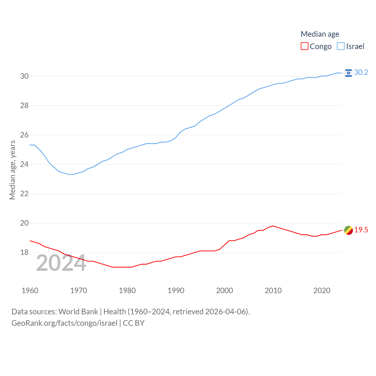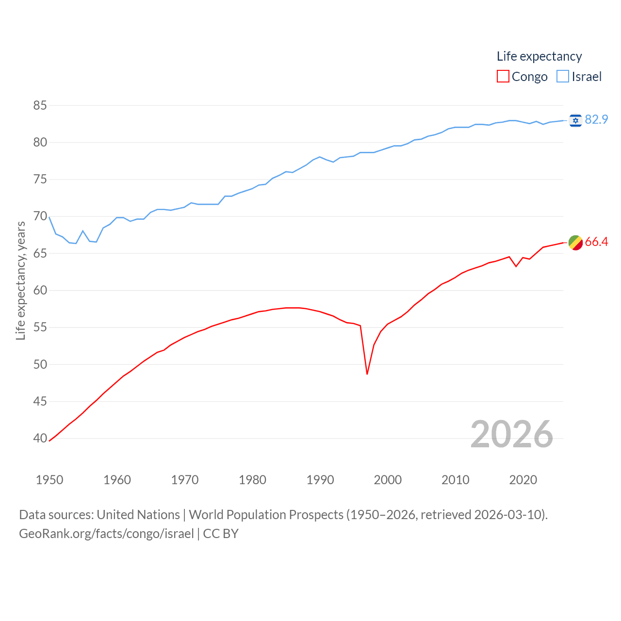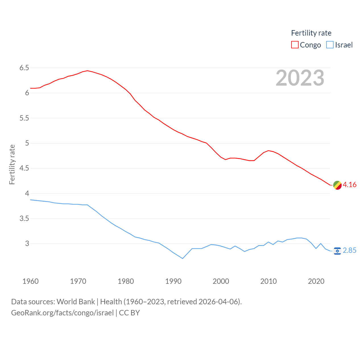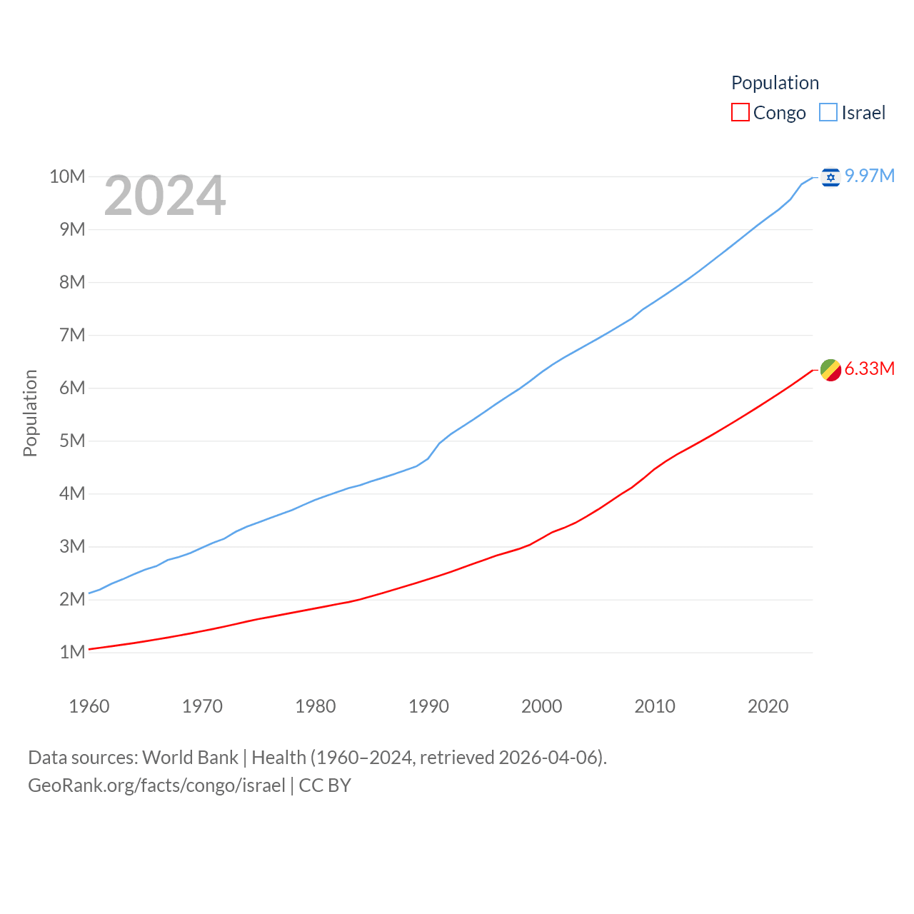 The Congo has a population of 6.33M (ranked 112/197), compared with 9.97M in Israel (ranked 96/197). The Congo's land area is 131,854 sq mi versus 8,355 sq mi for Israel (ranked 64th vs. 149th).