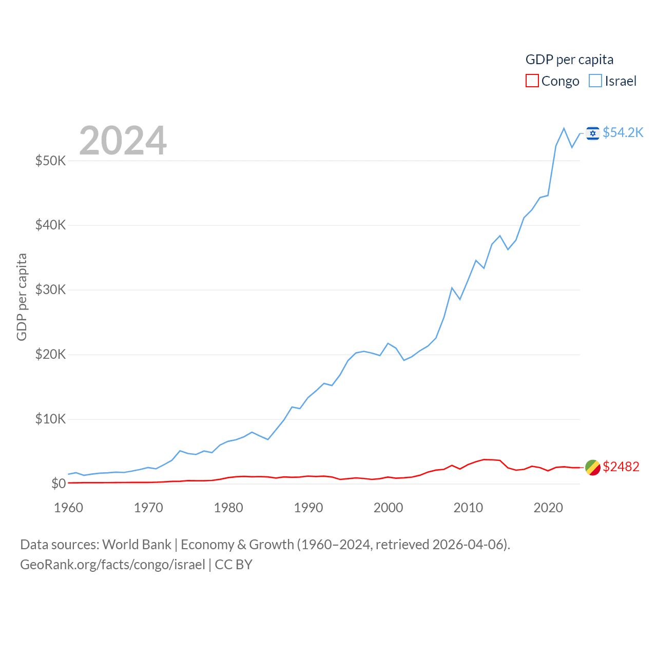By GDP, The Congo ranks 141/197 ($15.7B) and Israel ranks 29/197 ($540B). By GDP per capita, The Congo ranks 149/197 ($2,482), while Israel ranks 21/197 ($54,177).