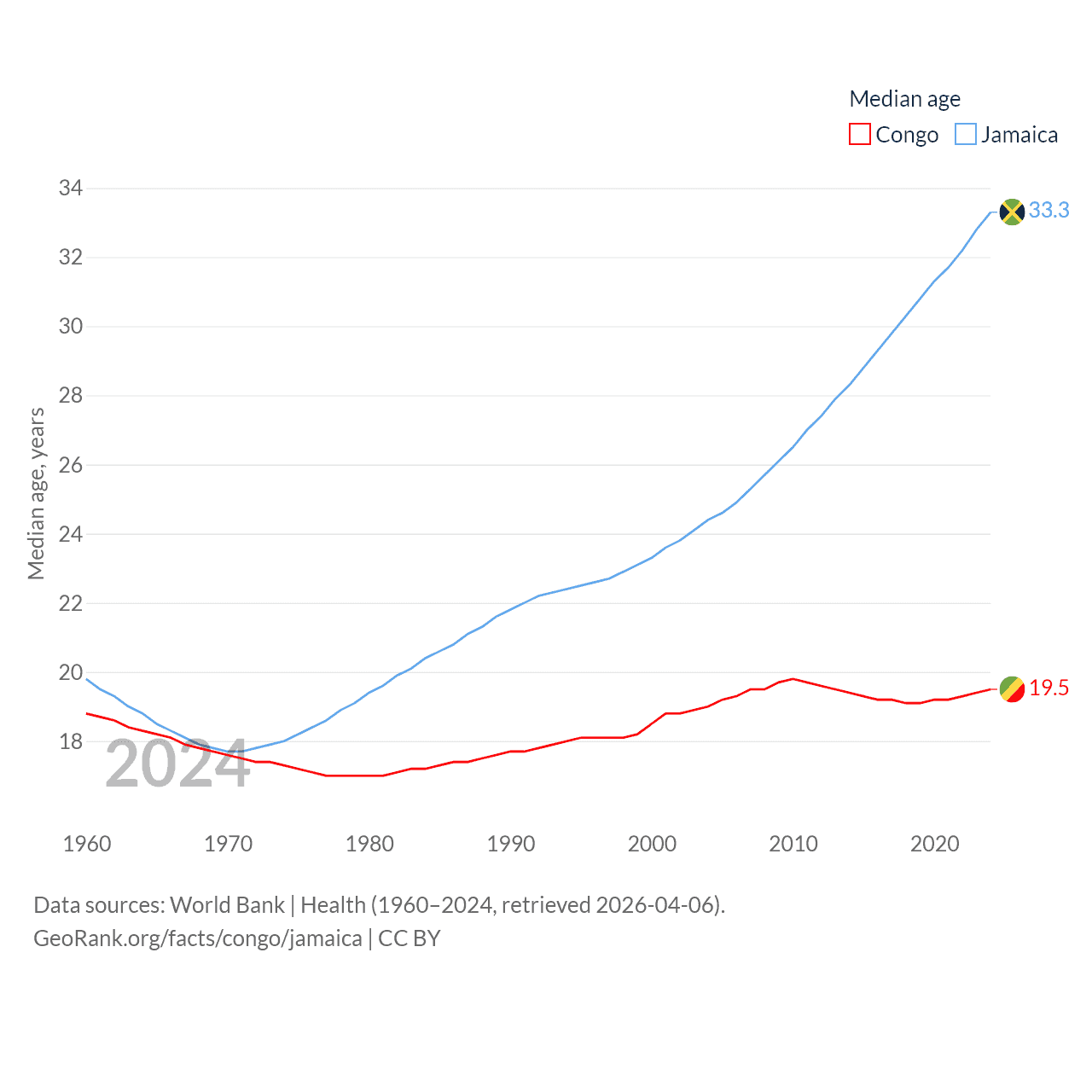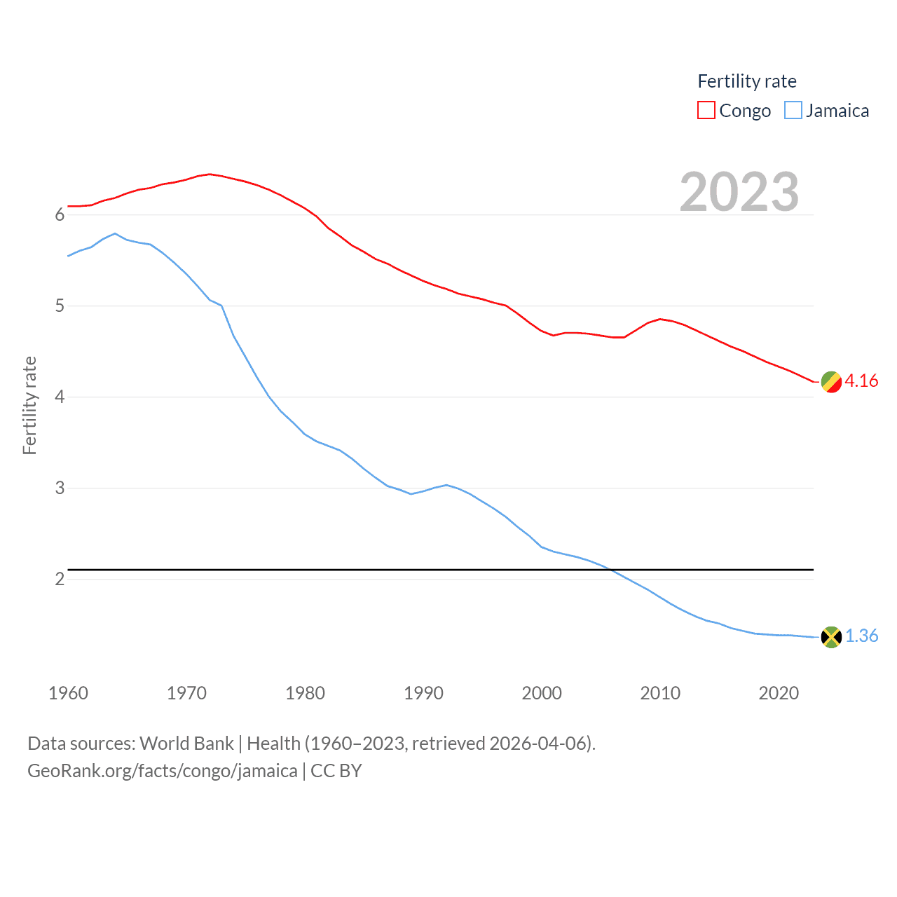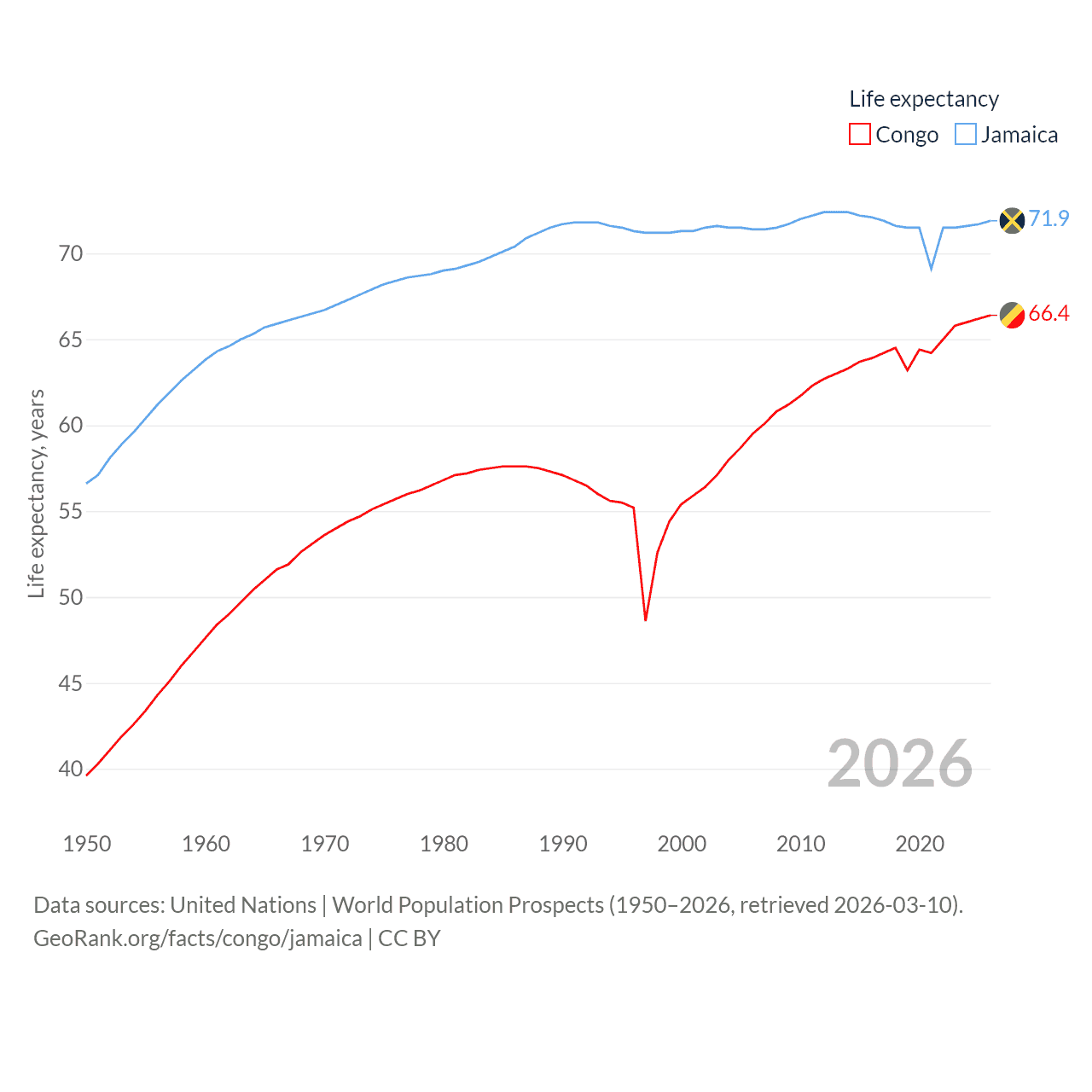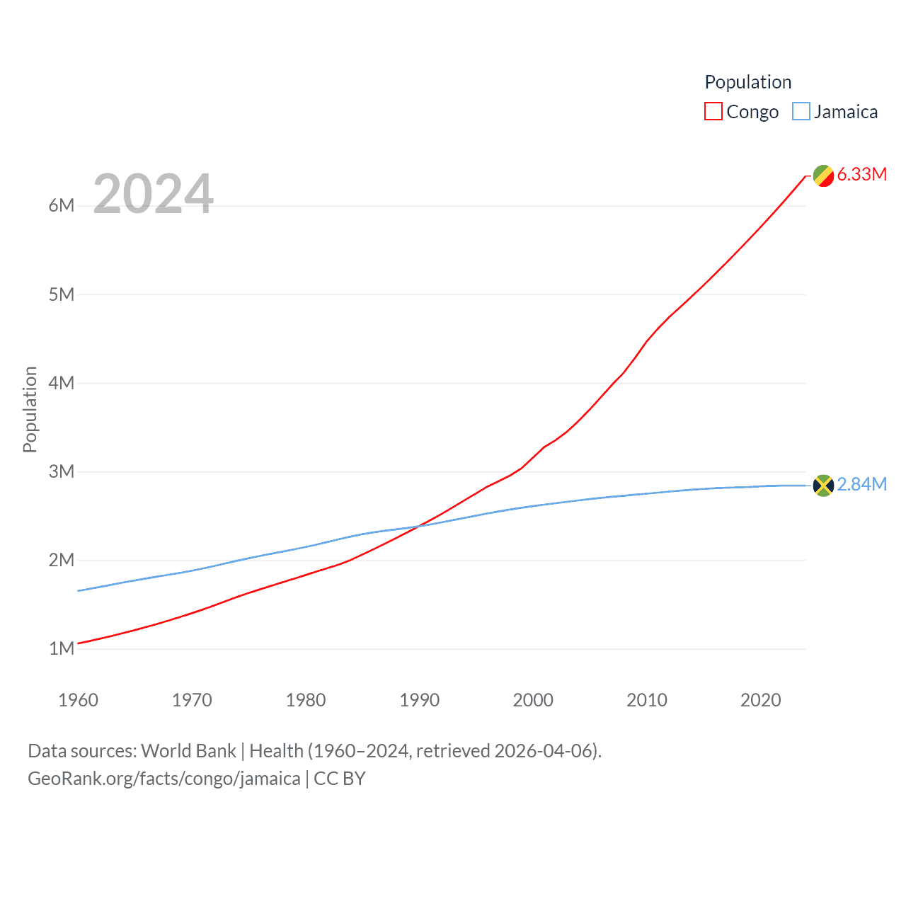 The Congo has a population of 6.33M (ranked 112/197), compared with 2.84M in Jamaica (ranked 139/197). The Congo's land area is 131,854 sq mi versus 4,181 sq mi for Jamaica (ranked 64th vs. 159th).