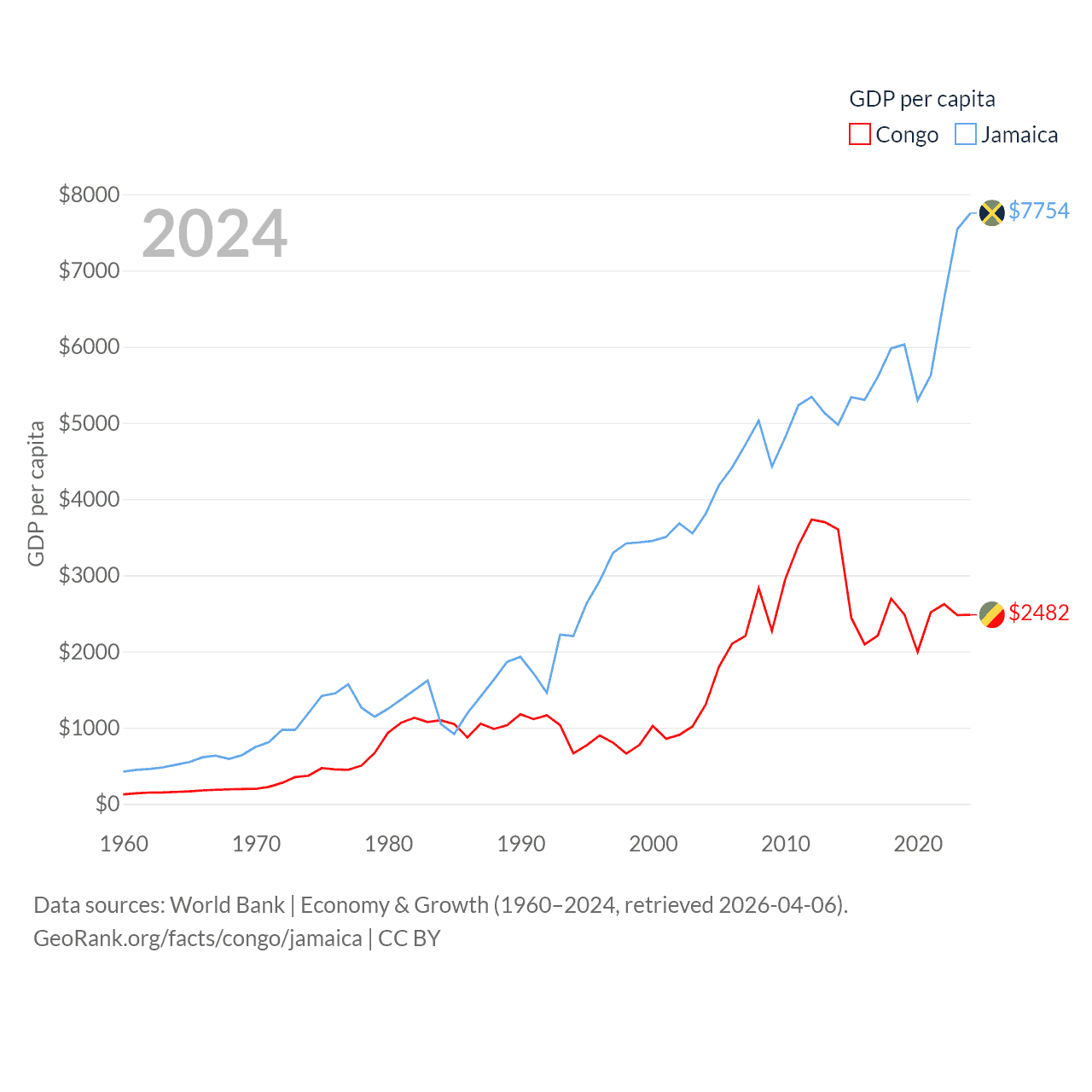 By GDP, The Congo ranks 141/197 ($15.7B) and Jamaica ranks 124/197 ($22B). By GDP per capita, The Congo ranks 149/197 ($2,482), while Jamaica ranks 95/197 ($7,754).