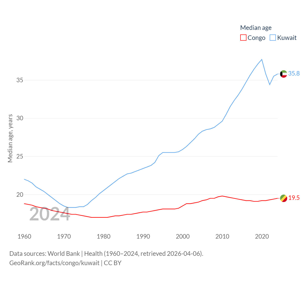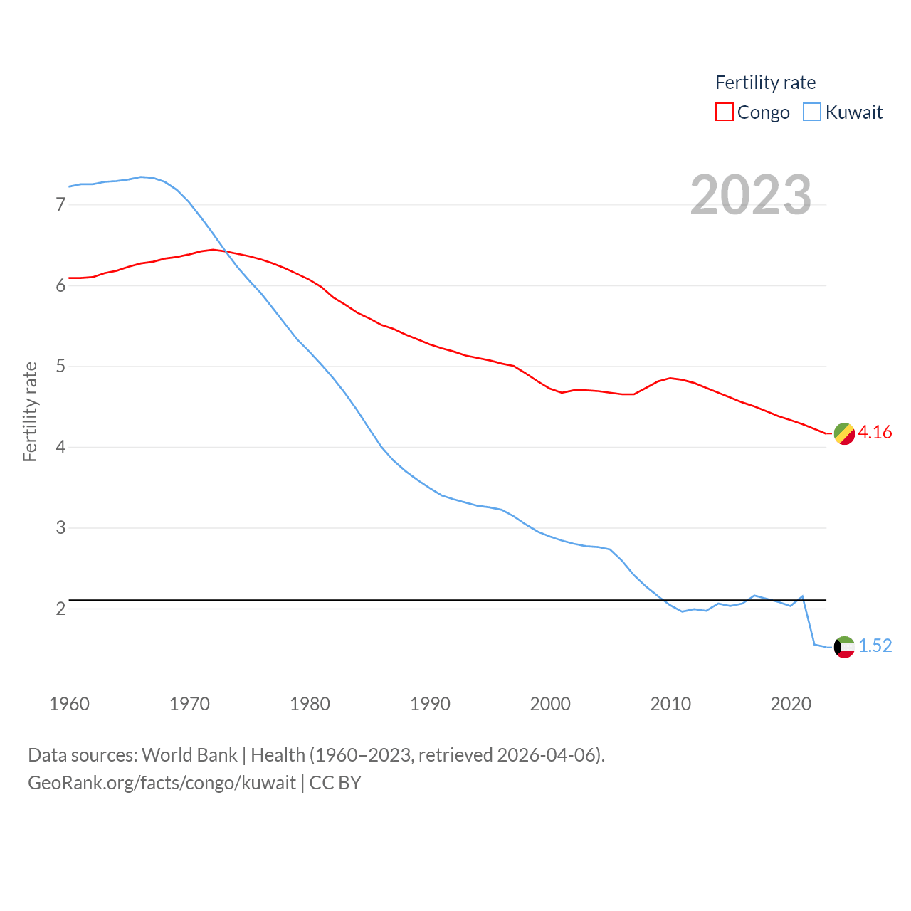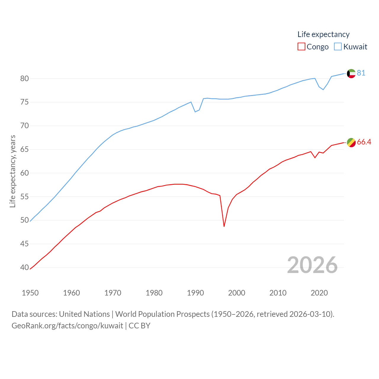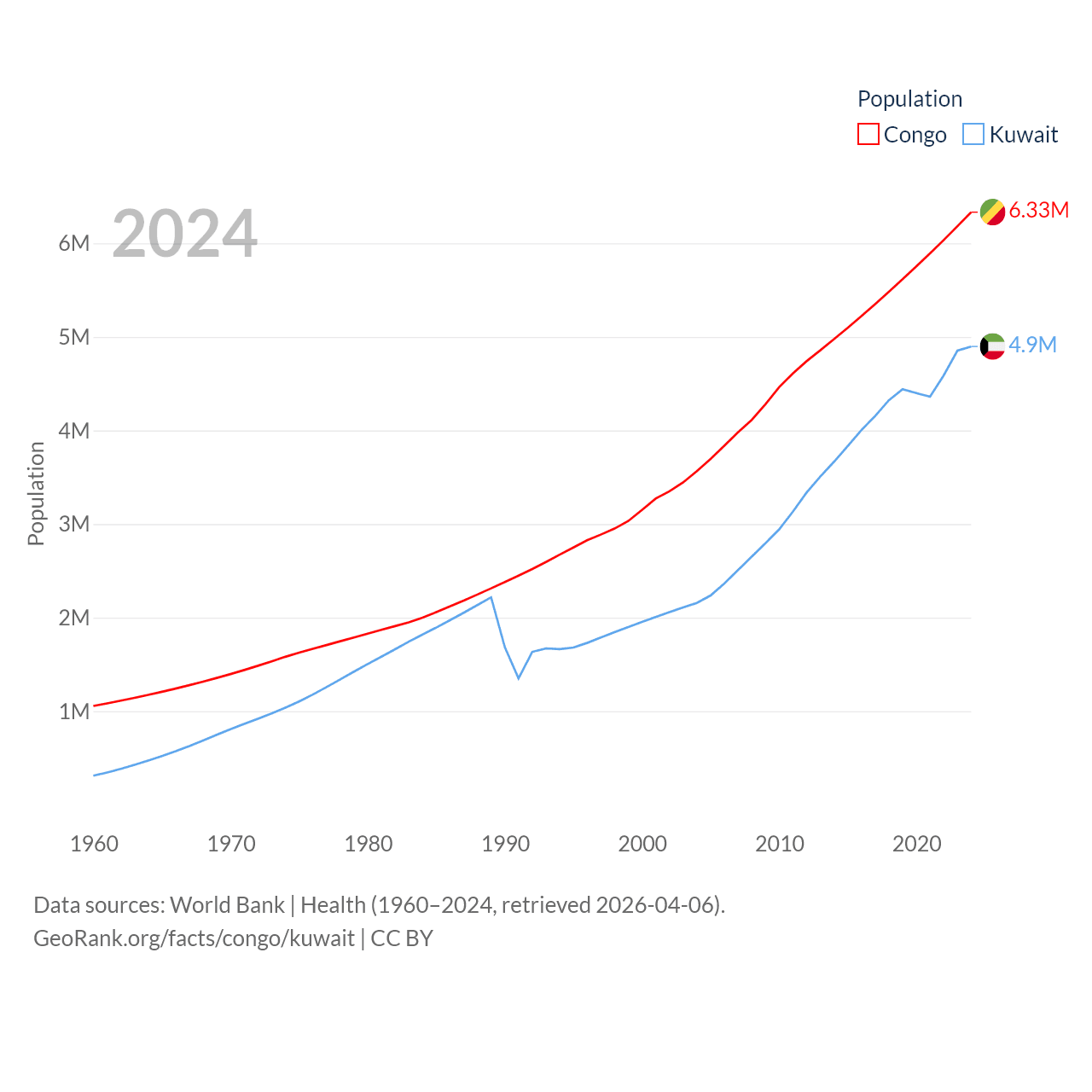 The Congo has a population of 6.33M (ranked 112/197), compared with 4.9M in Kuwait (ranked 127/197). The Congo's land area is 131,854 sq mi versus 6,880 sq mi for Kuwait (ranked 64th vs. 153rd).