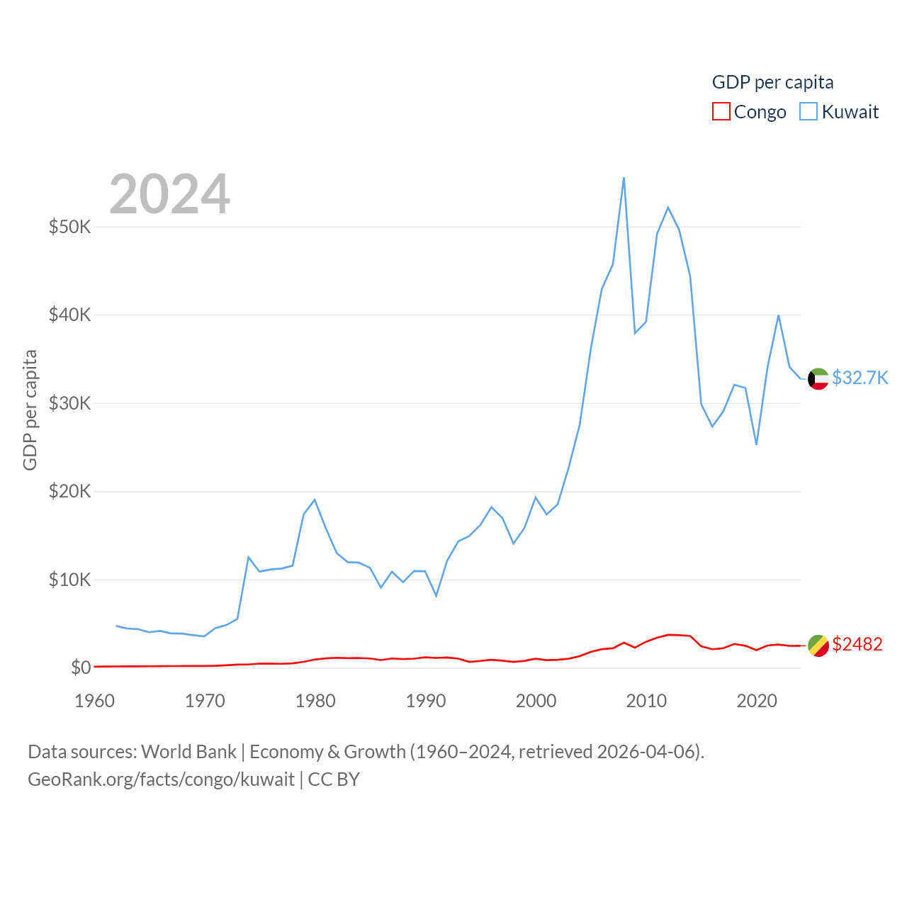 By GDP, The Congo ranks 141/197 ($15.7B) and Kuwait ranks 59/197 ($160B). By GDP per capita, The Congo ranks 149/197 ($2,482), while Kuwait ranks 37/197 ($32,718).